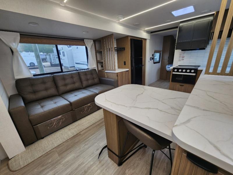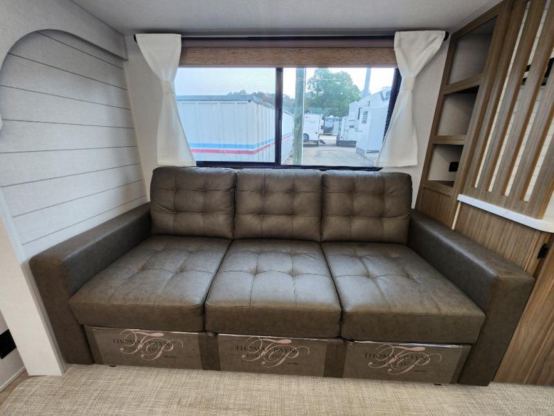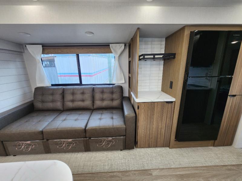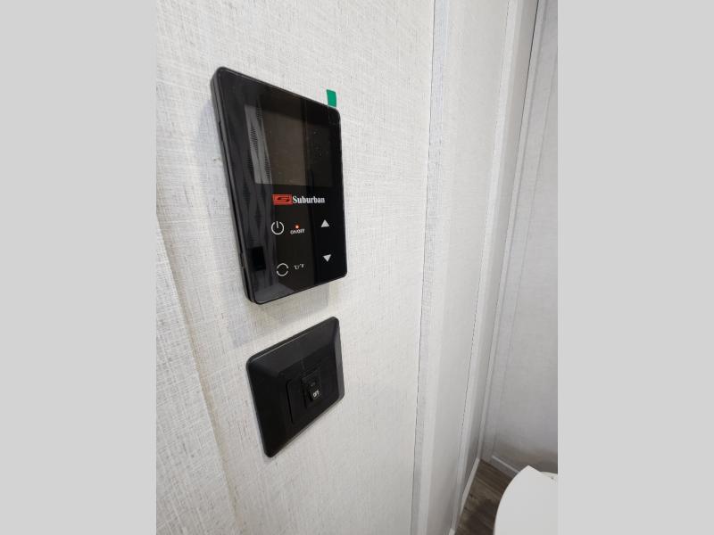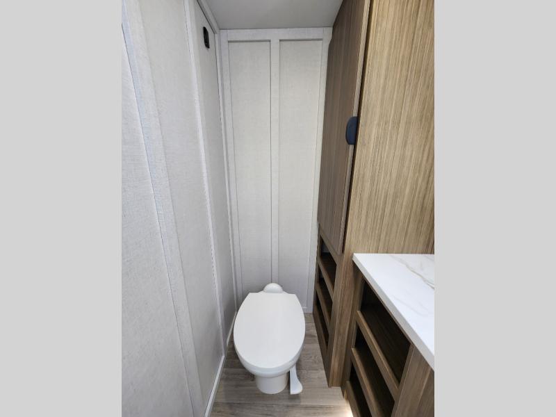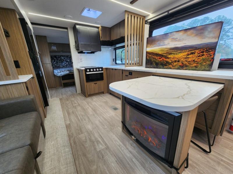 You can enjoy at-home comforts wherever you decide to camp in this travel trailer. The custom king bed with Versa Tilt includes dual shelves and a wardrobe so you can keep your space tidy. If you have a guest or two little ones, they can sleep on the jackknife sofa within the large slide out. Once you've made breakfast in the fully equipped kitchen, you can utilize the pull-out table to dine at. There is also a fireplace below the table, which will be perfect for cozy evenings indoors. And don't overlook the full rear bath, complete with a spacious shower, a toilet, bath shelves, and ample counter space!