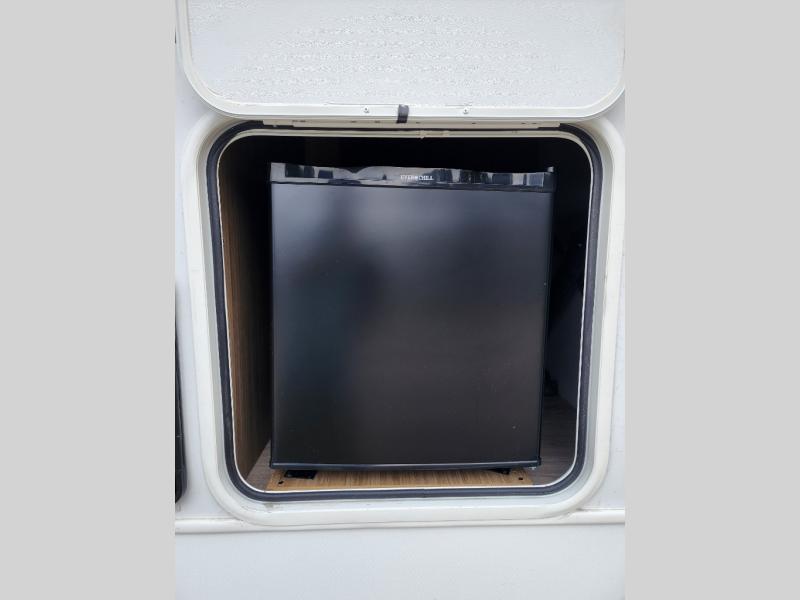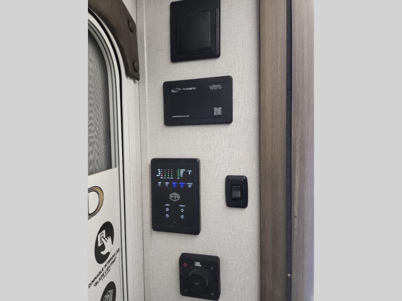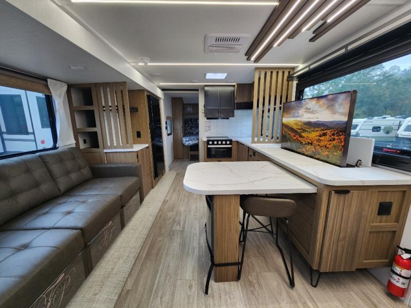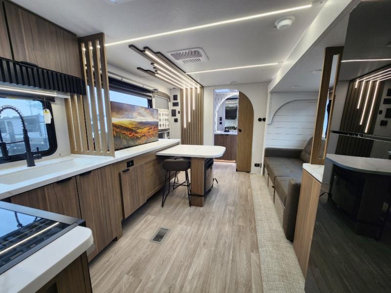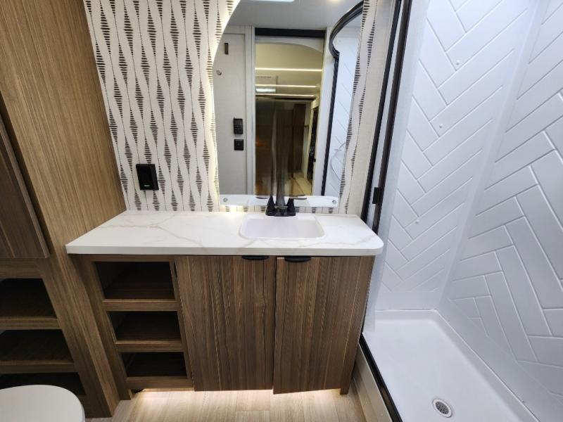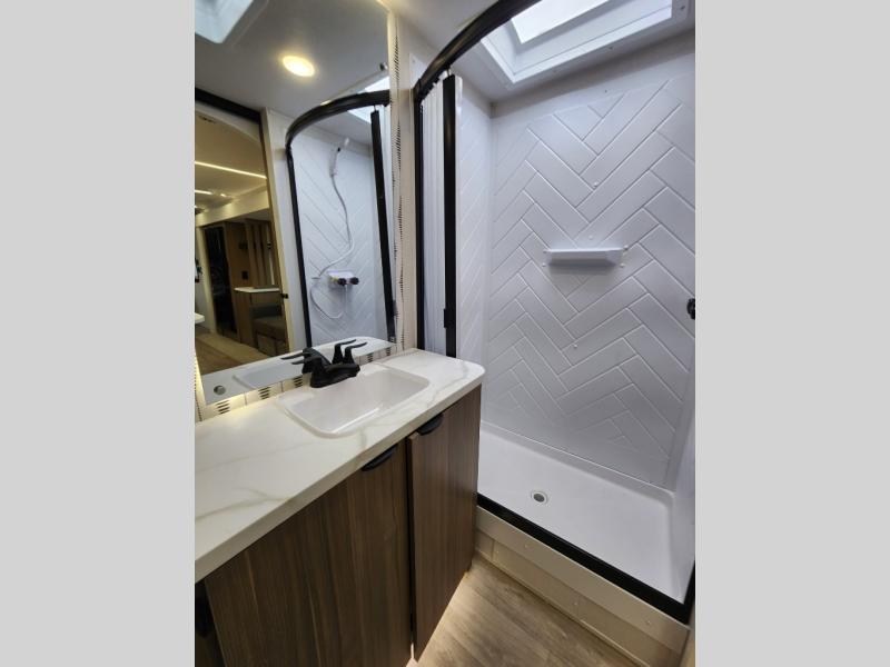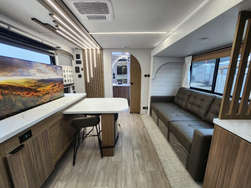You can enjoy at-home comforts wherever you decide to camp in this travel trailer. The custom king bed with Versa Tilt includes dual shelves and a wardrobe so you can keep your space tidy. If you have a guest or two little ones, they can sleep on the jackknife sofa within the large slide out. Once you've made breakfast in the fully equipped kitchen, you can utilize the pull-out table to dine at. There is also a fireplace below the table, which will be perfect for cozy evenings indoors. And don't overlook the full rear bath, complete with a spacious shower, a toilet, bath shelves, and ample counter space!