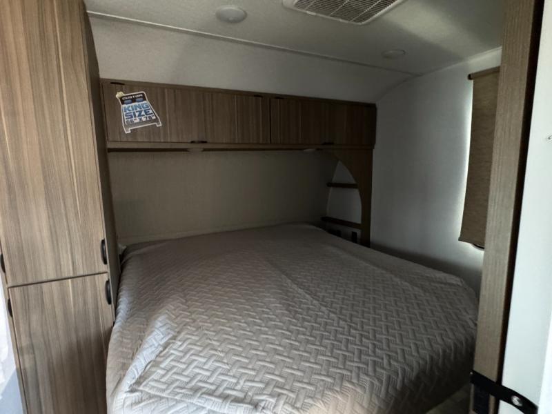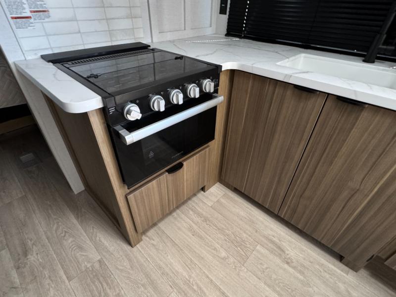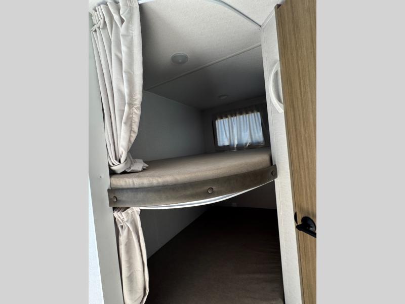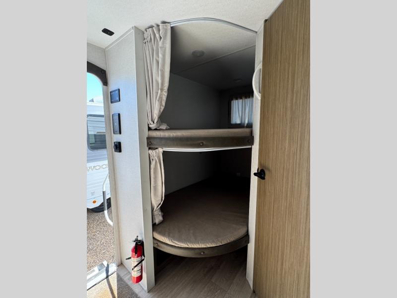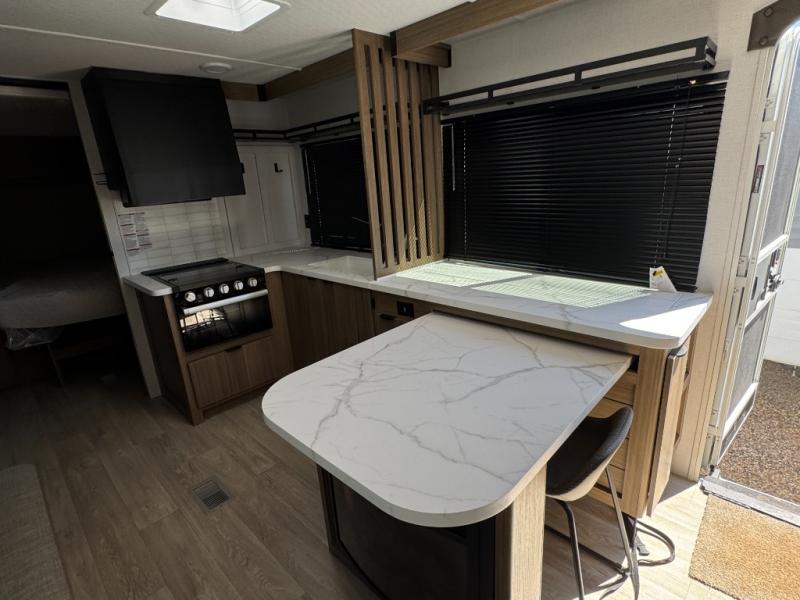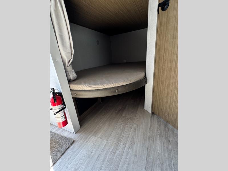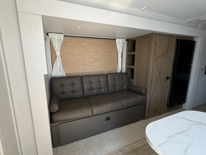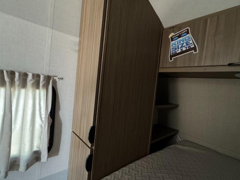 You can enjoy at-home comforts wherever you decide to camp in this travel trailer. The custom king bed with Versa Tilt includes dual shelves and a wardrobe so you can keep your space tidy. If you have a guest or two little ones, they can sleep on the jackknife sofa within the large slide out or on the double-size bunks right next to the full bath. Once you've made breakfast in the fully equipped kitchen, you can utilize the pull-out table to dine at. There is also a fireplace below the table, which will be perfect for cozy evenings indoors.