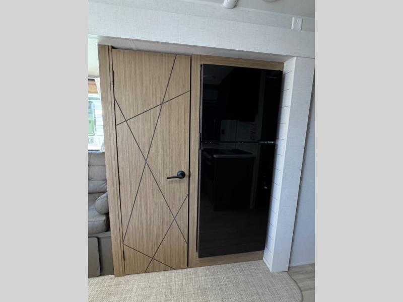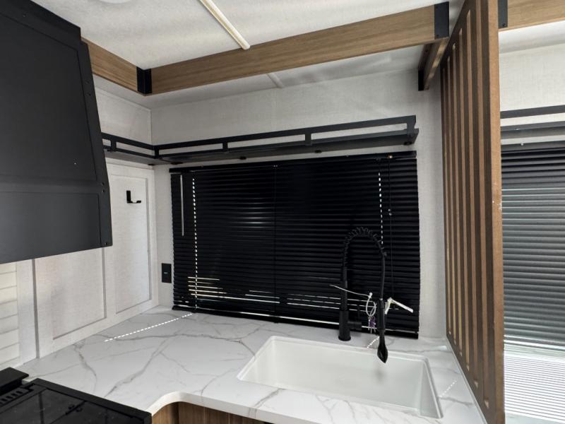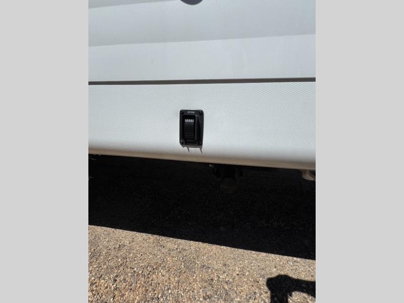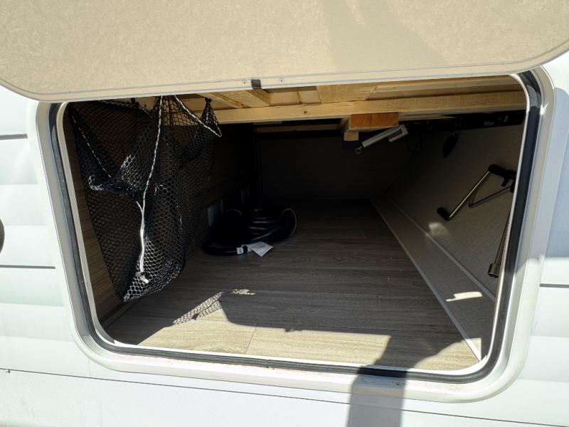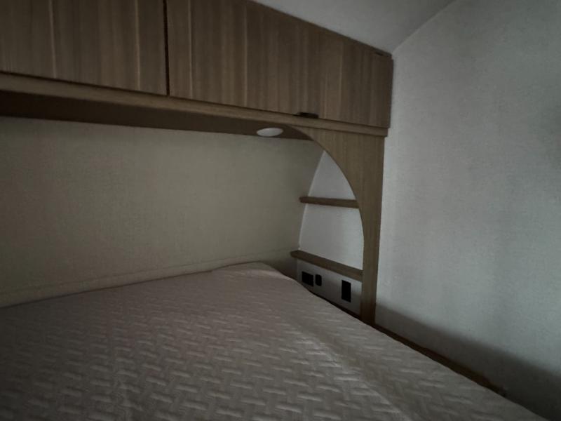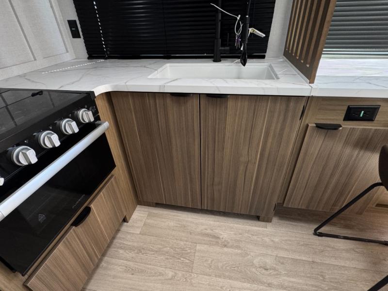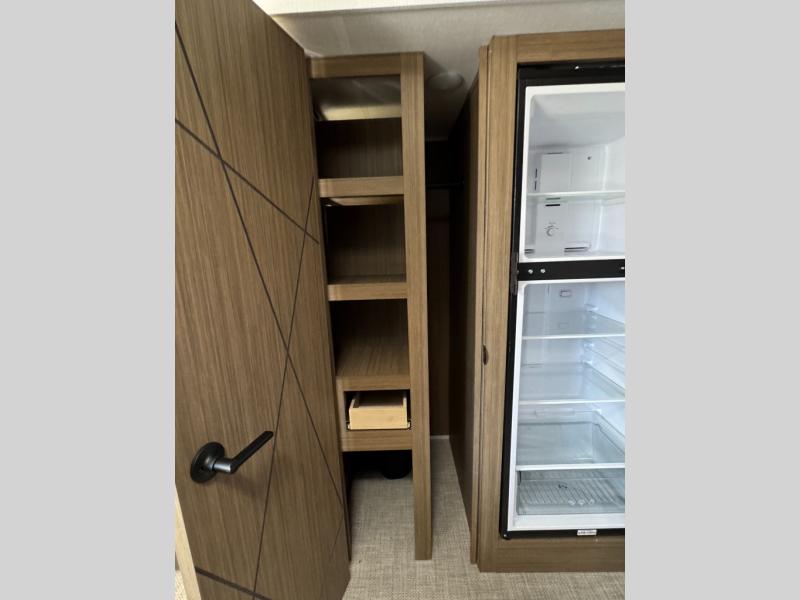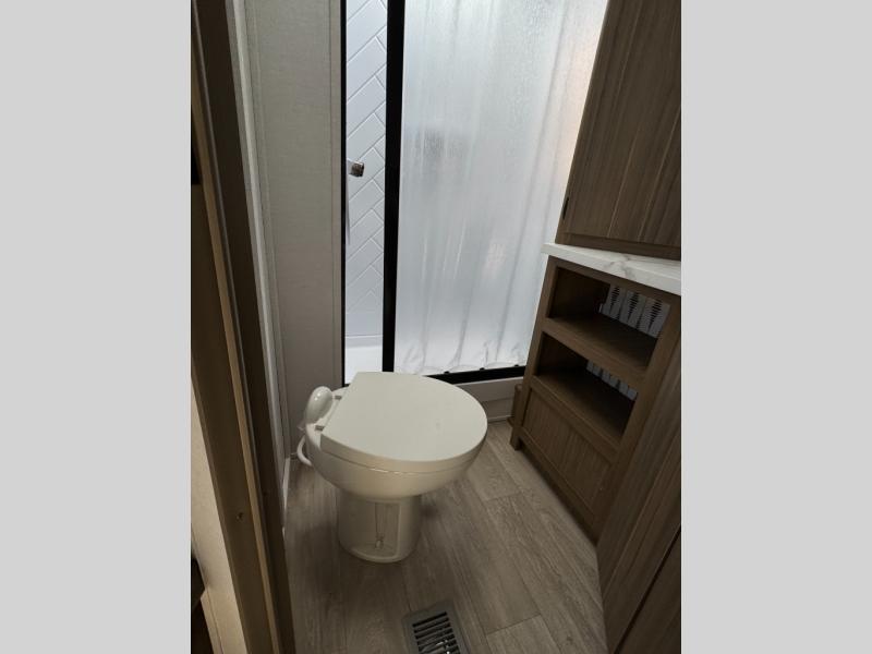 You can enjoy at-home comforts wherever you decide to camp in this travel trailer. The custom king bed with Versa Tilt includes dual shelves and a wardrobe so you can keep your space tidy. If you have a guest or two little ones, they can sleep on the jackknife sofa within the large slide out or on the double-size bunks right next to the full bath. Once you've made breakfast in the fully equipped kitchen, you can utilize the pull-out table to dine at. There is also a fireplace below the table, which will be perfect for cozy evenings indoors.