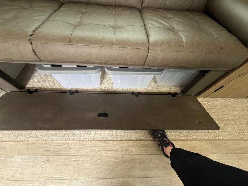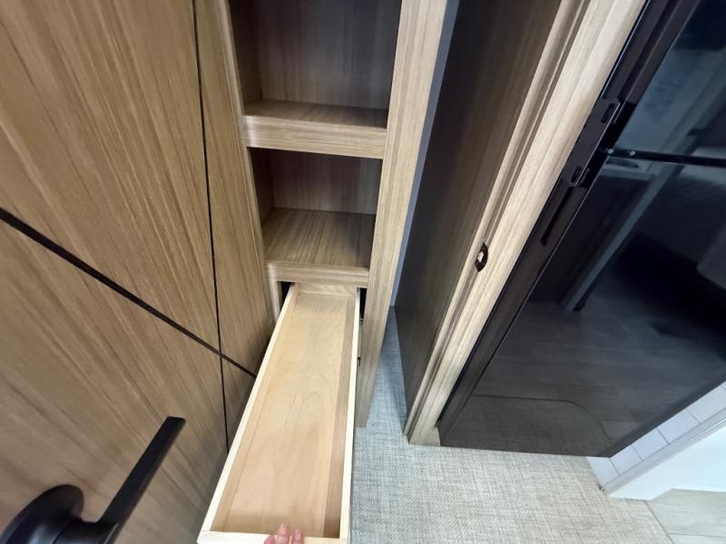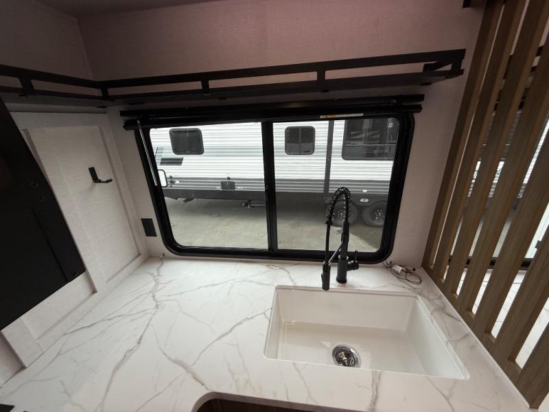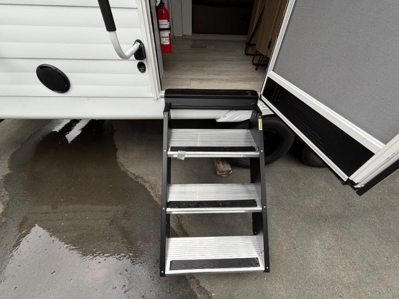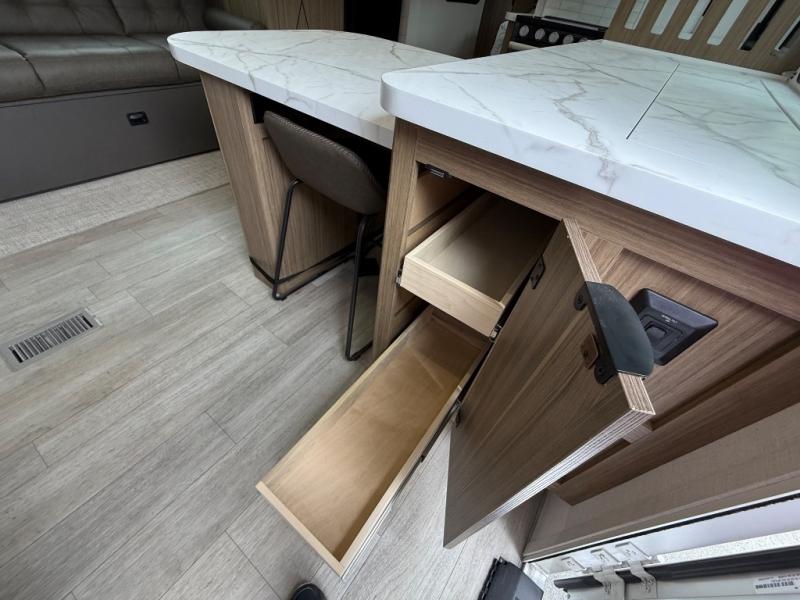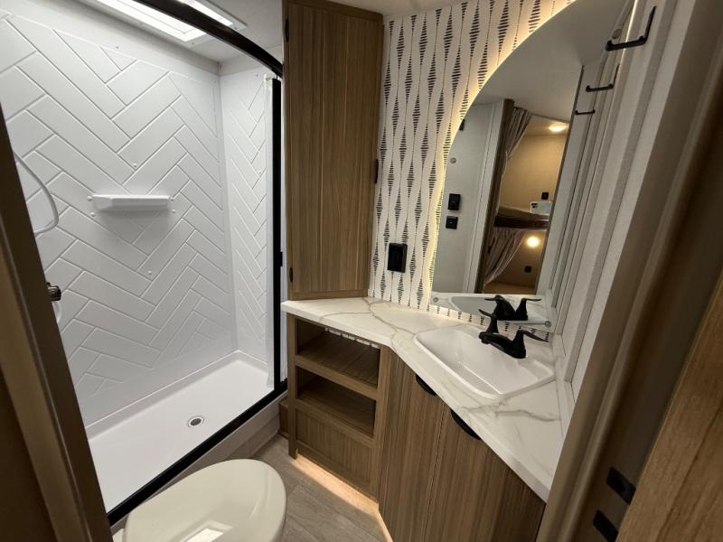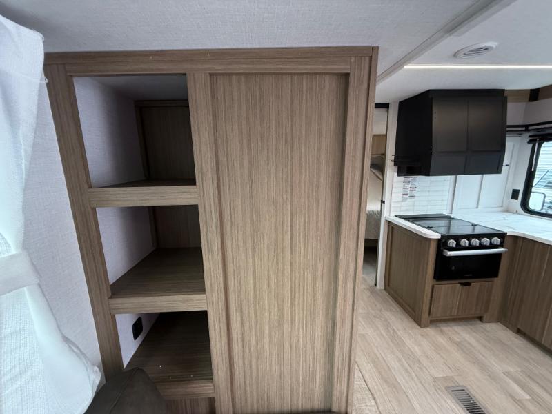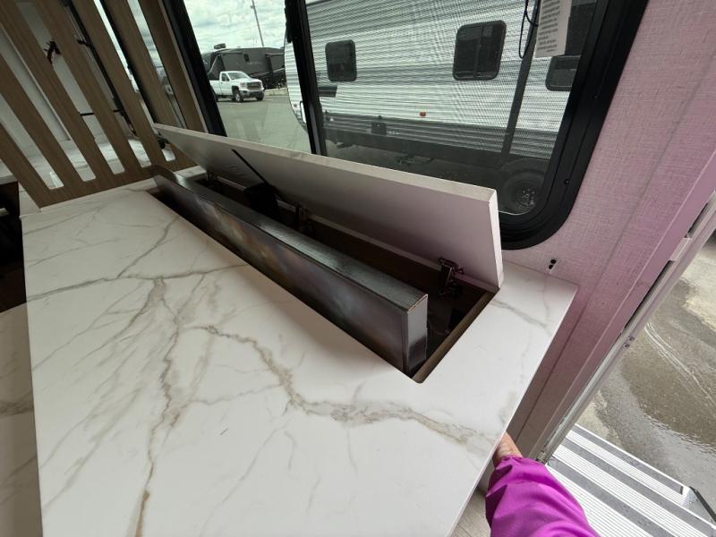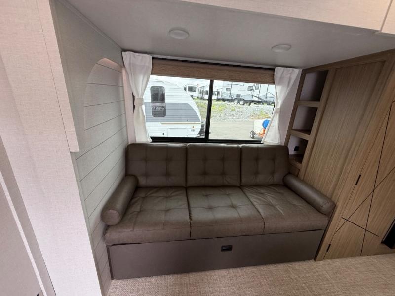 You can enjoy at-home comforts wherever you decide to camp in this travel trailer. The custom king bed with Versa Tilt includes dual shelves and a wardrobe so you can keep your space tidy. If you have a guest or two little ones, they can sleep on the jackknife sofa within the large slide out or on the double-size bunks right next to the full bath. Once you've made breakfast in the fully equipped kitchen, you can utilize the pull-out table to dine at. There is also a fireplace below the table, which will be perfect for cozy evenings indoors.