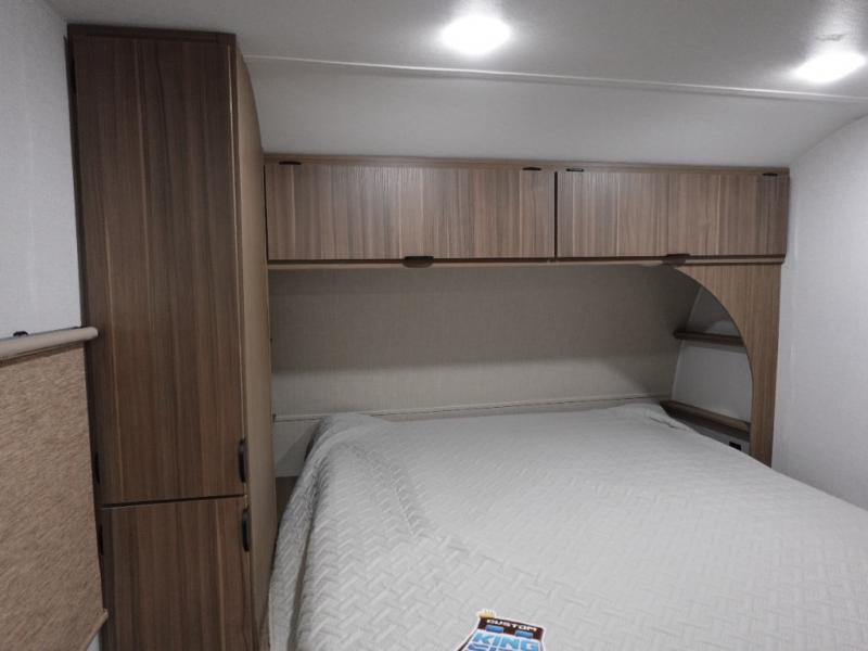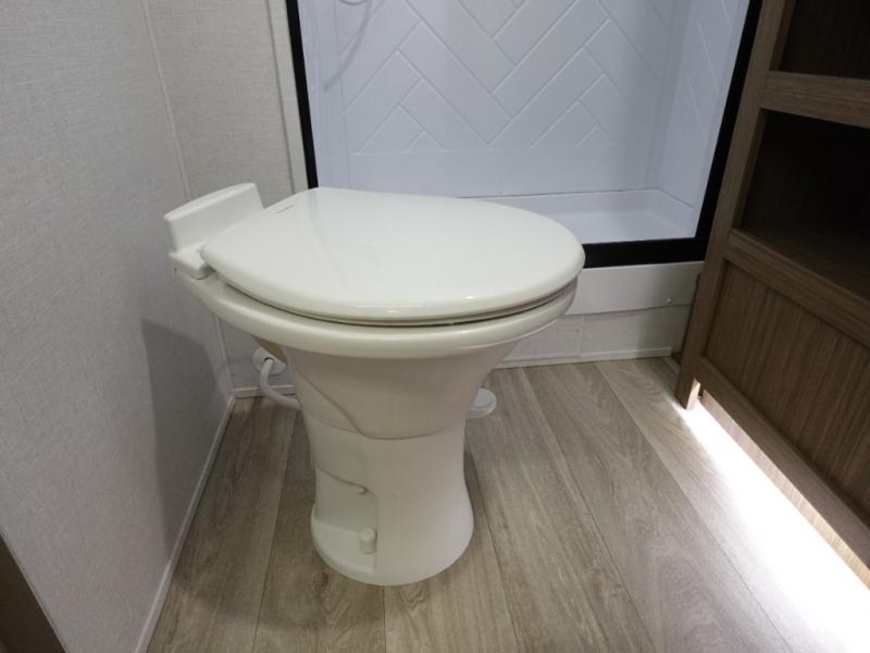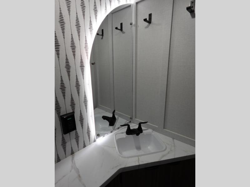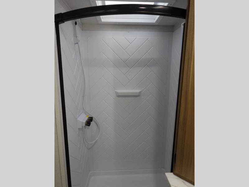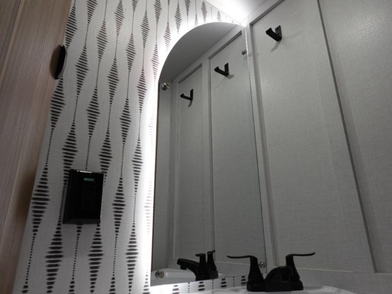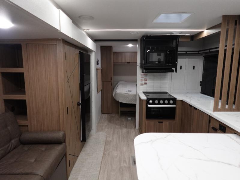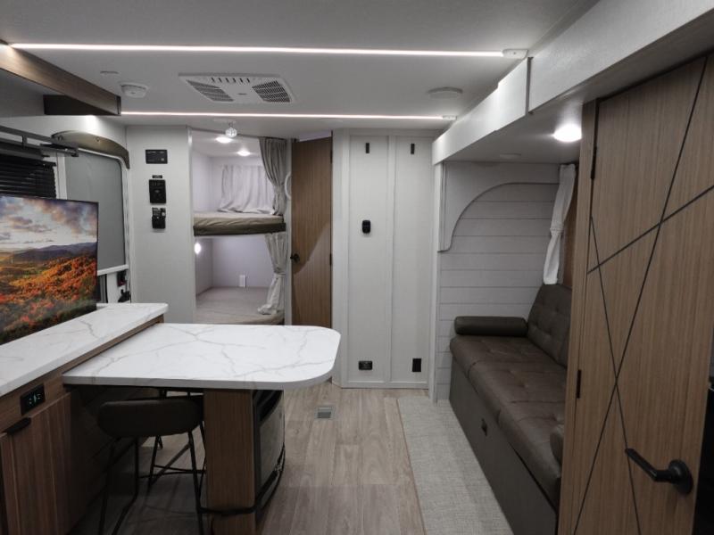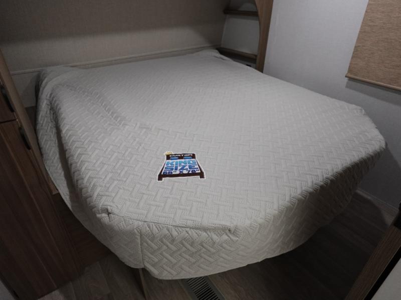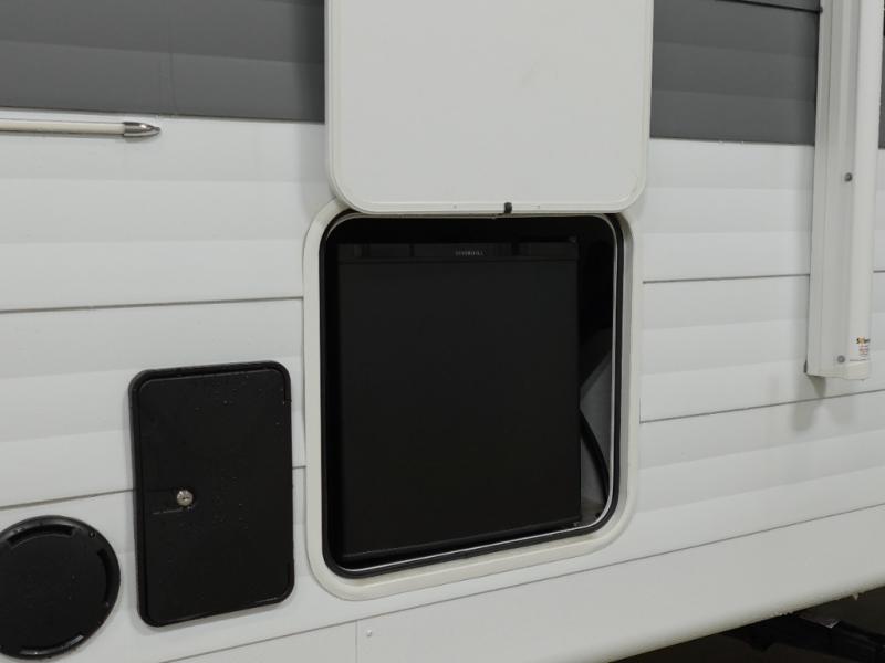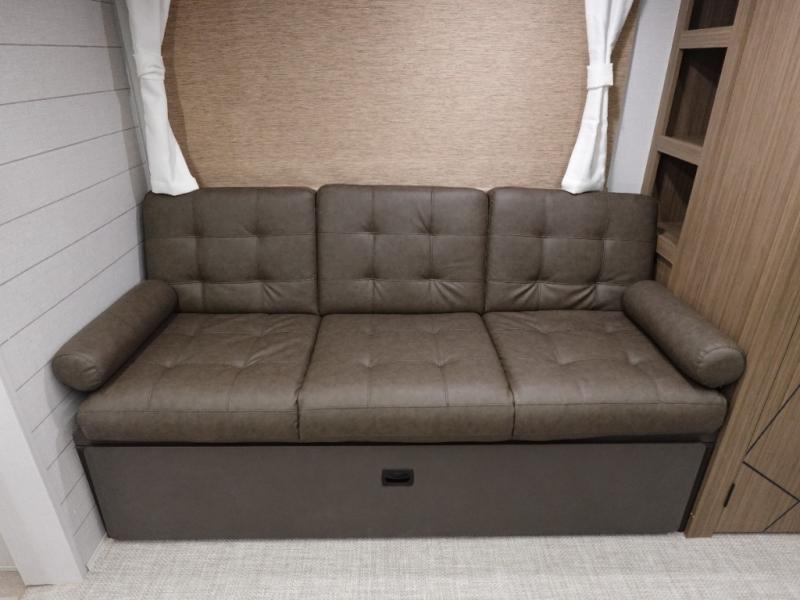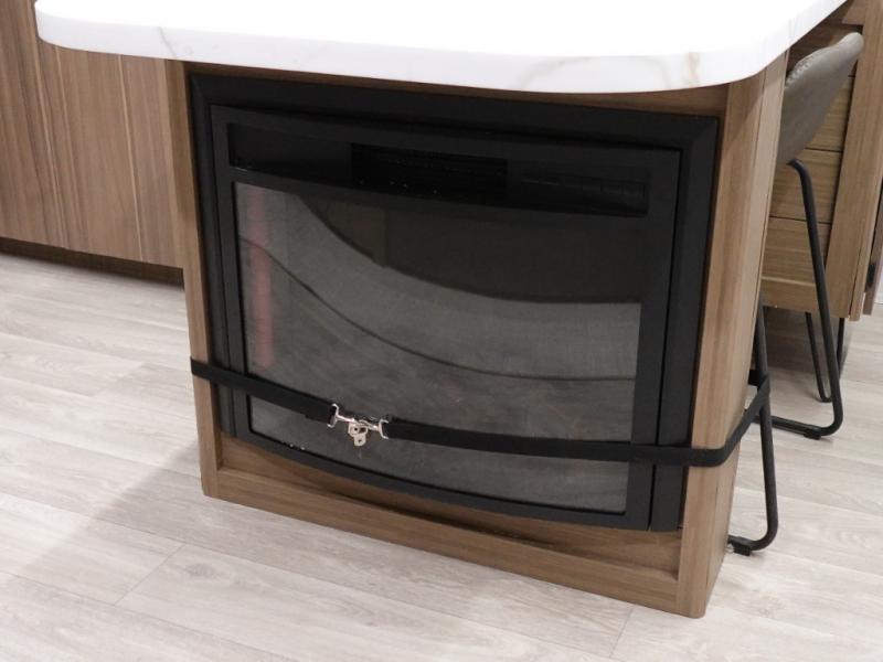 You can enjoy at-home comforts wherever you decide to camp in this travel trailer. The custom king bed with Versa Tilt includes dual shelves and a wardrobe so you can keep your space tidy. If you have a guest or two little ones, they can sleep on the jackknife sofa within the large slide out or on the double-size bunks right next to the full bath. Once you've made breakfast in the fully equipped kitchen, you can utilize the pull-out table to dine at. There is also a fireplace below the table, which will be perfect for cozy evenings indoors.