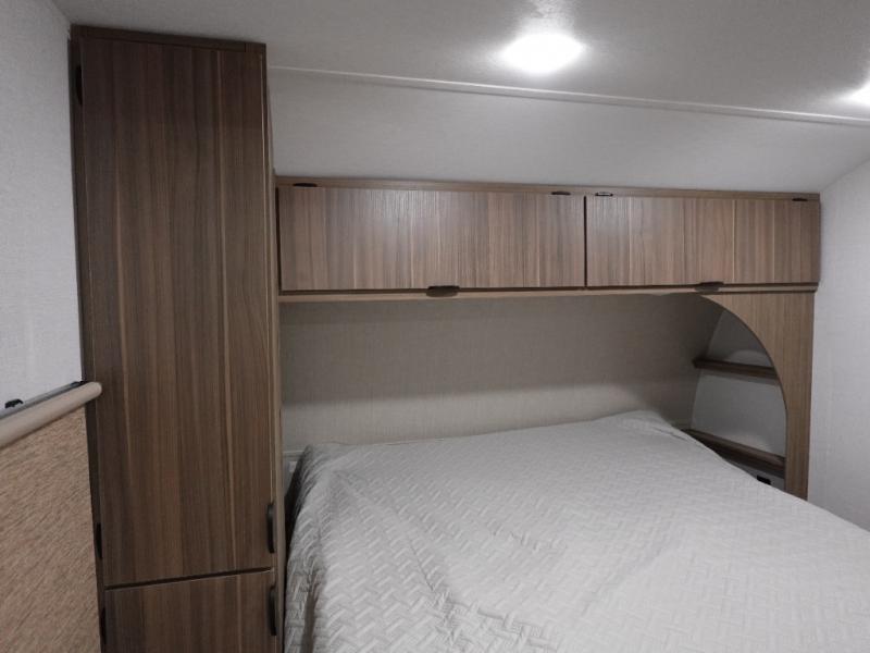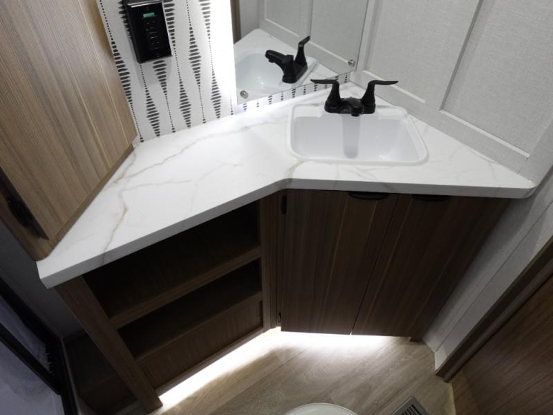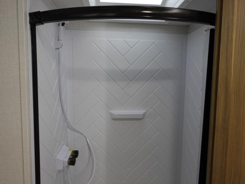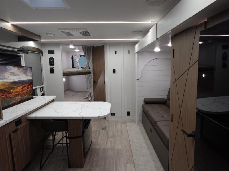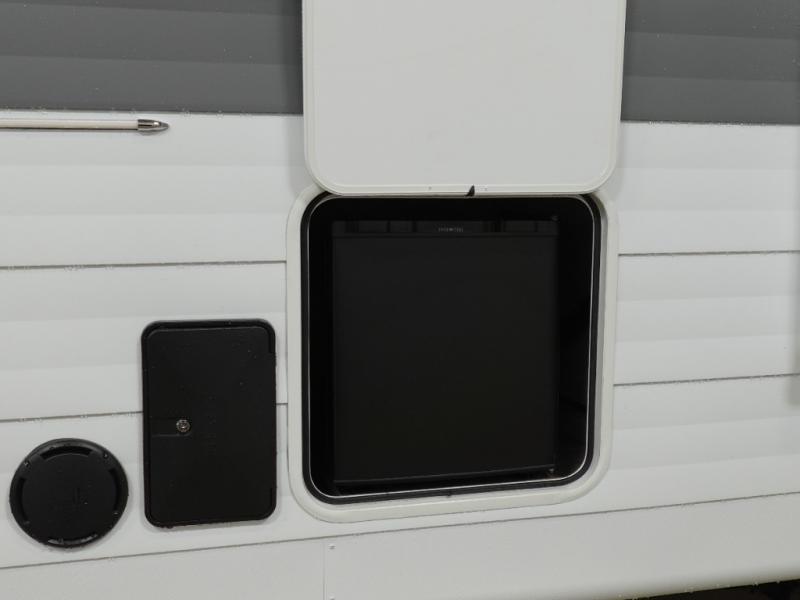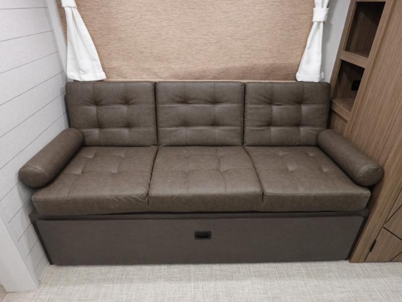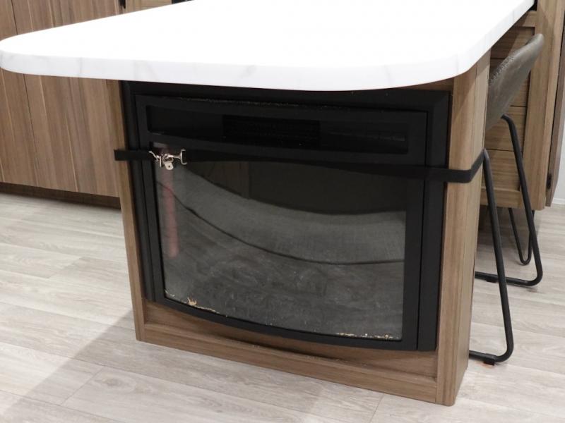 You can enjoy at-home comforts wherever you decide to camp in this travel trailer. The custom king bed with Versa Tilt includes dual shelves and a wardrobe so you can keep your space tidy. If you have a guest or two little ones, they can sleep on the jackknife sofa within the large slide out or on the double-size bunks right next to the full bath. Once you've made breakfast in the fully equipped kitchen, you can utilize the pull-out table to dine at. There is also a fireplace below the table, which will be perfect for cozy evenings indoors.