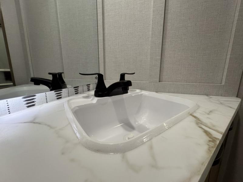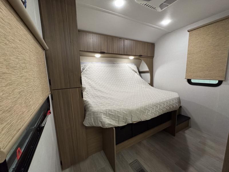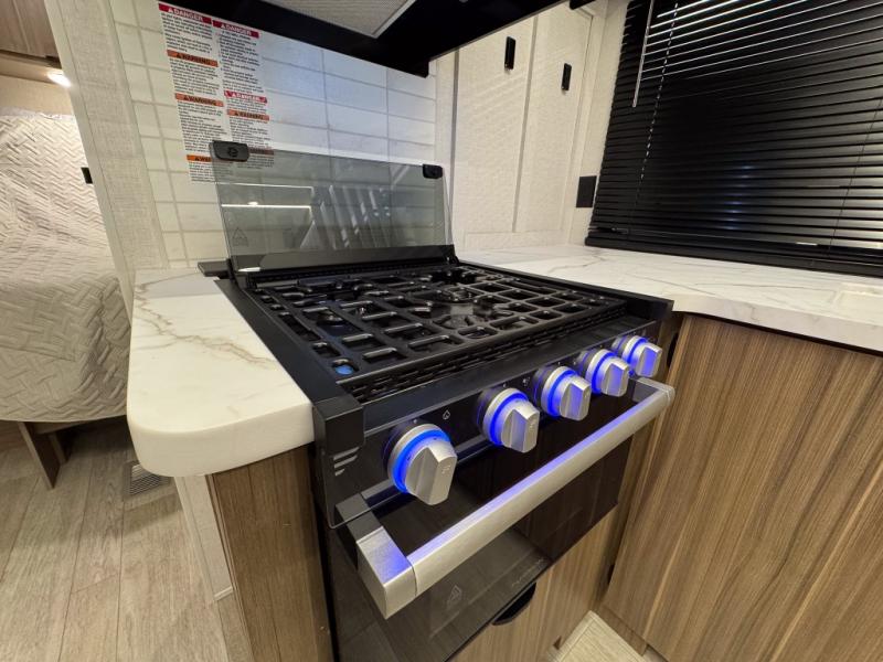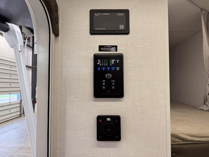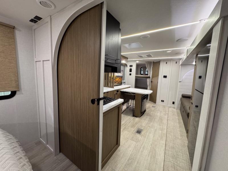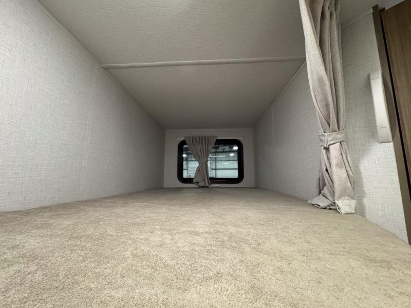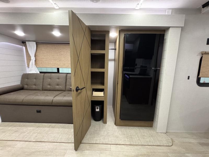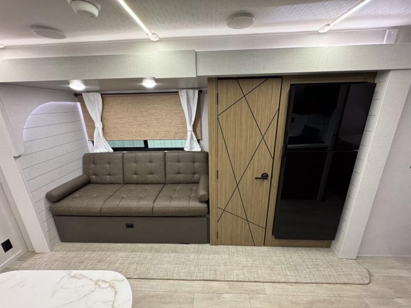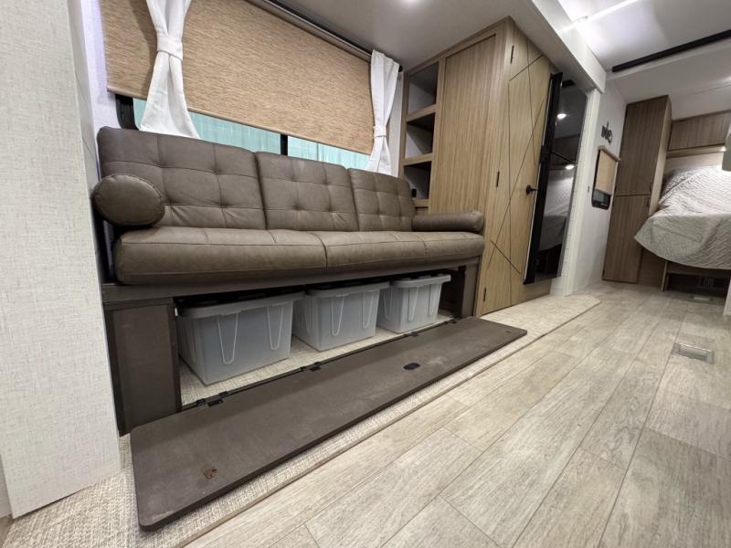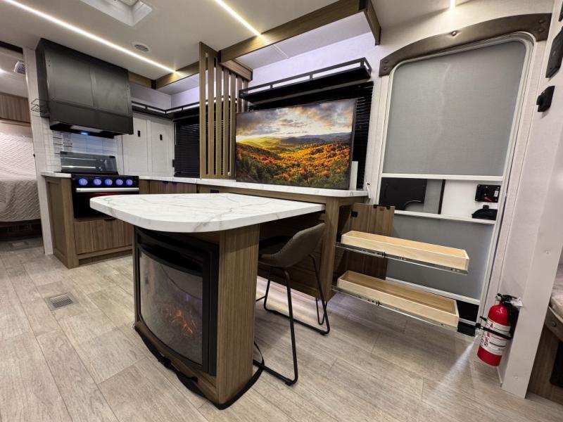 You can enjoy at-home comforts wherever you decide to camp in this travel trailer. The custom king bed with Versa Tilt includes dual shelves and a wardrobe so you can keep your space tidy. If you have a guest or two little ones, they can sleep on the jackknife sofa within the large slide out or on the double-size bunks right next to the full bath. Once you've made breakfast in the fully equipped kitchen, you can utilize the pull-out table to dine at. There is also a fireplace below the table, which will be perfect for cozy evenings indoors.
