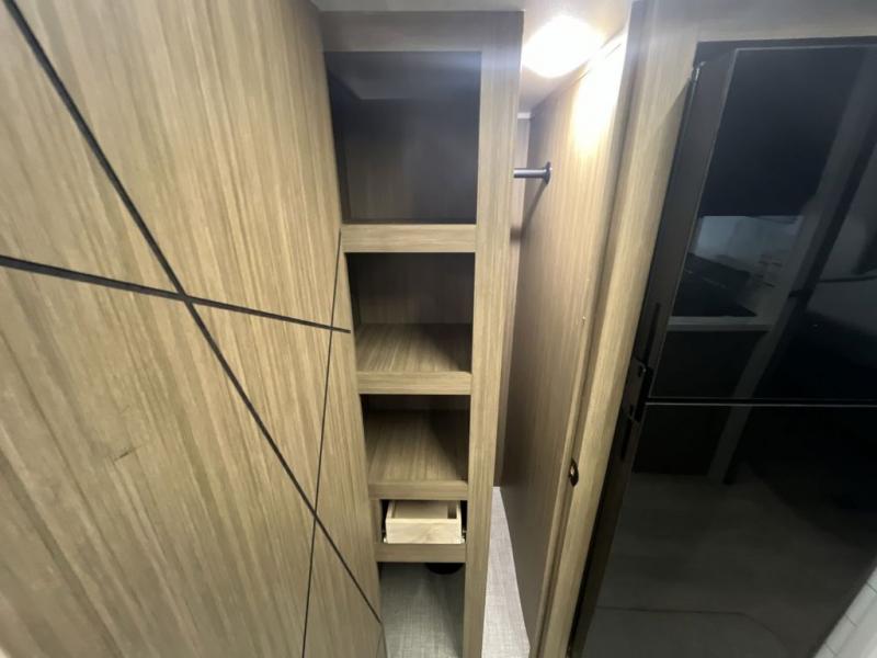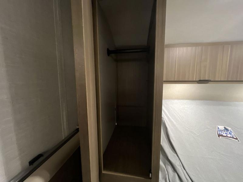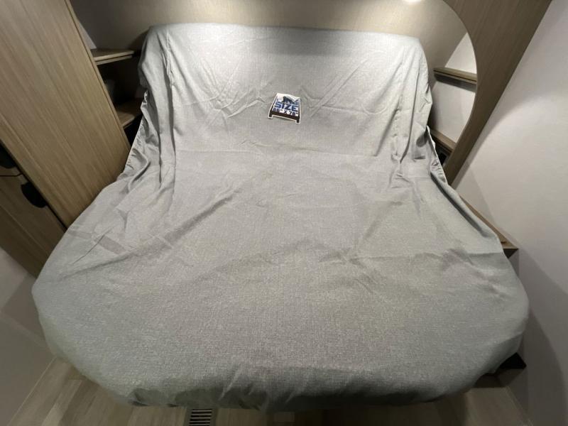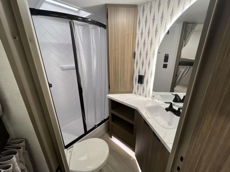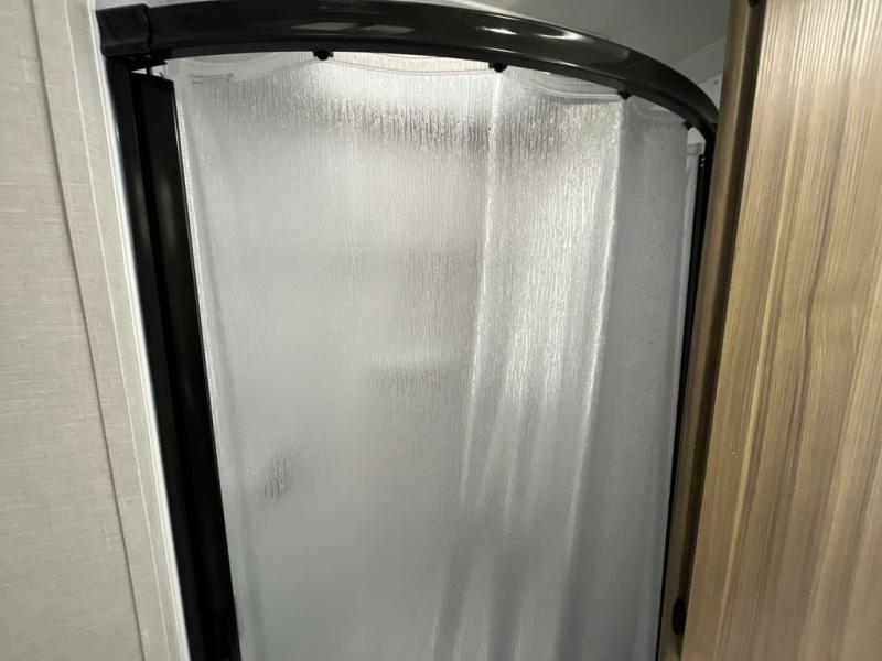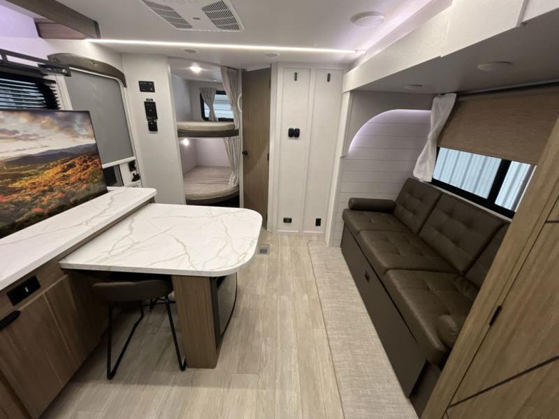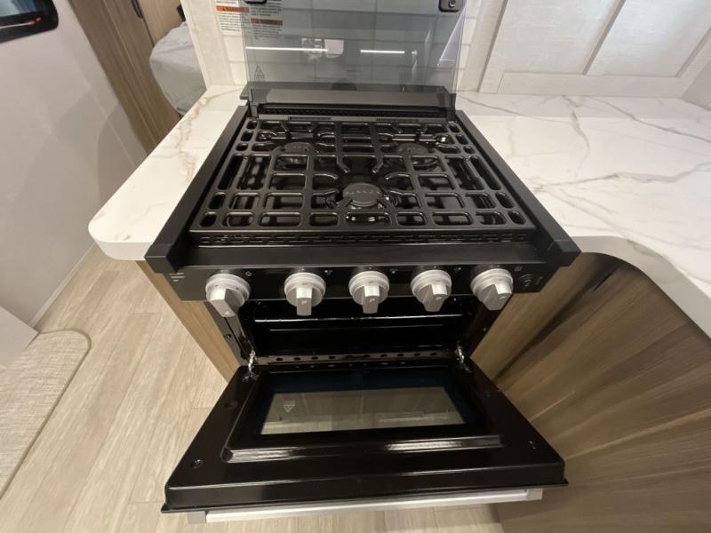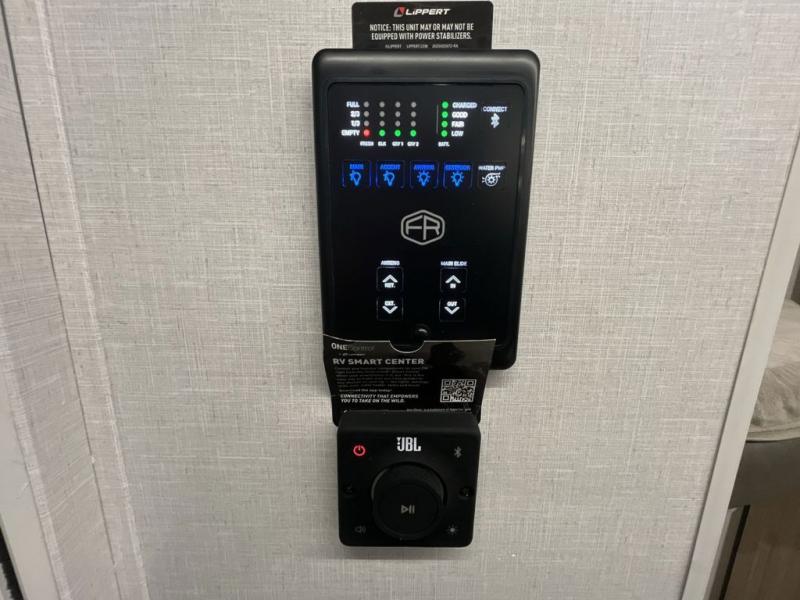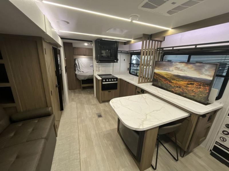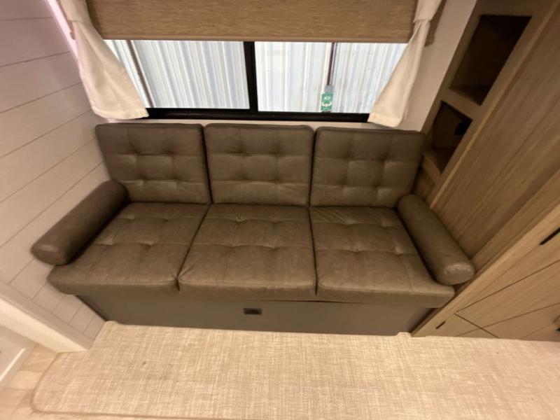 You can enjoy at-home comforts wherever you decide to camp in this travel trailer. The custom king bed with Versa Tilt includes dual shelves and a wardrobe so you can keep your space tidy. If you have a guest or two little ones, they can sleep on the jackknife sofa within the large slide out or on the double-size bunks right next to the full bath. Once you've made breakfast in the fully equipped kitchen, you can utilize the pull-out table to dine at. There is also a fireplace below the table, which will be perfect for cozy evenings indoors.