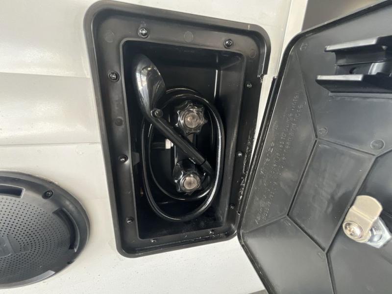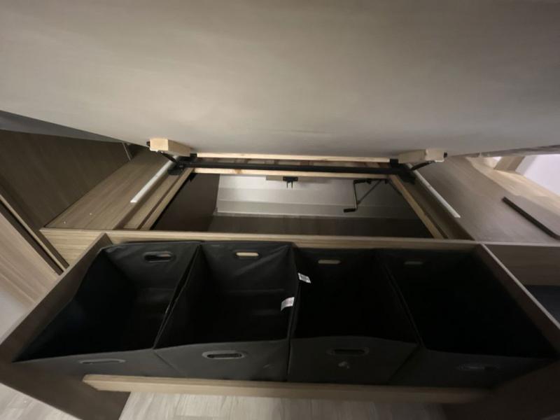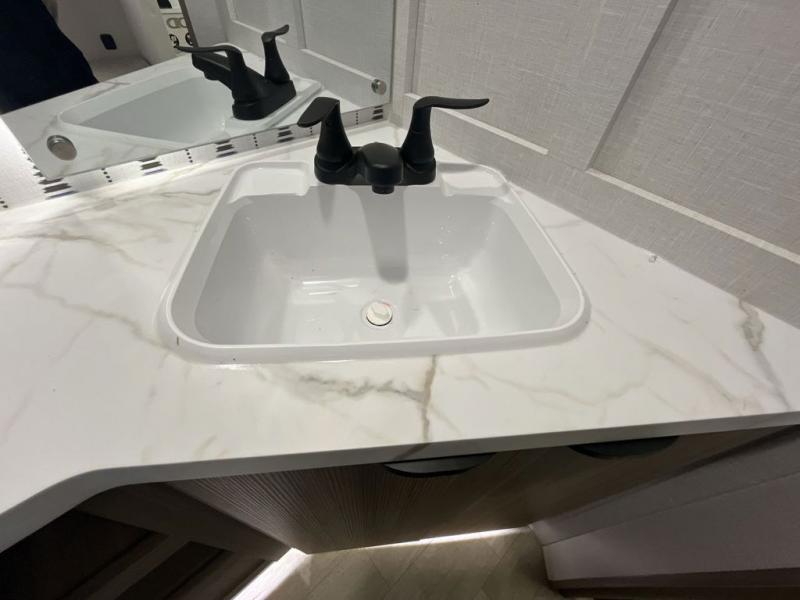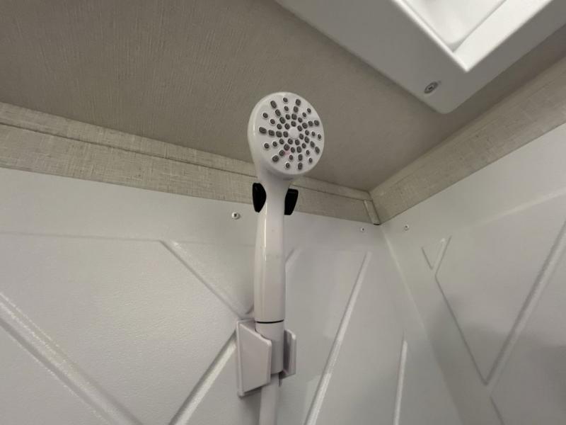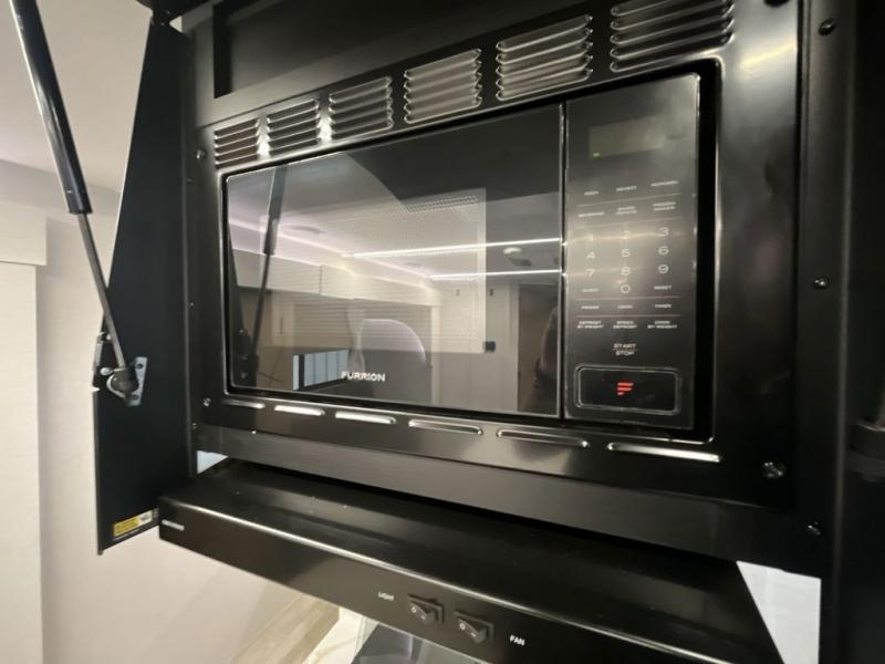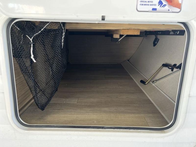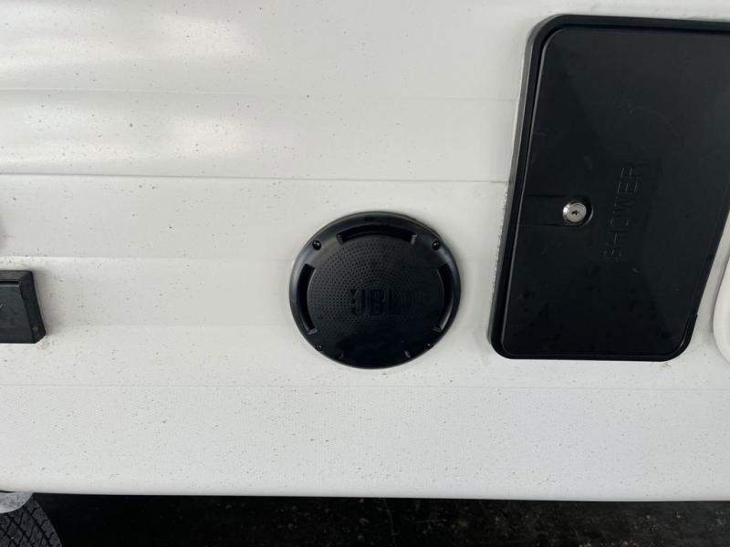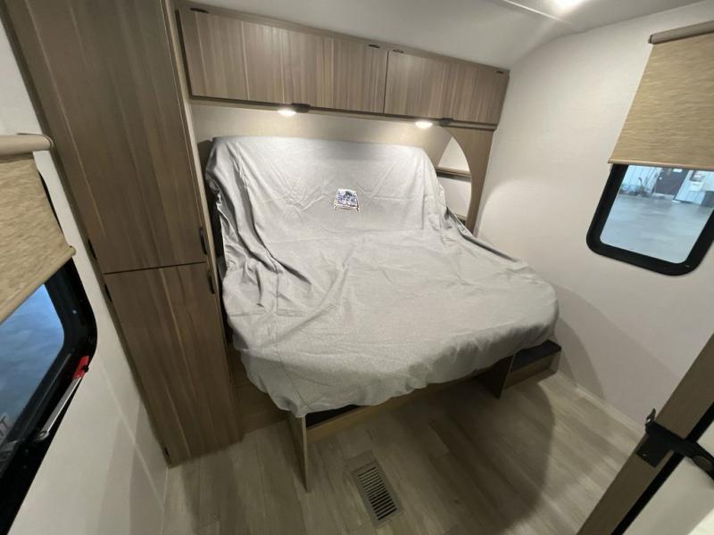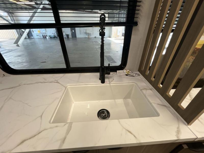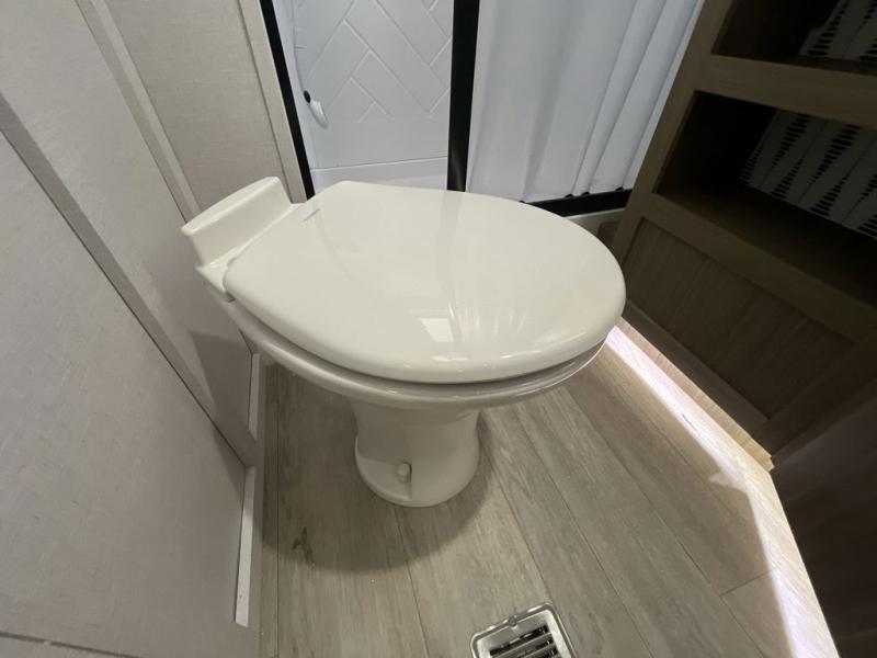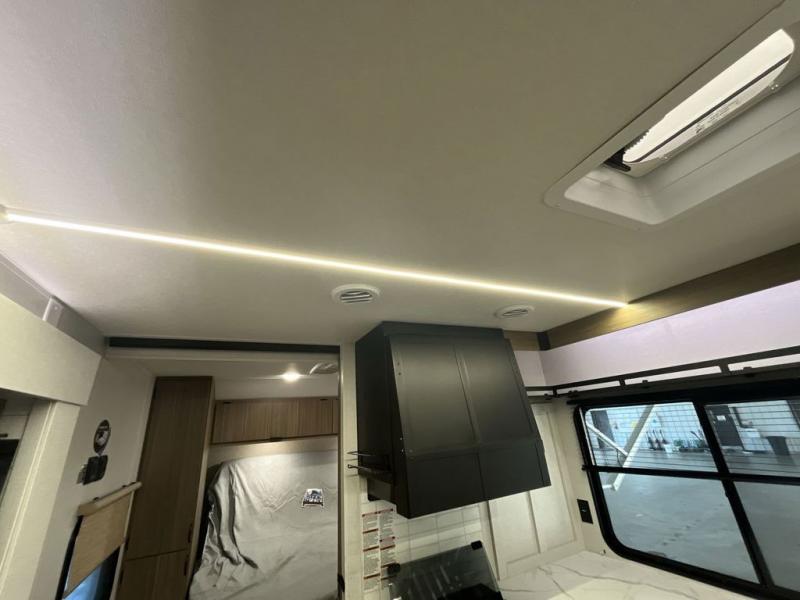 You can enjoy at-home comforts wherever you decide to camp in this travel trailer. The custom king bed with Versa Tilt includes dual shelves and a wardrobe so you can keep your space tidy. If you have a guest or two little ones, they can sleep on the jackknife sofa within the large slide out or on the double-size bunks right next to the full bath. Once you've made breakfast in the fully equipped kitchen, you can utilize the pull-out table to dine at. There is also a fireplace below the table, which will be perfect for cozy evenings indoors.