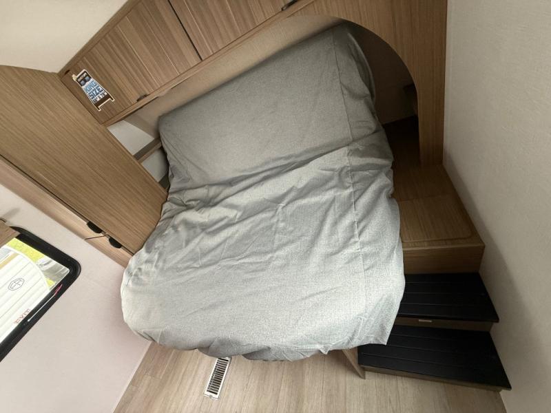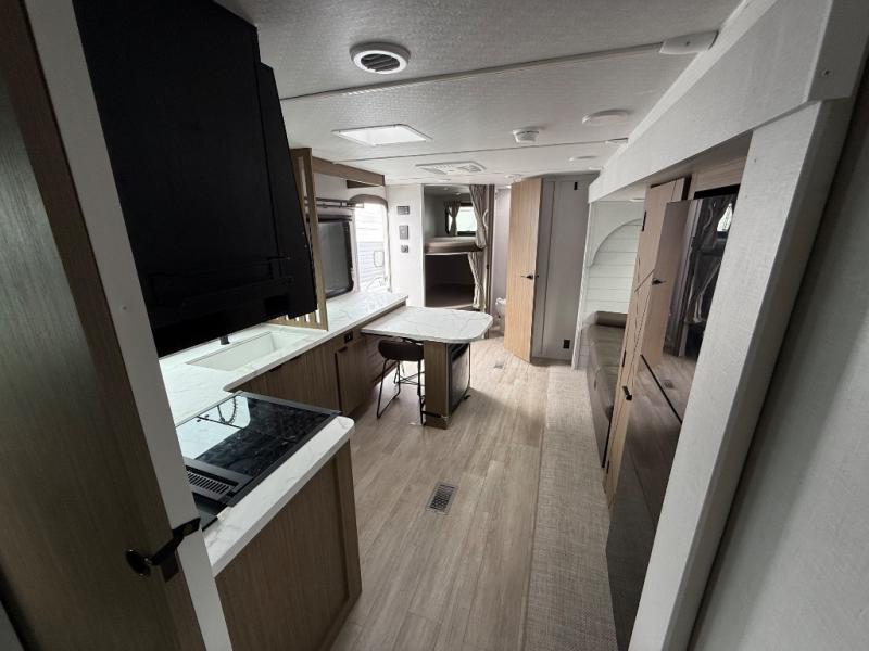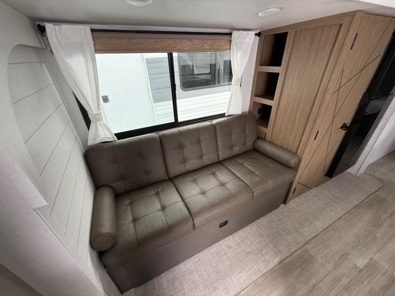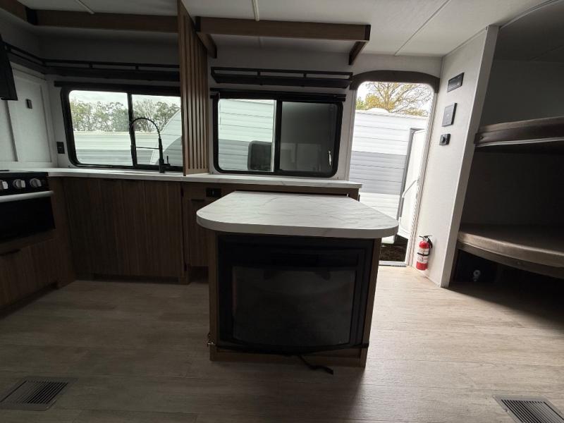 You can enjoy at-home comforts wherever you decide to camp in this travel trailer. The custom king bed with Versa Tilt includes dual shelves and a wardrobe so you can keep your space tidy. If you have a guest or two little ones, they can sleep on the jackknife sofa within the large slide out or on the double-size bunks right next to the full bath. Once you've made breakfast in the fully equipped kitchen, you can utilize the pull-out table to dine at. There is also a fireplace below the table, which will be perfect for cozy evenings indoors.