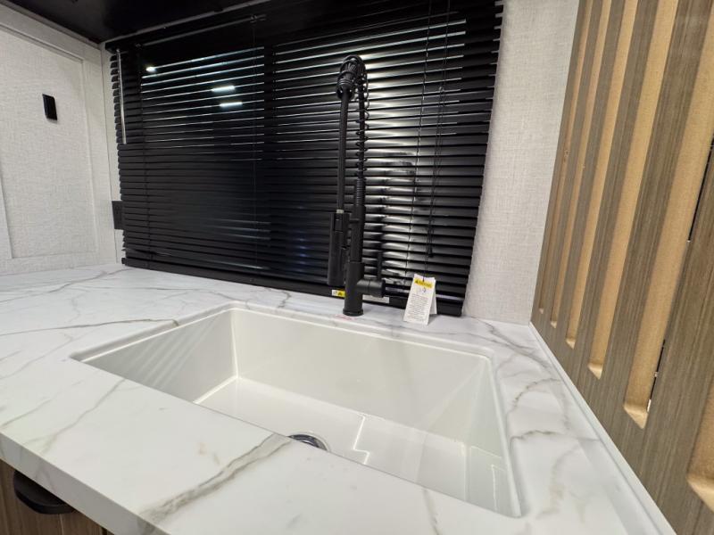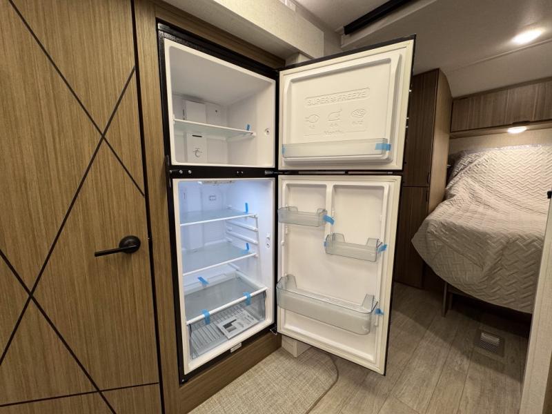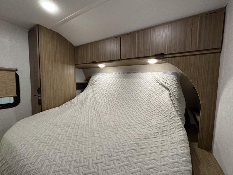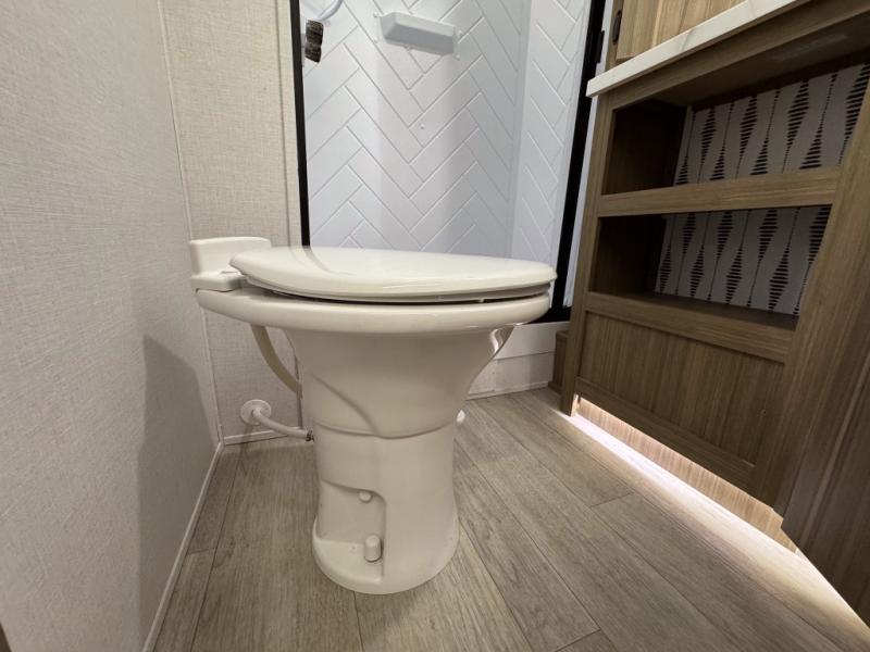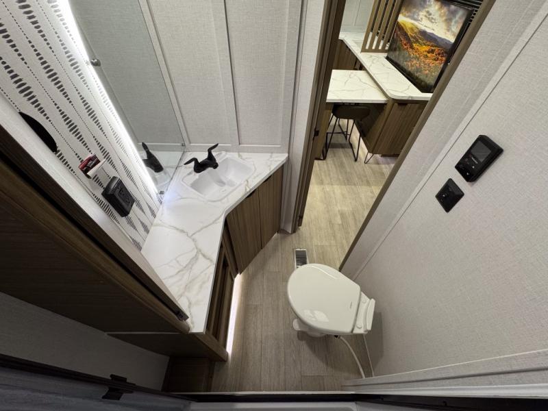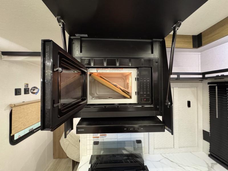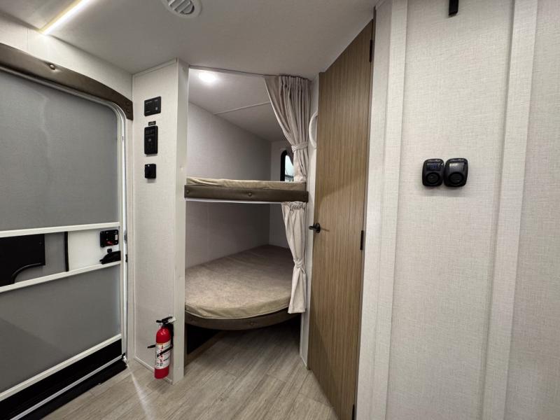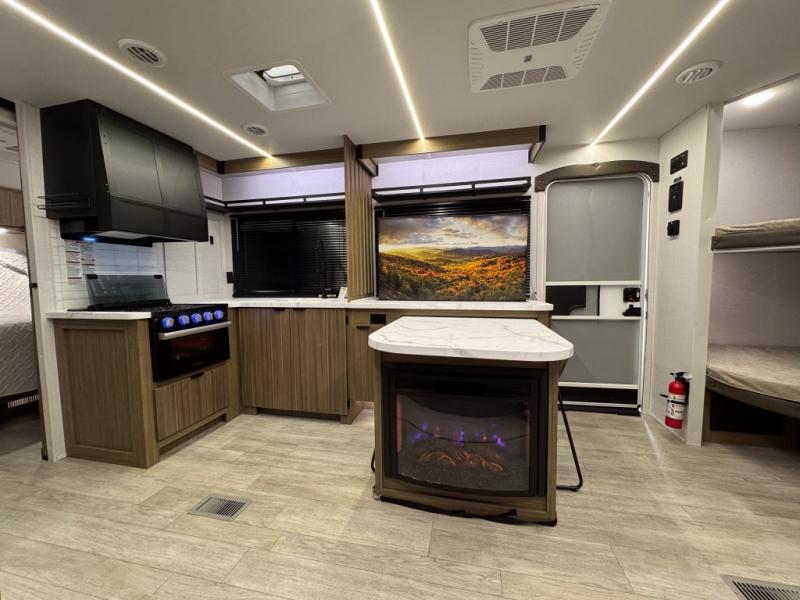 You can enjoy at-home comforts wherever you decide to camp in this travel trailer. The custom king bed with Versa Tilt includes dual shelves and a wardrobe so you can keep your space tidy. If you have a guest or two little ones, they can sleep on the jackknife sofa within the large slide out or on the double-size bunks right next to the full bath. Once you've made breakfast in the fully equipped kitchen, you can utilize the pull-out table to dine at. There is also a fireplace below the table, which will be perfect for cozy evenings indoors.
