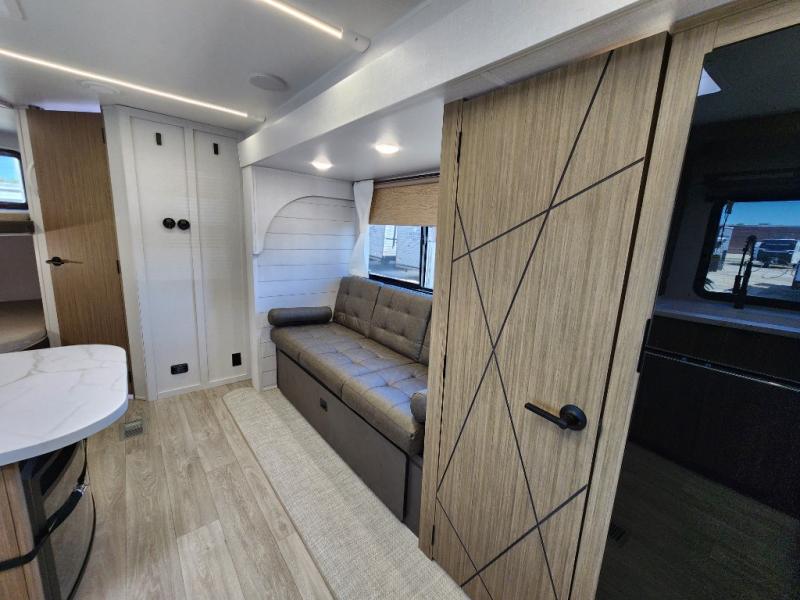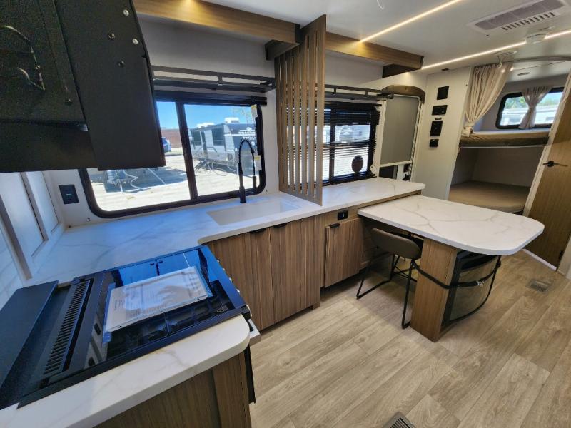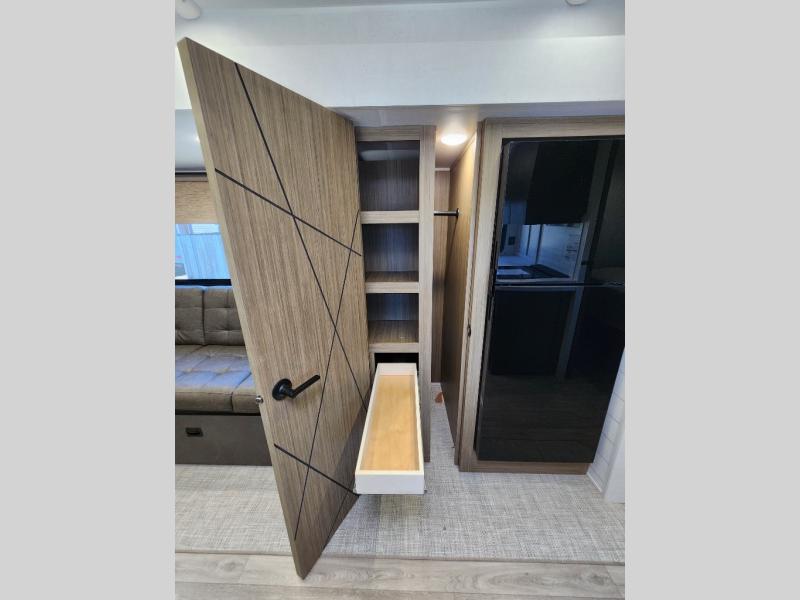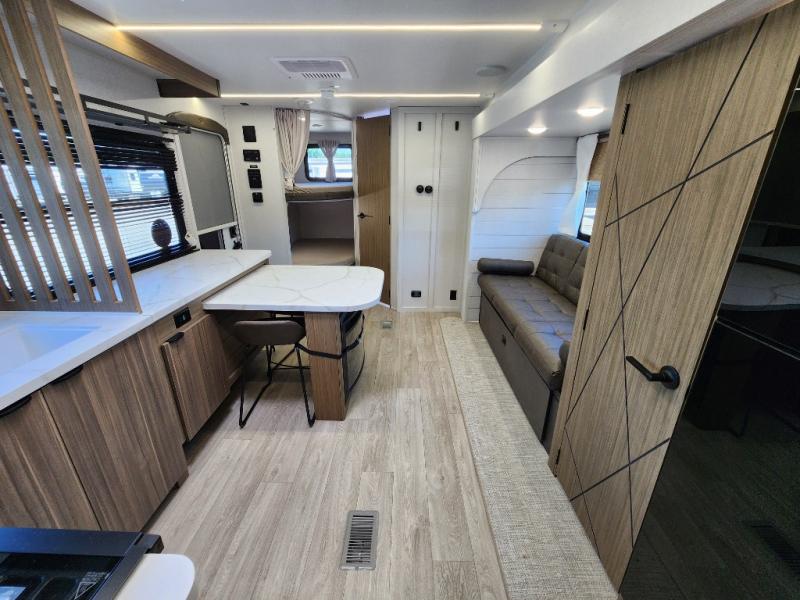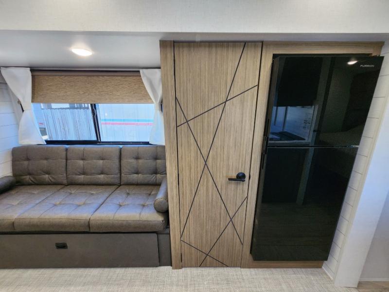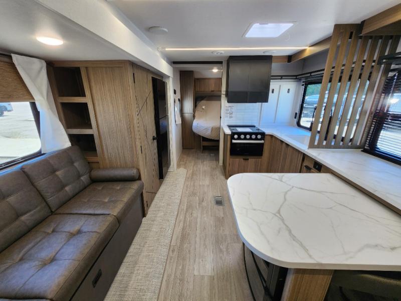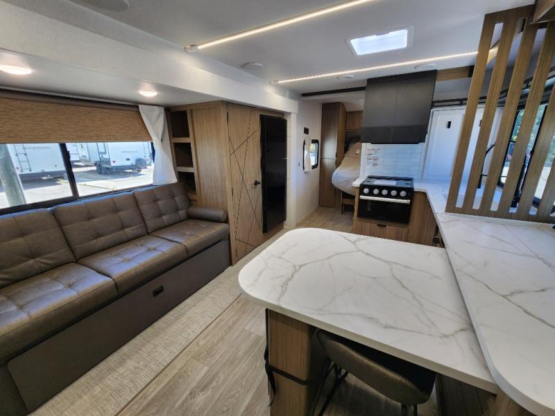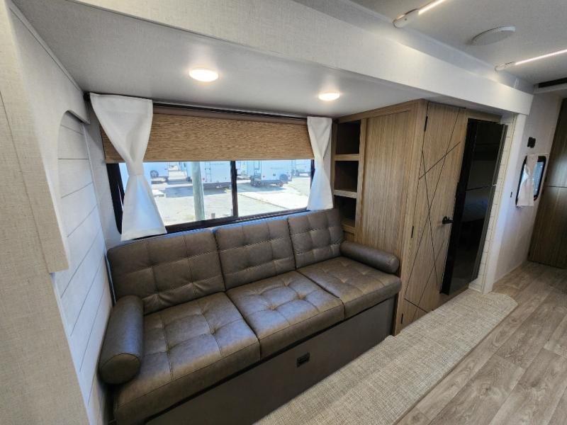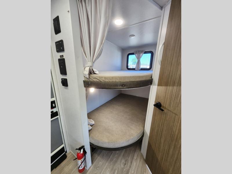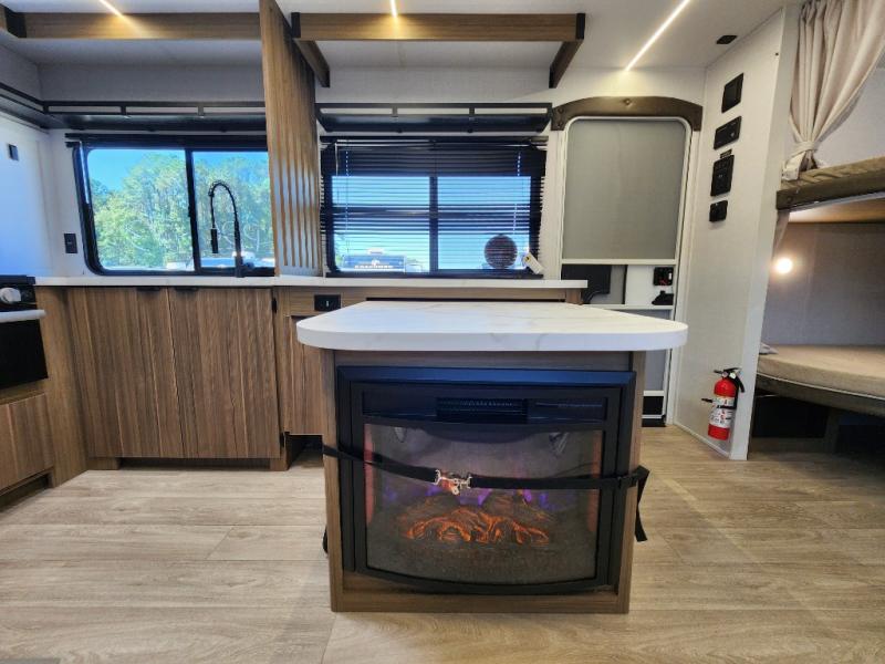 You can enjoy at-home comforts wherever you decide to camp in this travel trailer. The custom king bed with Versa Tilt includes dual shelves and a wardrobe so you can keep your space tidy. If you have a guest or two little ones, they can sleep on the jackknife sofa within the large slide out or on the double-size bunks right next to the full bath. Once you've made breakfast in the fully equipped kitchen, you can utilize the pull-out table to dine at. There is also a fireplace below the table, which will be perfect for cozy evenings indoors.