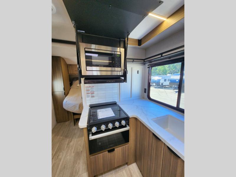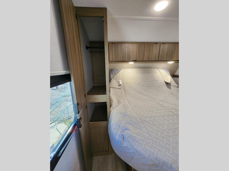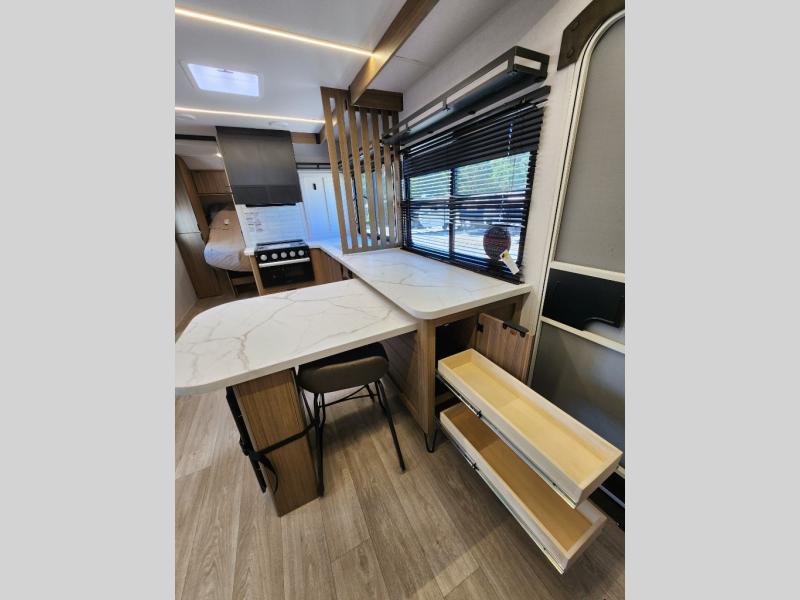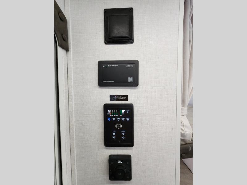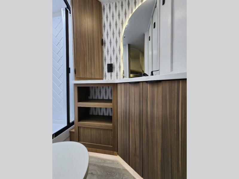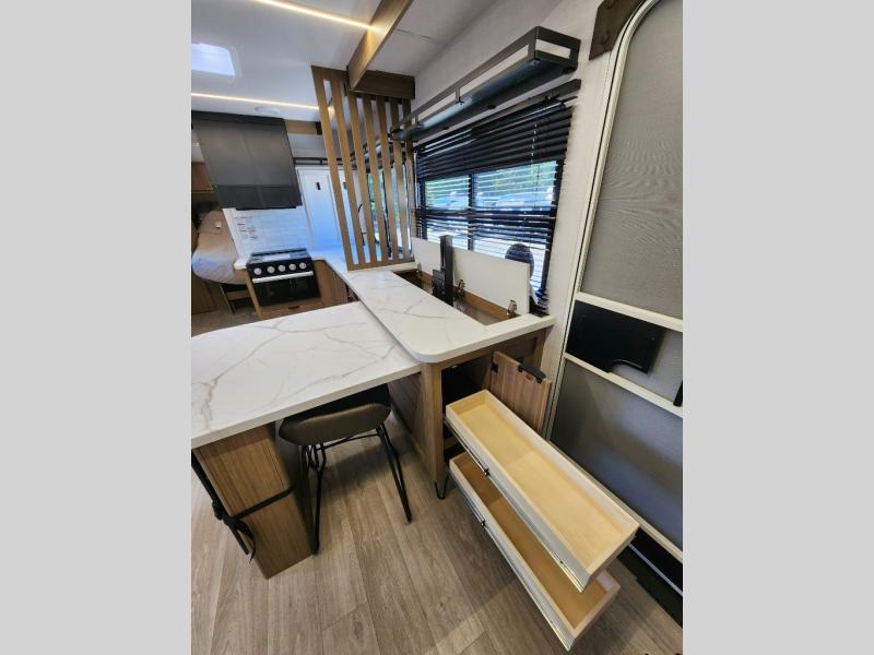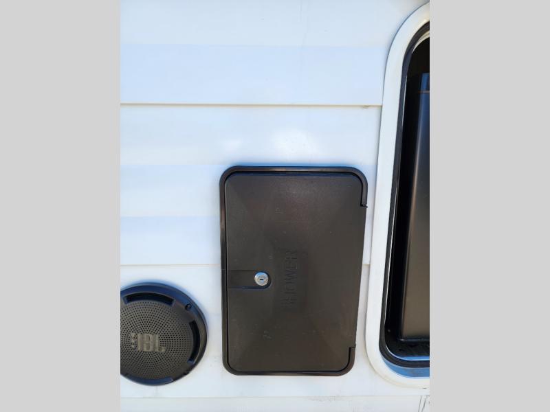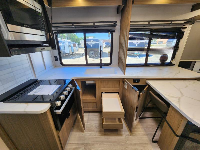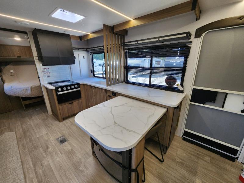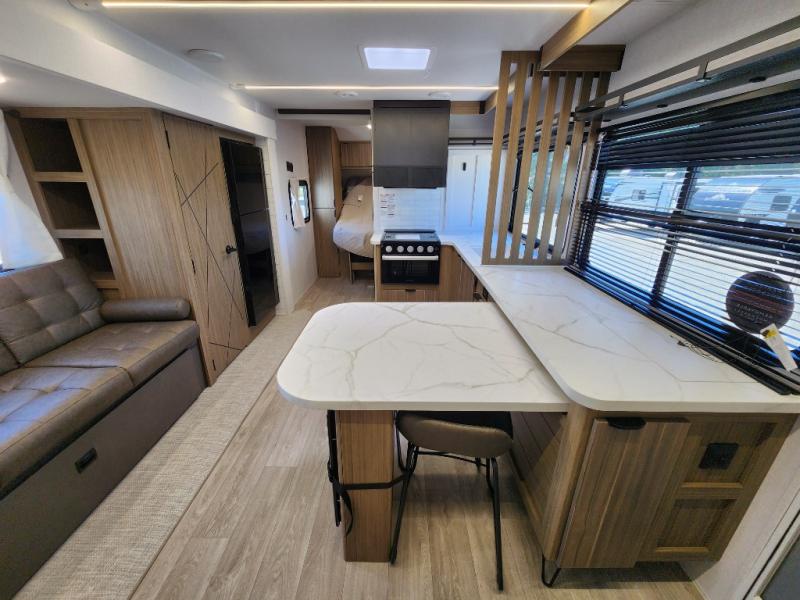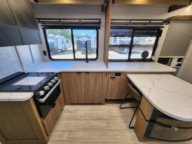 You can enjoy at-home comforts wherever you decide to camp in this travel trailer. The custom king bed with Versa Tilt includes dual shelves and a wardrobe so you can keep your space tidy. If you have a guest or two little ones, they can sleep on the jackknife sofa within the large slide out or on the double-size bunks right next to the full bath. Once you've made breakfast in the fully equipped kitchen, you can utilize the pull-out table to dine at. There is also a fireplace below the table, which will be perfect for cozy evenings indoors.