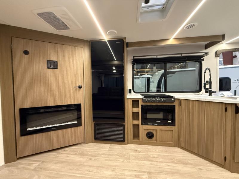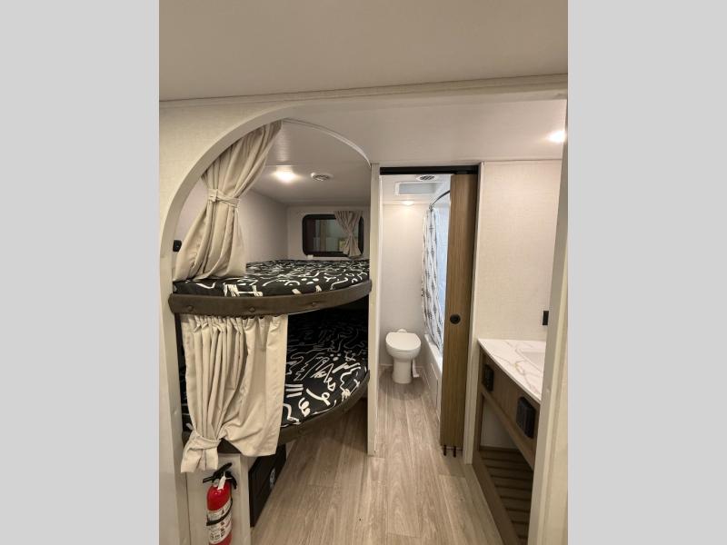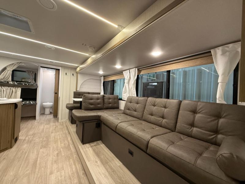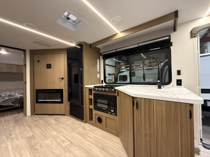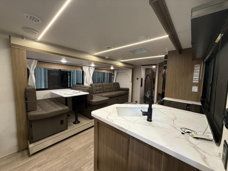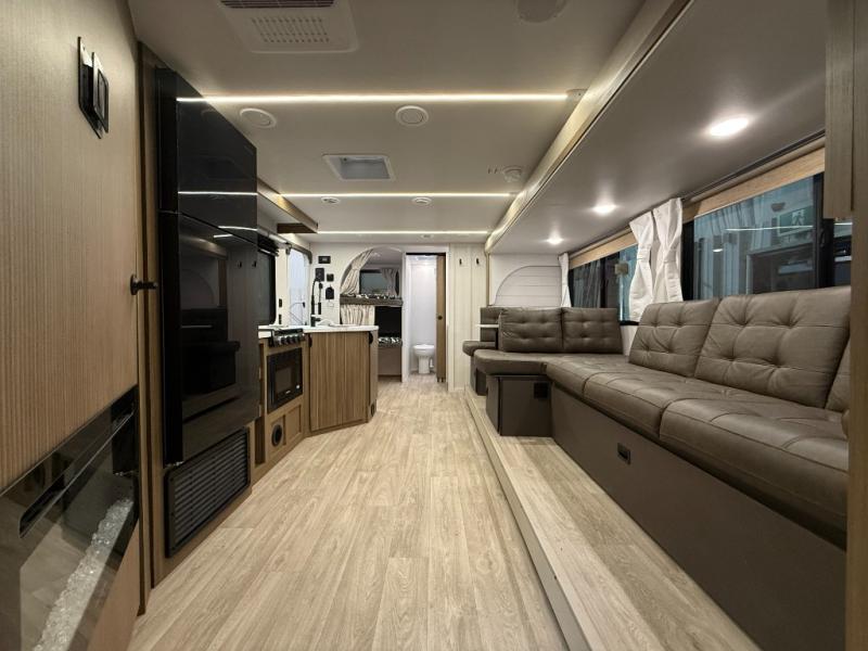You can enjoy at-home comforts wherever you decide to camp in this travel trailer. The custom king bed with Versa Tilt includes dual shelves and a wardrobe so you can keep your space tidy. If you have a guest or two little ones, they can sleep on the jackknife sofa within the large slide out or on the double-size bunks right next to the full bath. Once you've made breakfast in the fully equipped kitchen, you can utilize the pull-out table to dine at. There is also a fireplace below the table, which will be perfect for cozy evenings indoors.