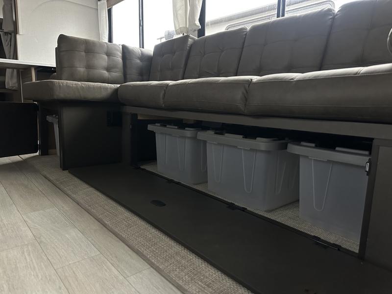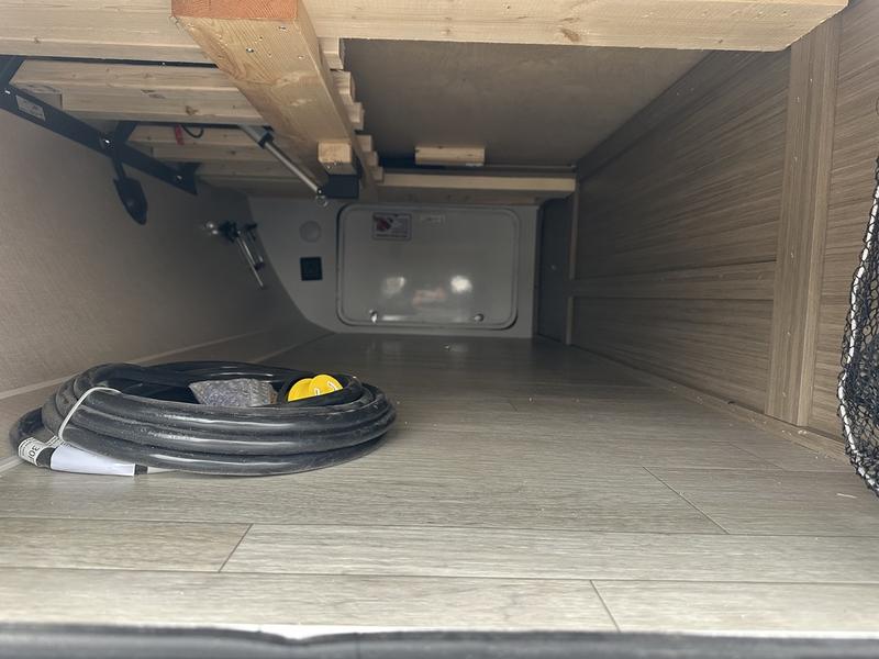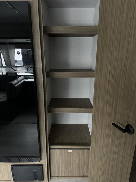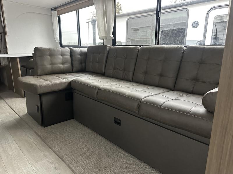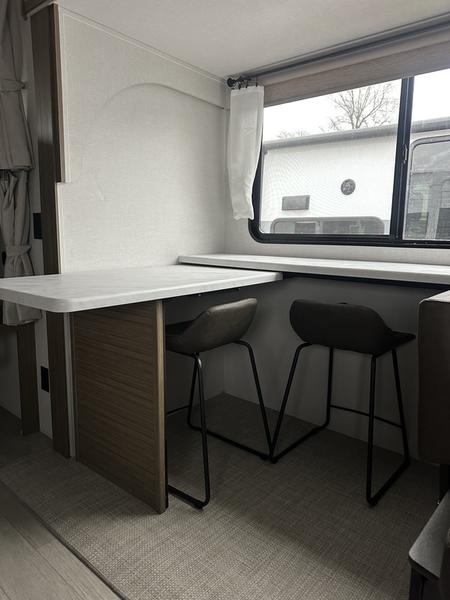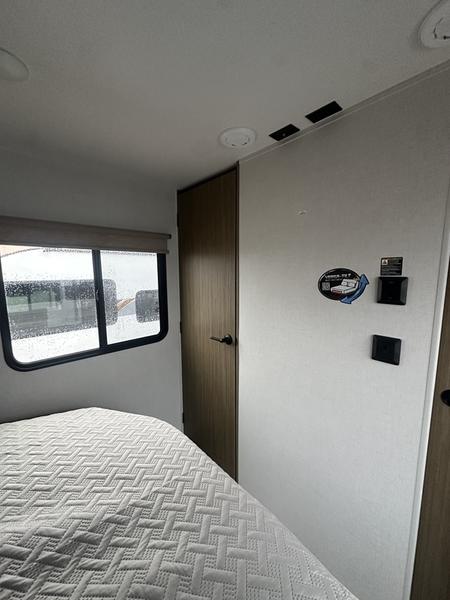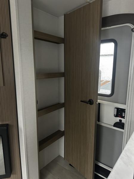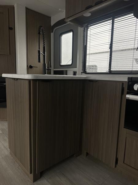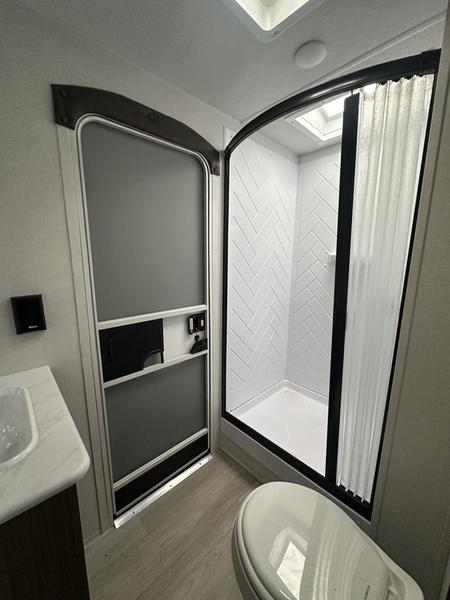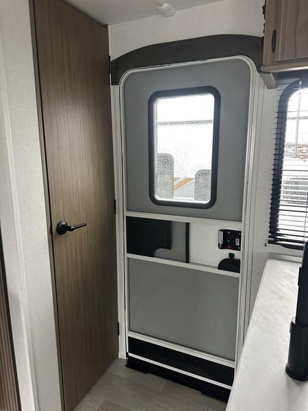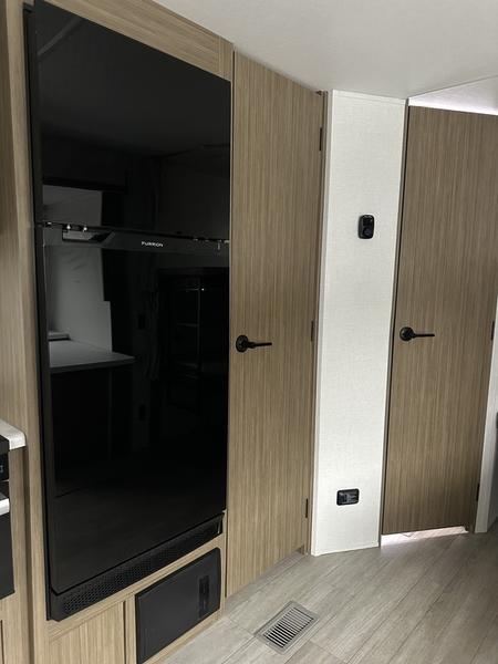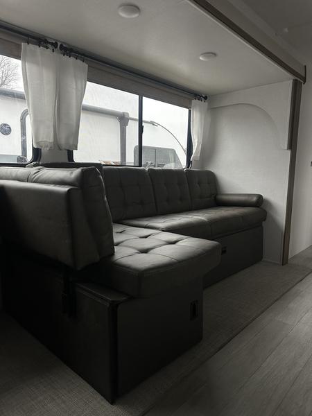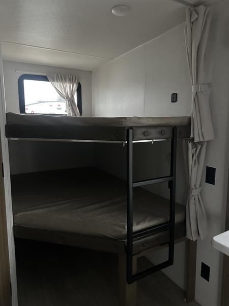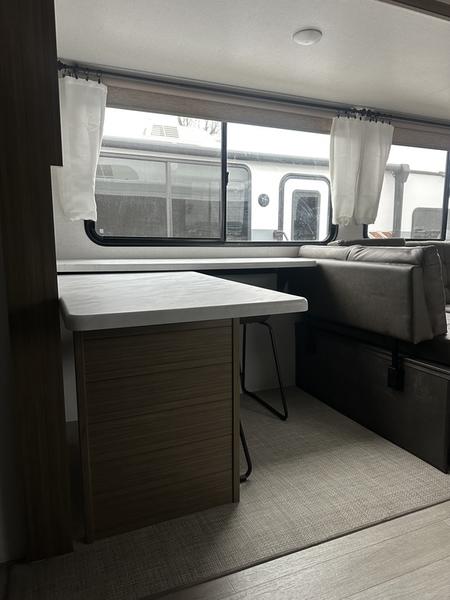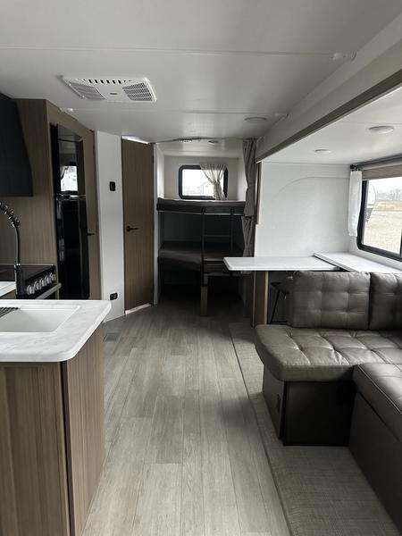 This Wildwood travel trailer is perfect for a larger group and family since it includes double-size bunks for the kids or friends, and a front private bedroom for you to enjoy. You'll find a Versa Lounge in the large slide out, along with a Versa Flex table, and the panoramic windows will provide great views. This model includes two entry doors, one leading into the main living area and another leading into the rear corner bath for convenience. Bring along all of your camping gear in the pass-through storage, and the interior walk-in pantry can hold all the snacks. There is an exterior camp kitchen beneath an 18' power awning with adjustable legs to keep you protected from the hot summer sun or rain. This also provides more outdoor living space for your family to enjoy.