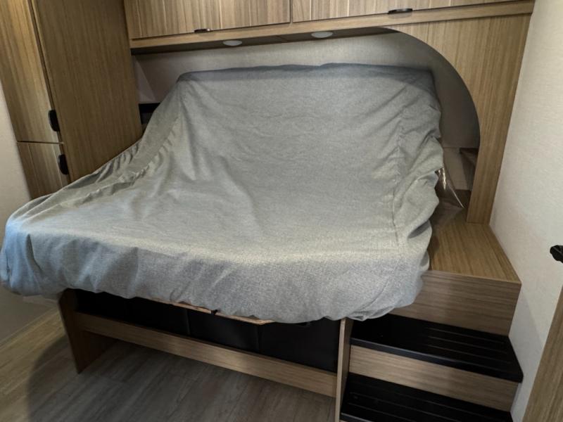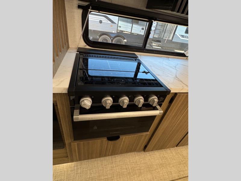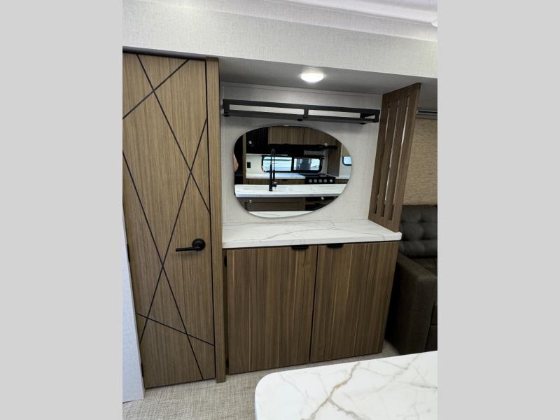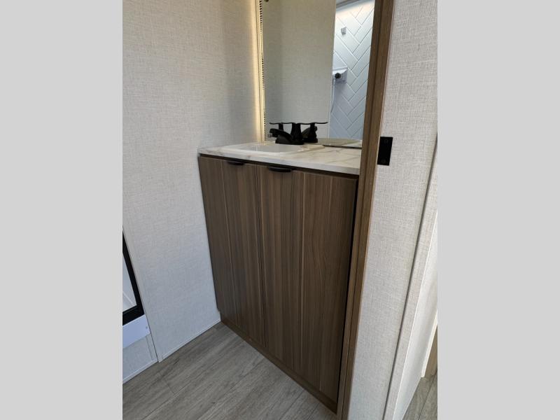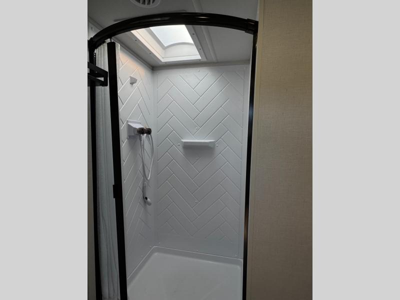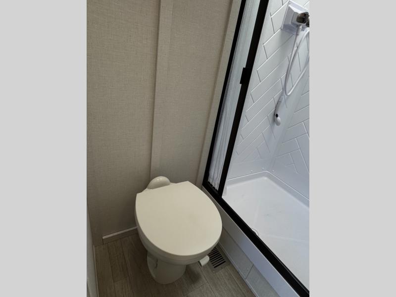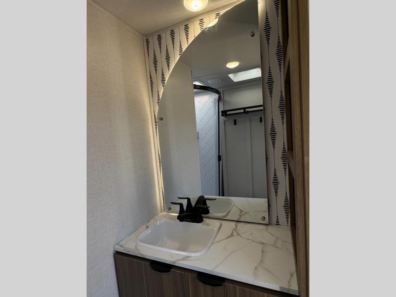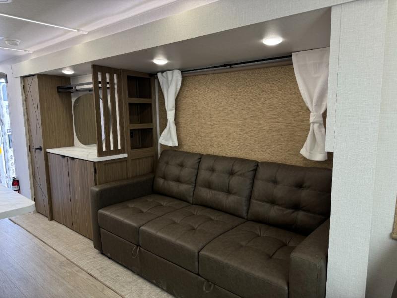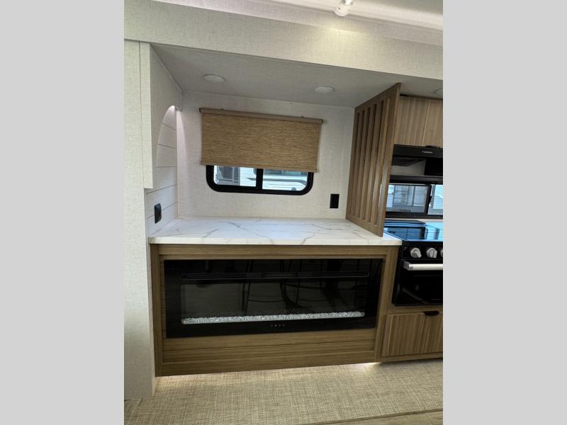 Find your zen int this spacious travel trailer for four! Once you've unloaded your gear, you can head inside to make lunch at the kitchen island with four chairs. An 80" trundle sofa provides additional seating space plus sleeping space for guests. You will love the rear custom recliners that are conveniently located next to the fireplace. The full bath is located towards the front next to the private bedroom so you can easily use the restroom at night, and you're sure to get a great night's rest on the custom king bed with Versa Tilt. This unit also includes washer and dryer prep, giving you the option to add these appliances.