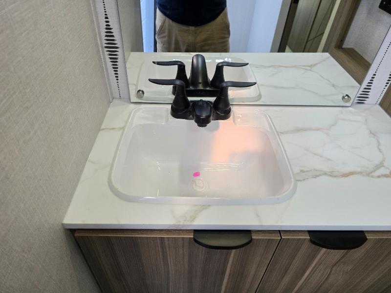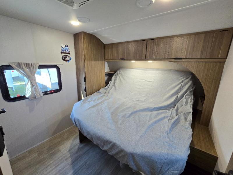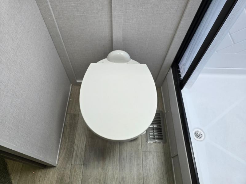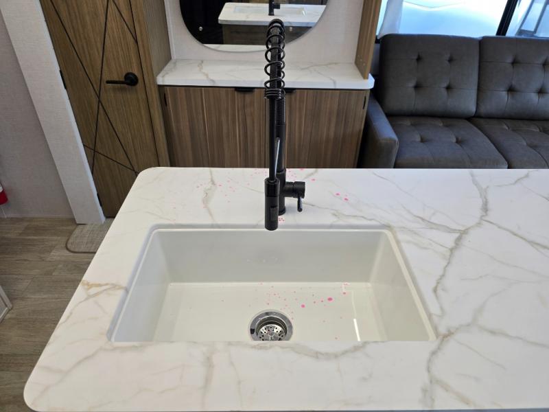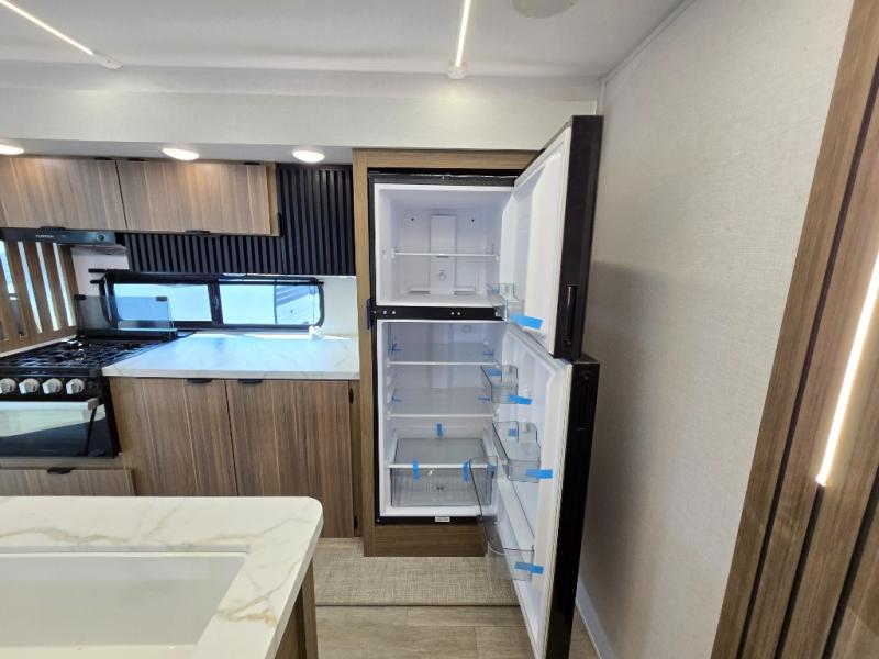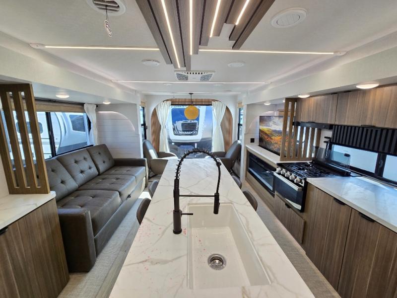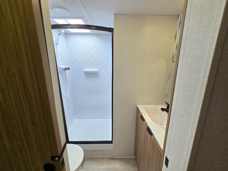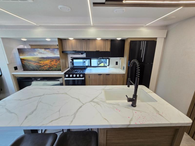 Find your zen int this spacious travel trailer for four! Once you've unloaded your gear, you can head inside to make lunch at the kitchen island with four chairs. An 80" trundle sofa provides additional seating space plus sleeping space for guests. You will love the rear custom recliners that are conveniently located next to the fireplace. The full bath is located towards the front next to the private bedroom so you can easily use the restroom at night, and you're sure to get a great night's rest on the custom king bed with Versa Tilt. This unit also includes washer and dryer prep, giving you the option to add these appliances.