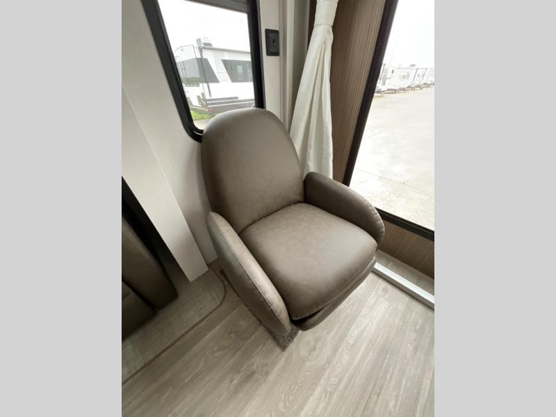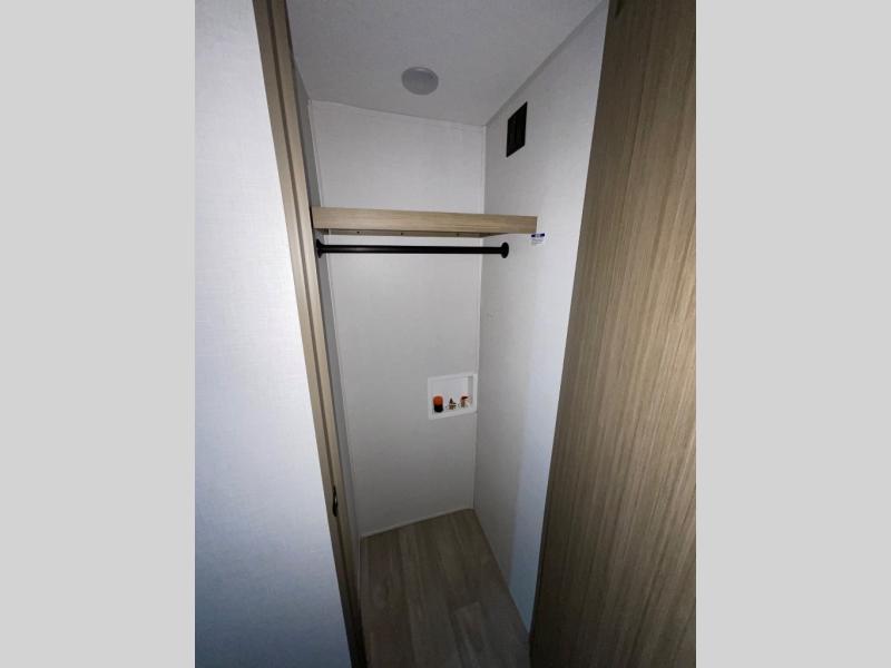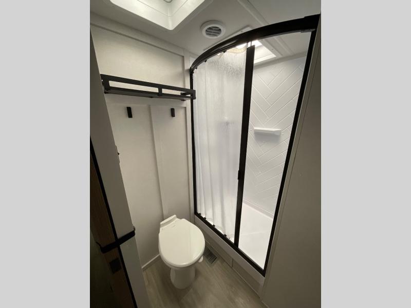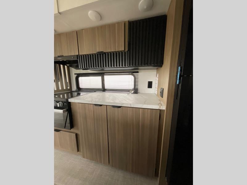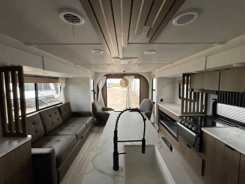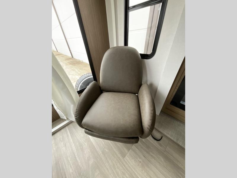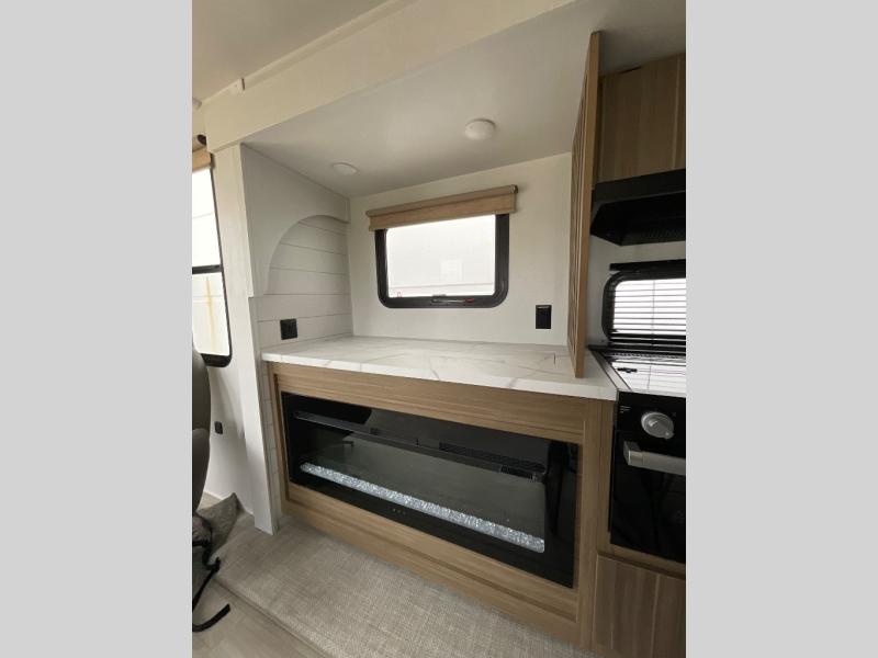 Find your zen int this spacious travel trailer for four! Once you've unloaded your gear, you can head inside to make lunch at the kitchen island with four chairs. An 80" trundle sofa provides additional seating space plus sleeping space for guests. You will love the rear custom recliners that are conveniently located next to the fireplace. The full bath is located towards the front next to the private bedroom so you can easily use the restroom at night, and you're sure to get a great night's rest on the custom king bed with Versa Tilt. This unit also includes washer and dryer prep, giving you the option to add these appliances.