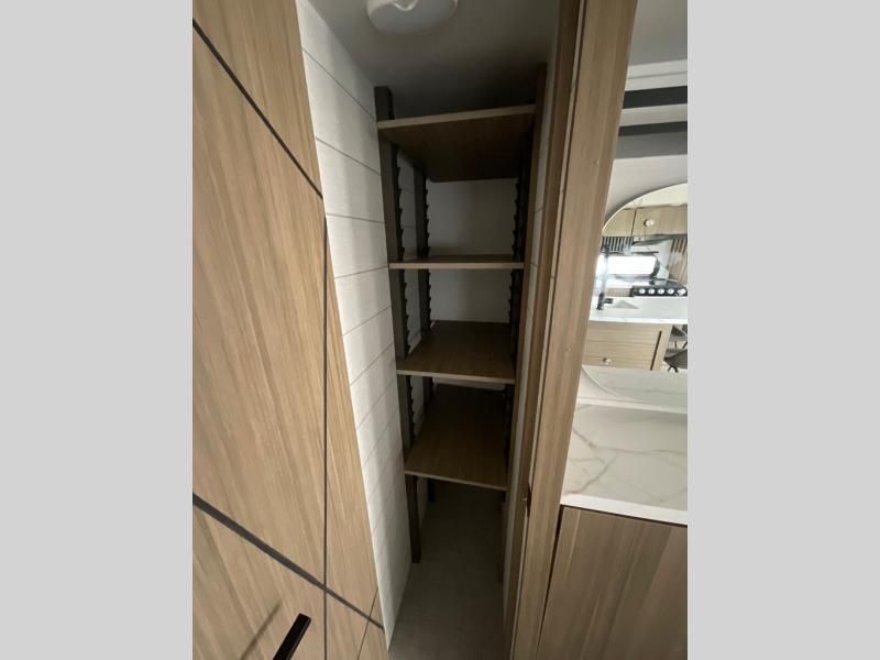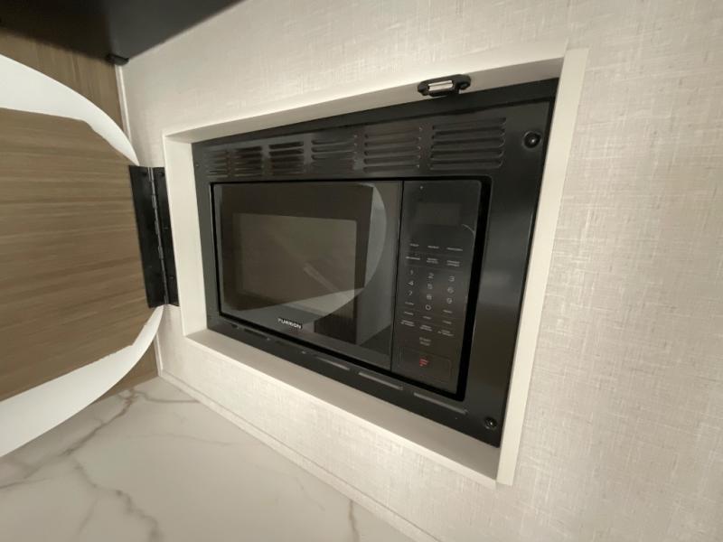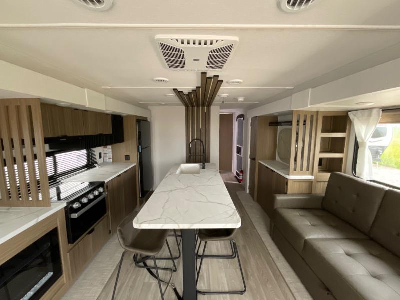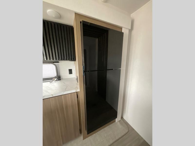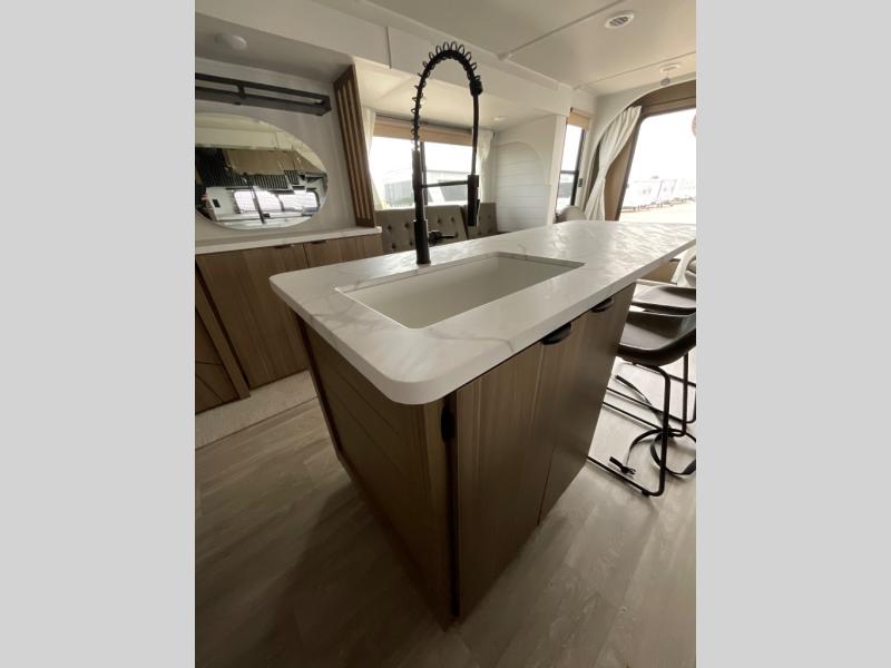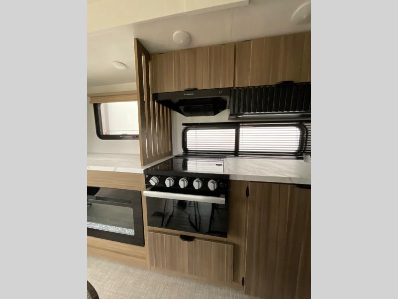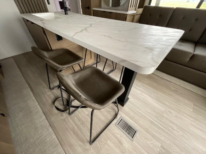 Find your zen int this spacious travel trailer for four! Once you've unloaded your gear, you can head inside to make lunch at the kitchen island with four chairs. An 80" trundle sofa provides additional seating space plus sleeping space for guests. You will love the rear custom recliners that are conveniently located next to the fireplace. The full bath is located towards the front next to the private bedroom so you can easily use the restroom at night, and you're sure to get a great night's rest on the custom king bed with Versa Tilt. This unit also includes washer and dryer prep, giving you the option to add these appliances.