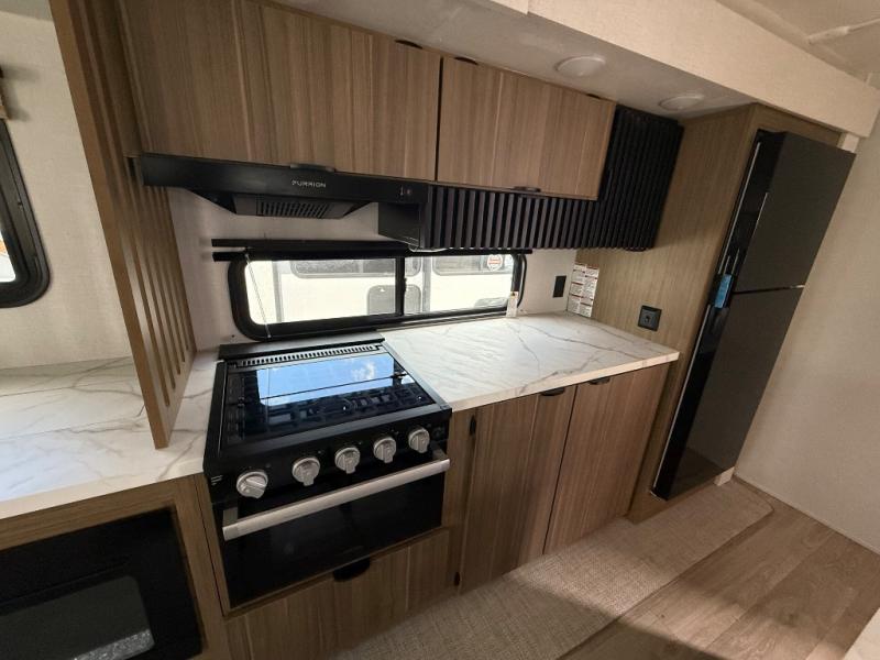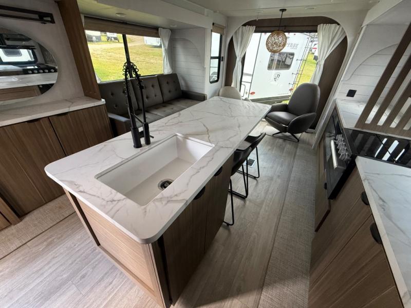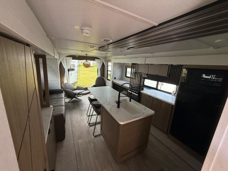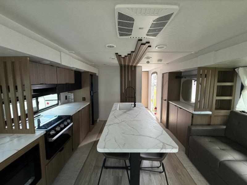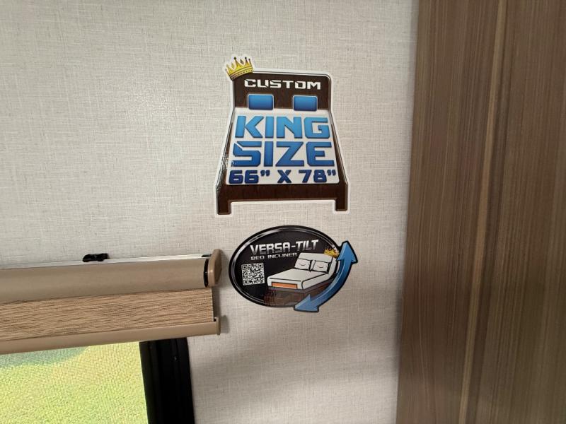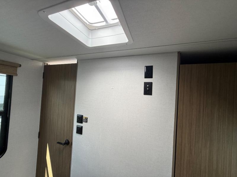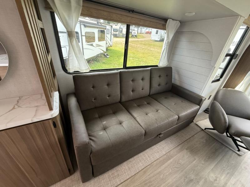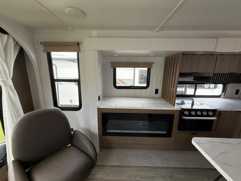 Find your zen int this spacious travel trailer for four! Once you've unloaded your gear, you can head inside to make lunch at the kitchen island with four chairs. An 80" trundle sofa provides additional seating space plus sleeping space for guests. You will love the rear custom recliners that are conveniently located next to the fireplace. The full bath is located towards the front next to the private bedroom so you can easily use the restroom at night, and you're sure to get a great night's rest on the custom king bed with Versa Tilt. This unit also includes washer and dryer prep, giving you the option to add these appliances.