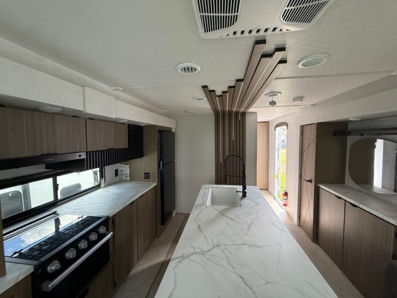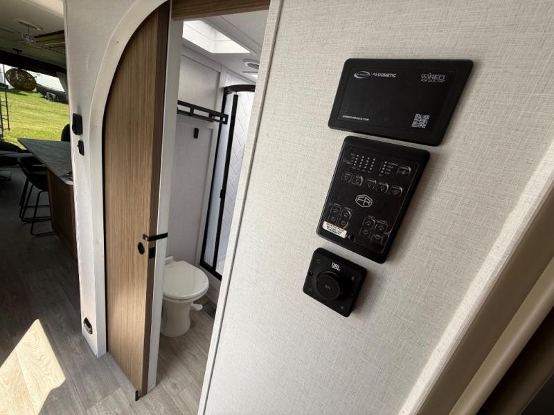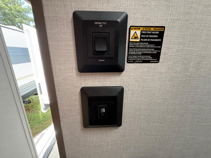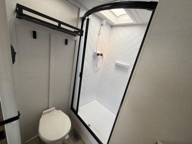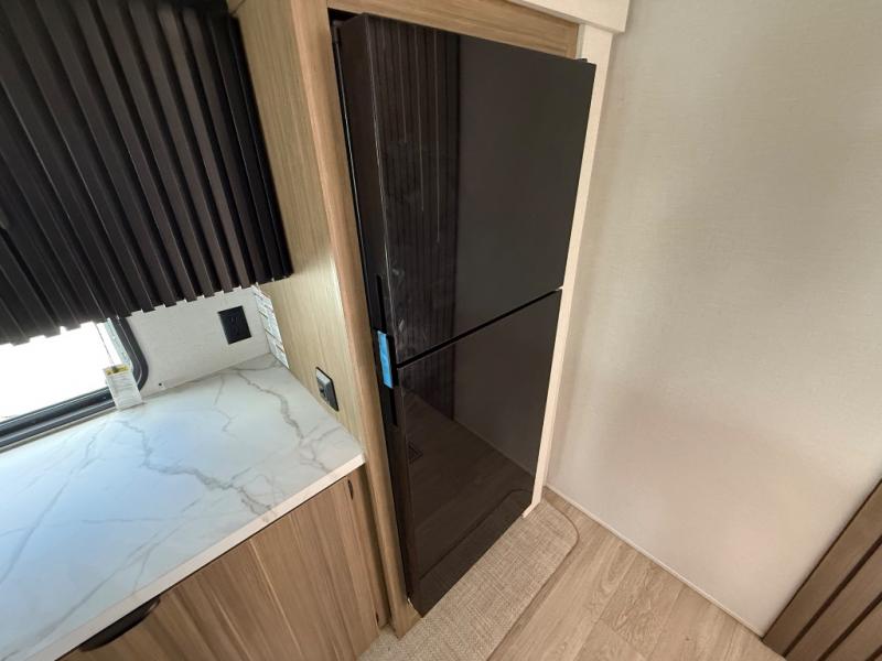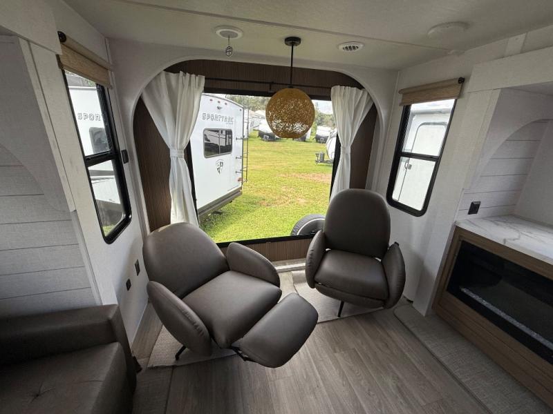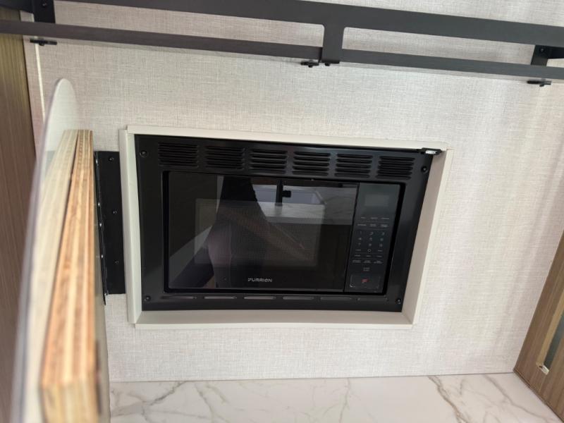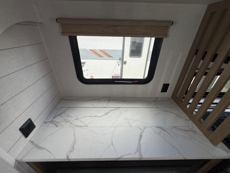 Find your zen int this spacious travel trailer for four! Once you've unloaded your gear, you can head inside to make lunch at the kitchen island with four chairs. An 80" trundle sofa provides additional seating space plus sleeping space for guests. You will love the rear custom recliners that are conveniently located next to the fireplace. The full bath is located towards the front next to the private bedroom so you can easily use the restroom at night, and you're sure to get a great night's rest on the custom king bed with Versa Tilt. This unit also includes washer and dryer prep, giving you the option to add these appliances.