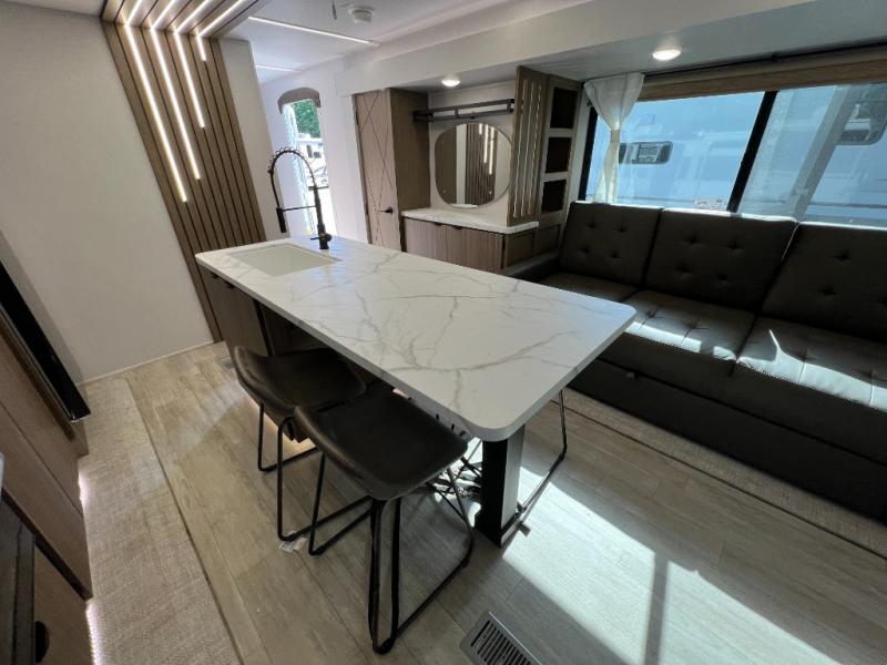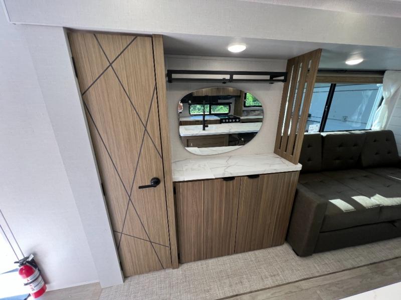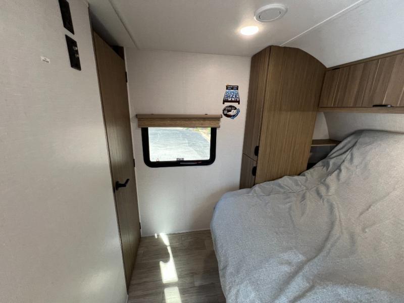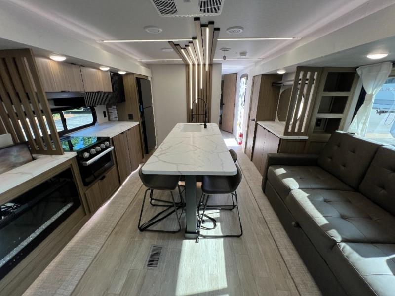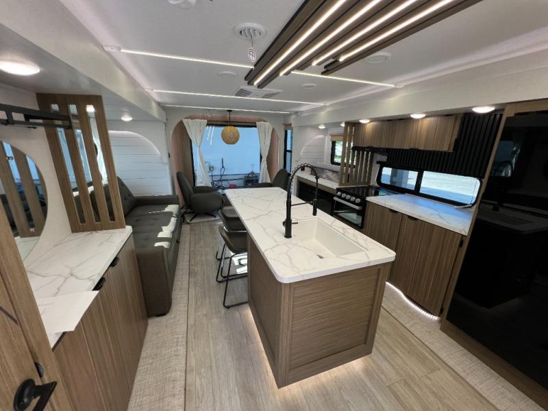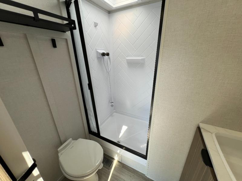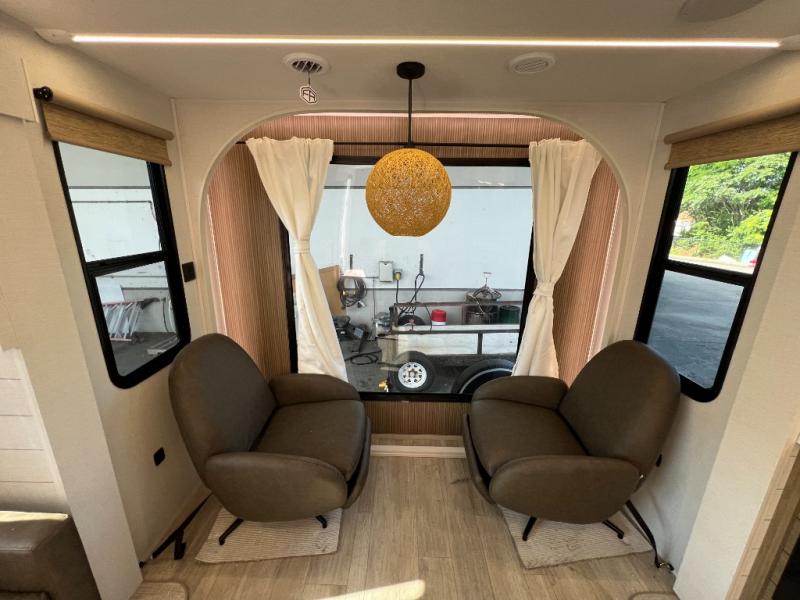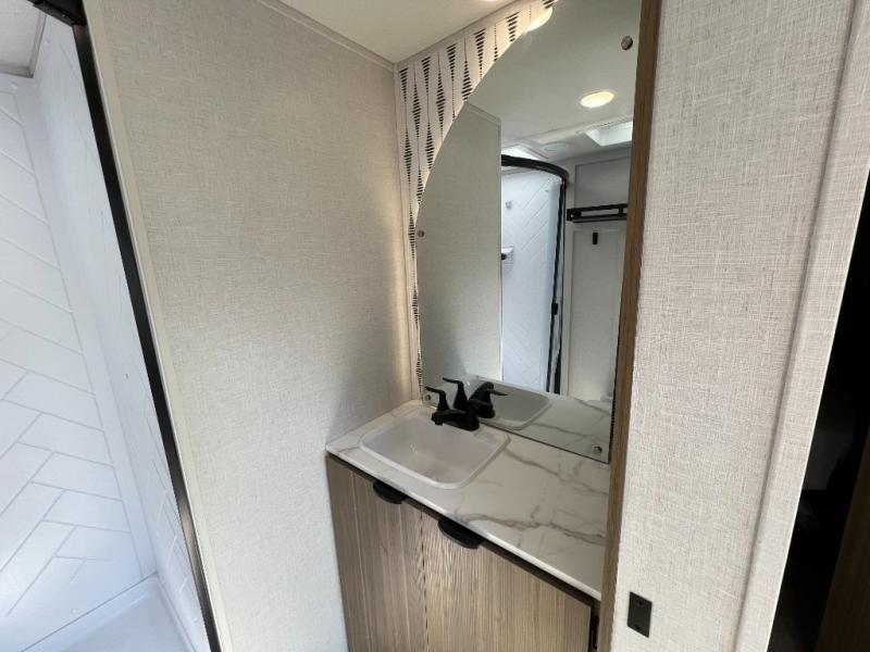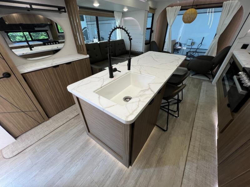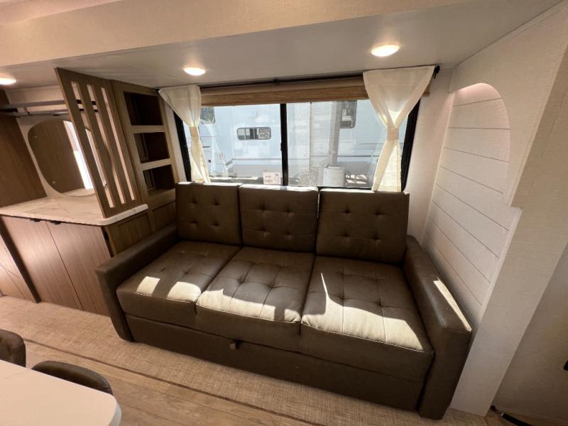 Find your zen int this spacious travel trailer for four! Once you've unloaded your gear, you can head inside to make lunch at the kitchen island with four chairs. An 80" trundle sofa provides additional seating space plus sleeping space for guests. You will love the rear custom recliners that are conveniently located next to the fireplace. The full bath is located towards the front next to the private bedroom so you can easily use the restroom at night, and you're sure to get a great night's rest on the custom king bed with Versa Tilt. This unit also includes washer and dryer prep, giving you the option to add these appliances.