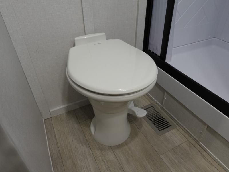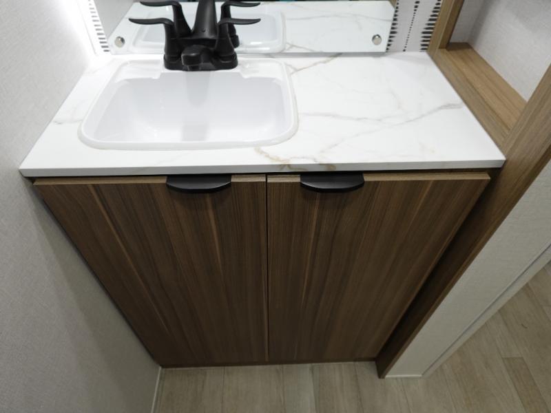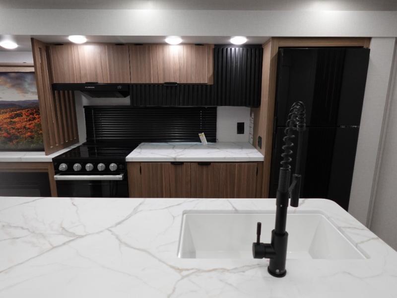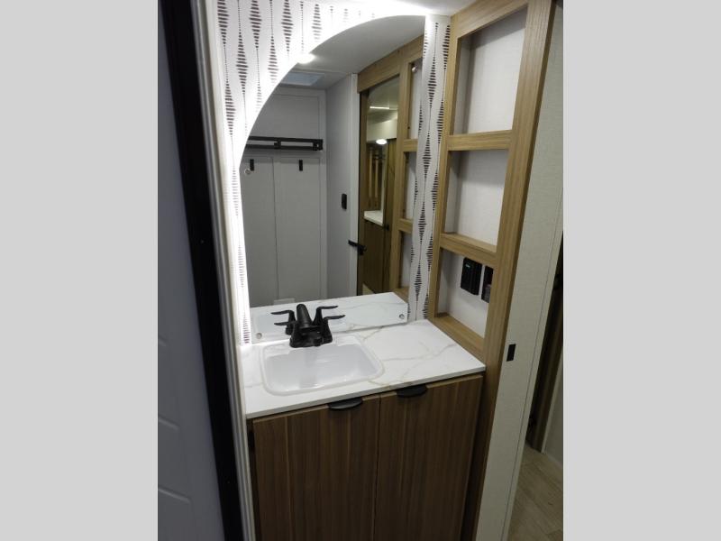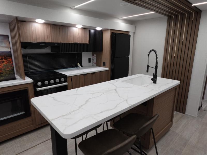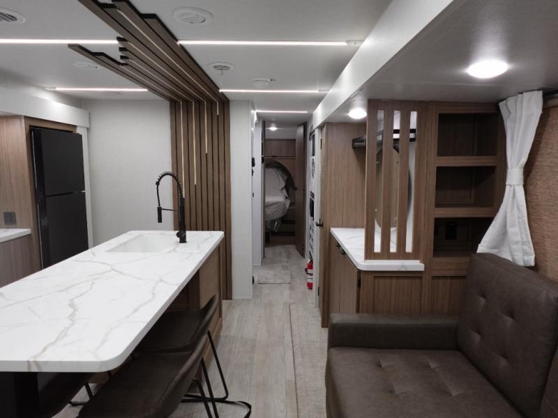Find your zen int this spacious travel trailer for four! Once you've unloaded your gear, you can head inside to make lunch at the kitchen island with four chairs. An 80" trundle sofa provides additional seating space plus sleeping space for guests. You will love the rear custom recliners that are conveniently located next to the fireplace. The full bath is located towards the front next to the private bedroom so you can easily use the restroom at night, and you're sure to get a great night's rest on the custom king bed with Versa Tilt. This unit also includes washer and dryer prep, giving you the option to add these appliances.