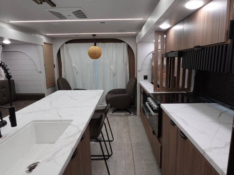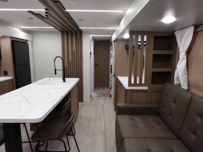 Find your zen int this spacious travel trailer for four! Once you've unloaded your gear, you can head inside to make lunch at the kitchen island with four chairs. An 80" trundle sofa provides additional seating space plus sleeping space for guests. You will love the rear custom recliners that are conveniently located next to the fireplace. The full bath is located towards the front next to the private bedroom so you can easily use the restroom at night, and you're sure to get a great night's rest on the custom king bed with Versa Tilt.