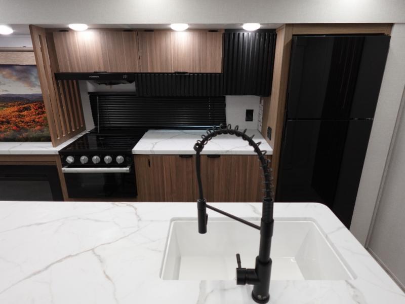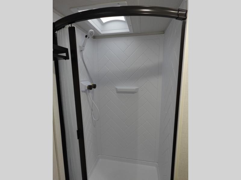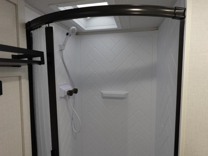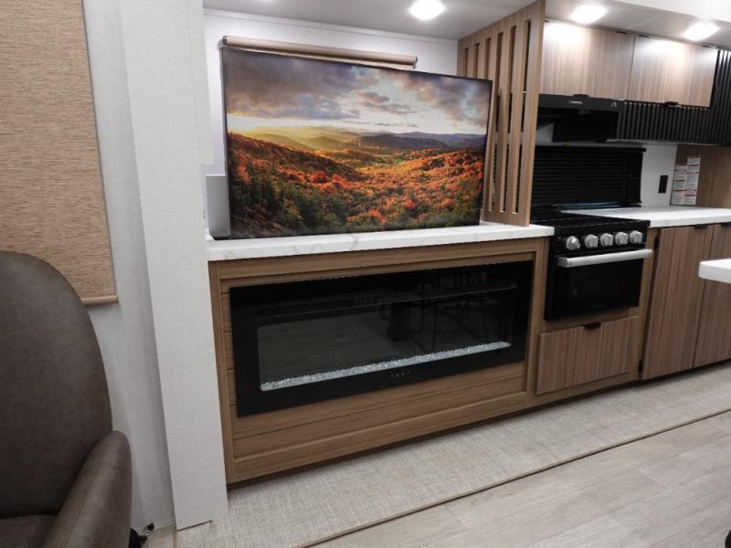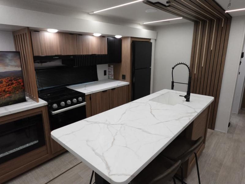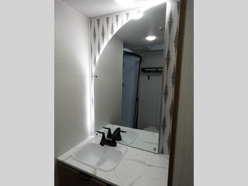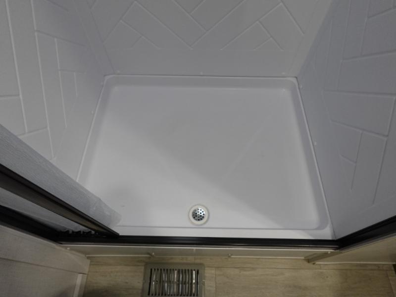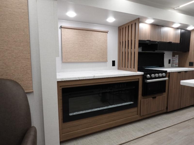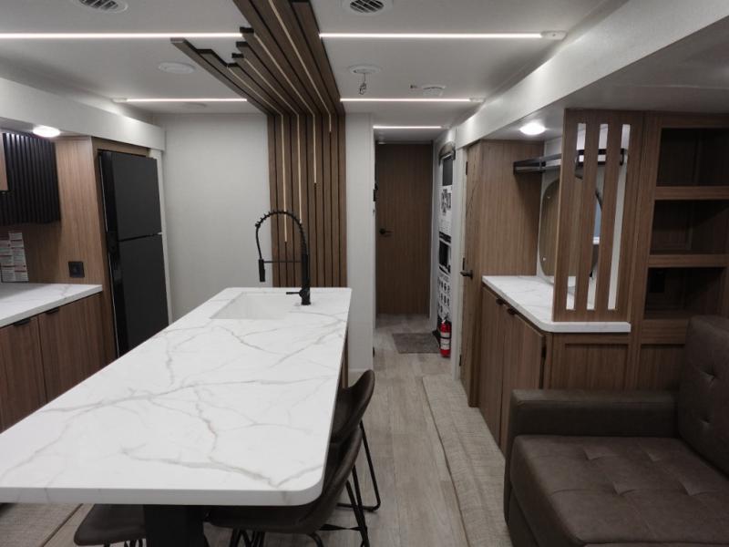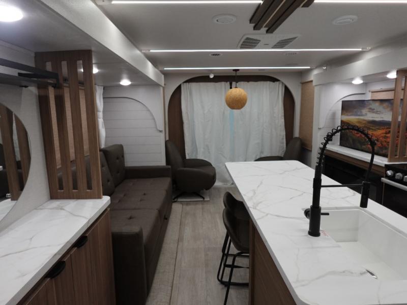 Find your zen int this spacious travel trailer for four! Once you've unloaded your gear, you can head inside to make lunch at the kitchen island with four chairs. An 80" trundle sofa provides additional seating space plus sleeping space for guests. You will love the rear custom recliners that are conveniently located next to the fireplace. The full bath is located towards the front next to the private bedroom so you can easily use the restroom at night, and you're sure to get a great night's rest on the custom king bed with Versa Tilt. This unit also includes washer and dryer prep, giving you the option to add these appliances.