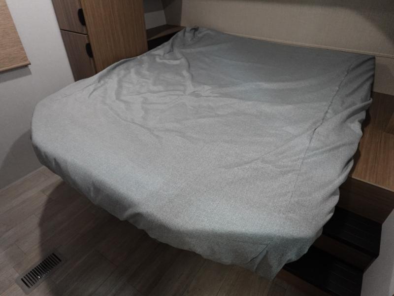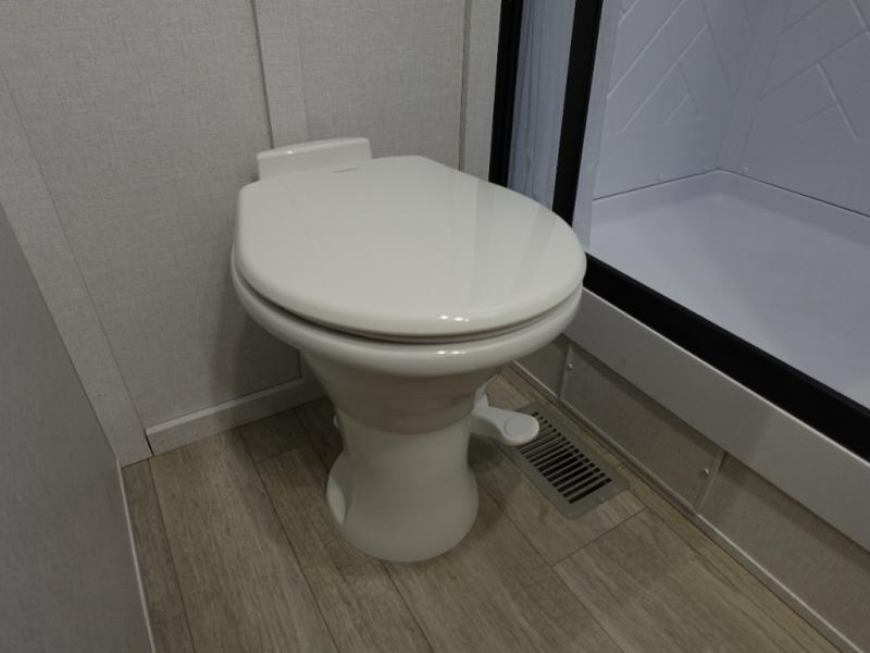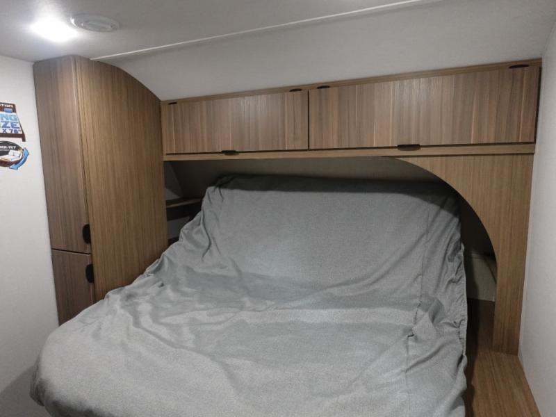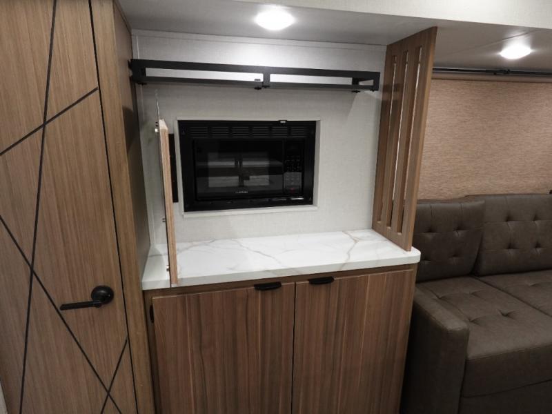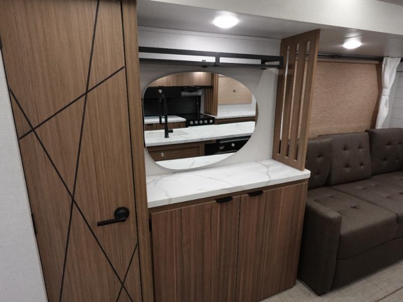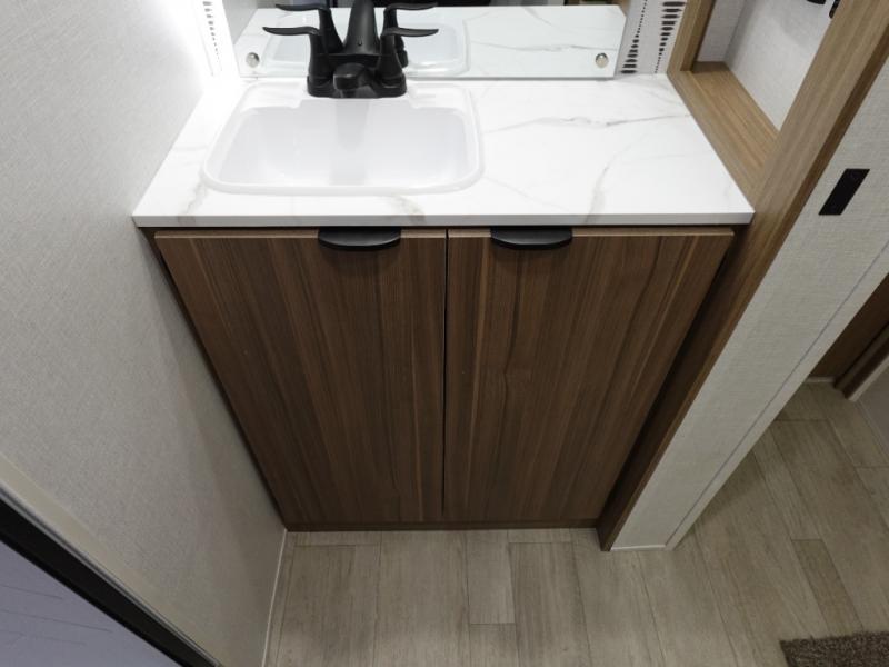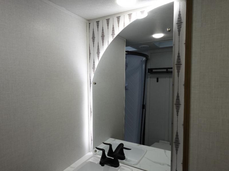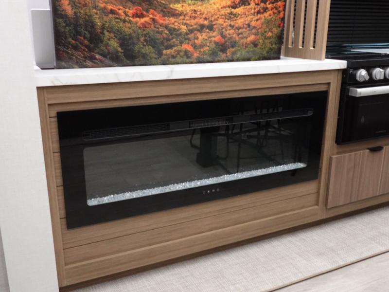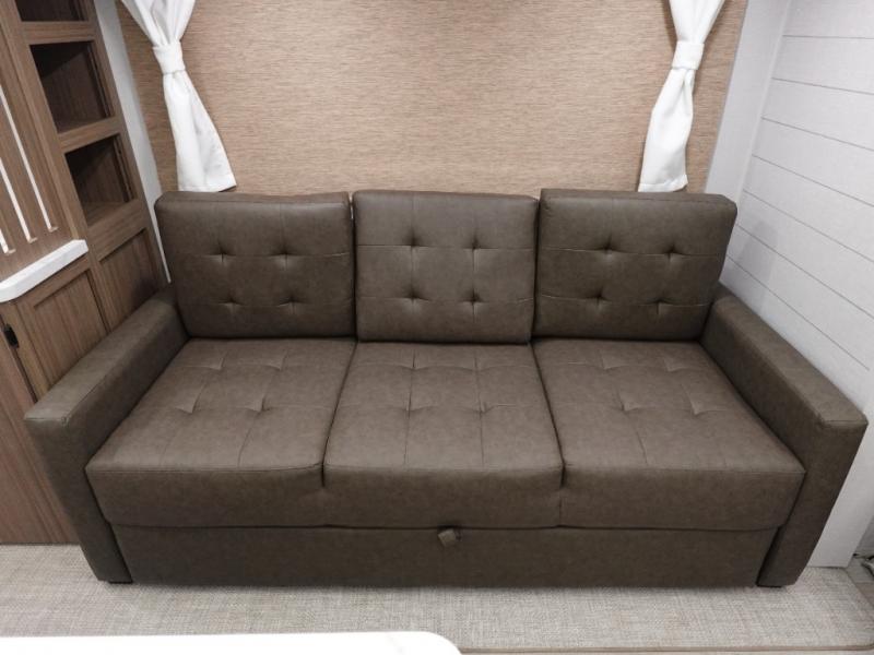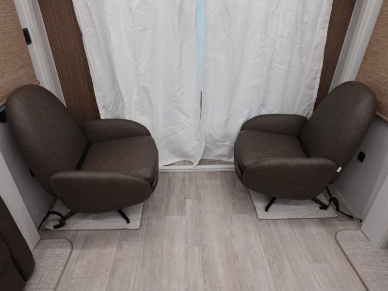 Find your zen int this spacious travel trailer for four! Once you've unloaded your gear, you can head inside to make lunch at the kitchen island with four chairs. An 80" trundle sofa provides additional seating space plus sleeping space for guests. You will love the rear custom recliners that are conveniently located next to the fireplace. The full bath is located towards the front next to the private bedroom so you can easily use the restroom at night, and you're sure to get a great night's rest on the custom king bed with Versa Tilt. This unit also includes washer and dryer prep, giving you the option to add these appliances.