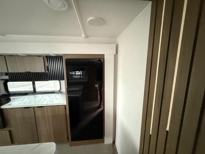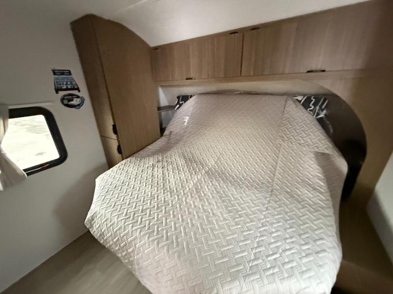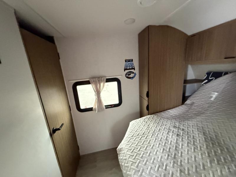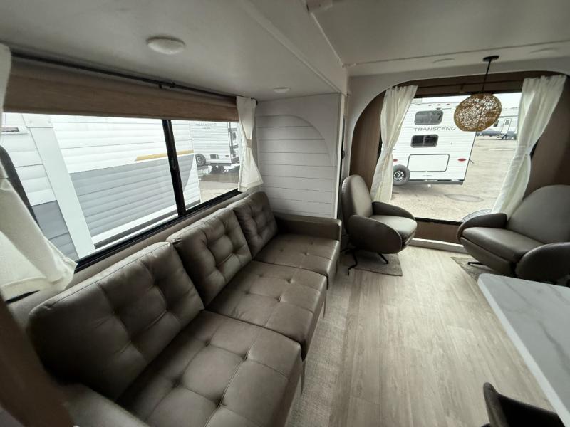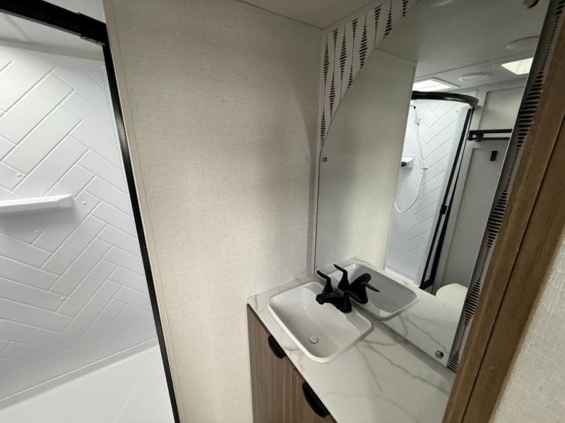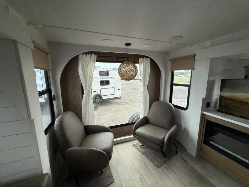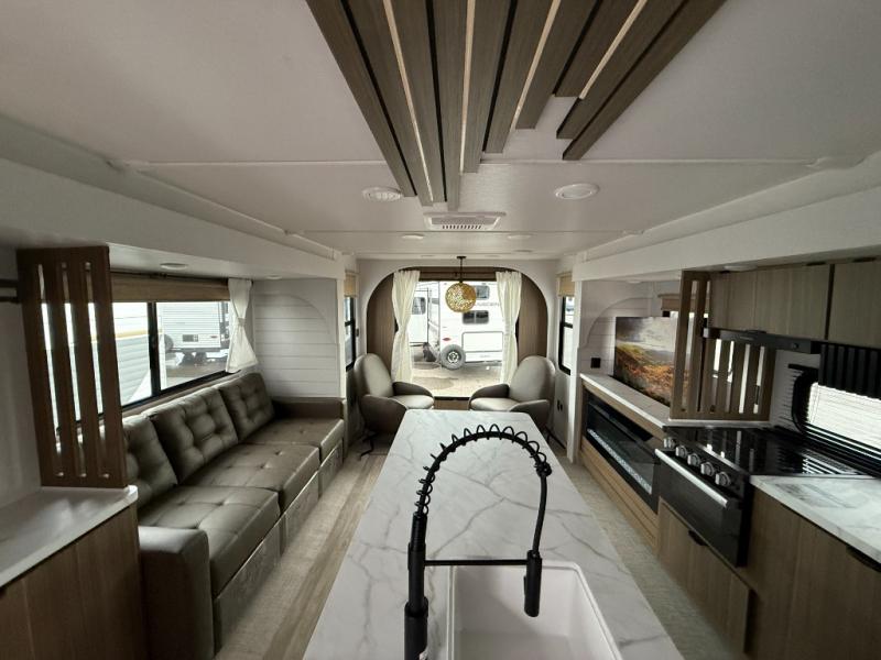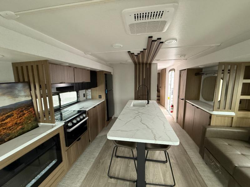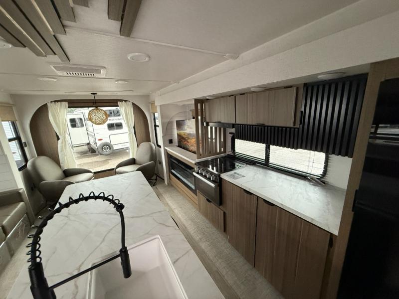 Find your zen int this spacious travel trailer for four! Once you've unloaded your gear, you can head inside to make lunch at the kitchen island with four chairs. An 80" trundle sofa provides additional seating space plus sleeping space for guests. You will love the rear custom recliners that are conveniently located next to the fireplace. The full bath is located towards the front next to the private bedroom so you can easily use the restroom at night, and you're sure to get a great night's rest on the custom king bed with Versa Tilt. This unit also includes washer and dryer prep, giving you the option to add these appliances.