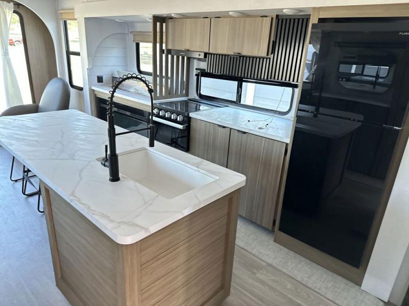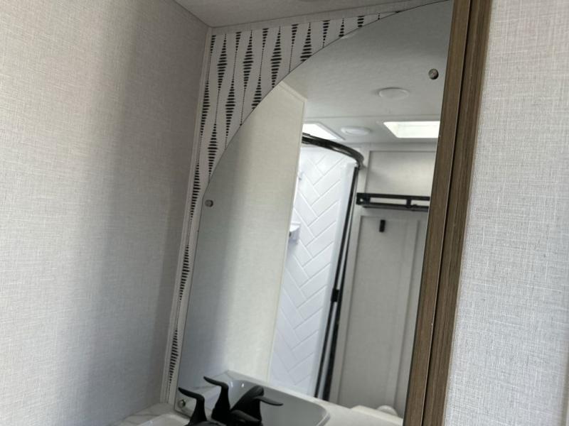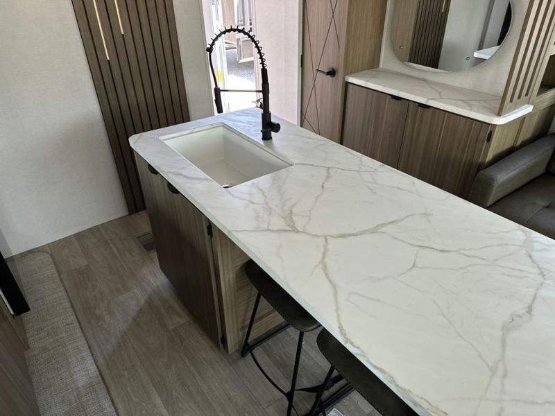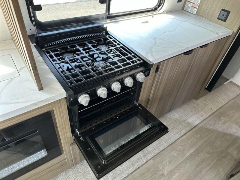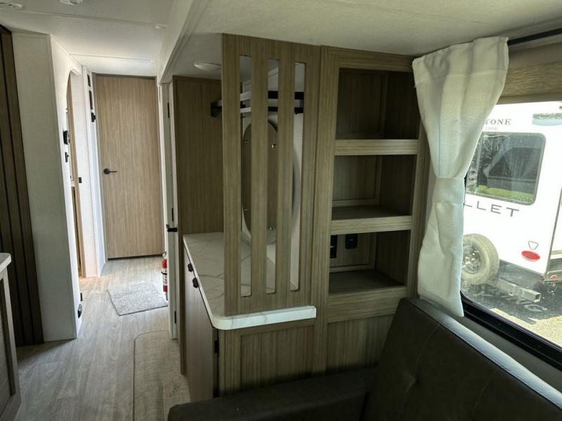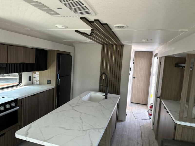Find your zen int this spacious travel trailer for four! Once you've unloaded your gear, you can head inside to make lunch at the kitchen island with four chairs. An 80" trundle sofa provides additional seating space plus sleeping space for guests. You will love the rear custom recliners that are conveniently located next to the fireplace. The full bath is located towards the front next to the private bedroom so you can easily use the restroom at night, and you're sure to get a great night's rest on the custom king bed with Versa Tilt. This unit also includes washer and dryer prep, giving you the option to add these appliances.