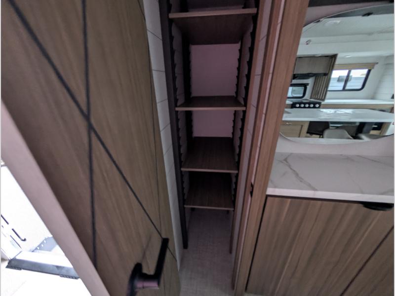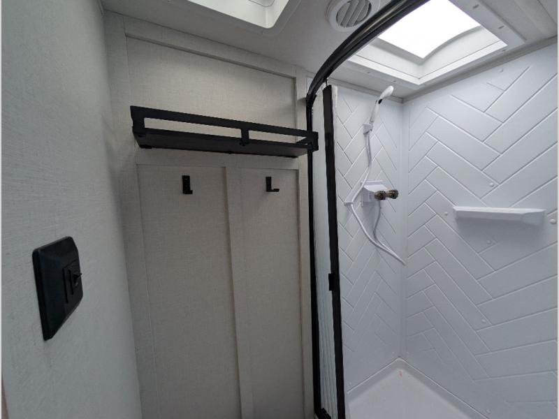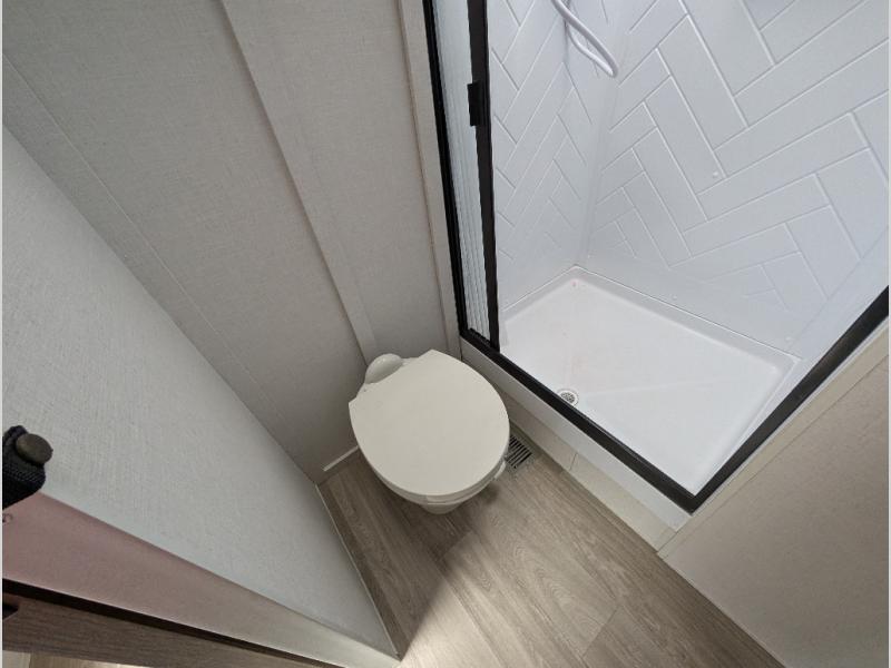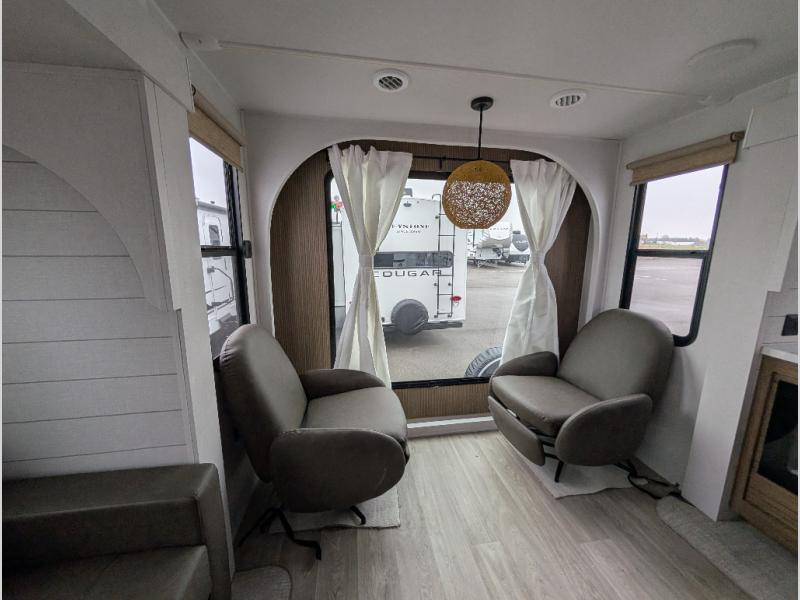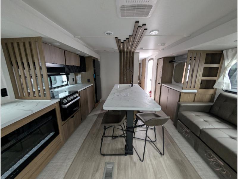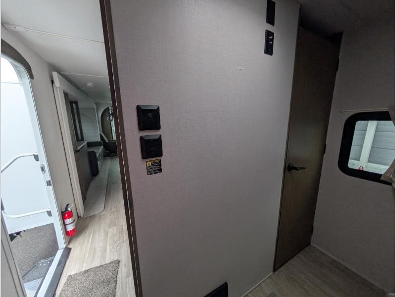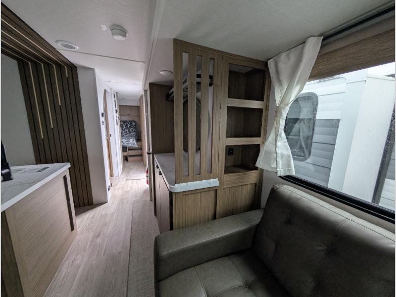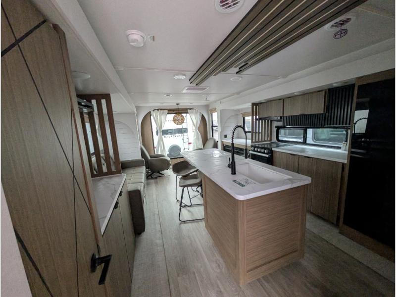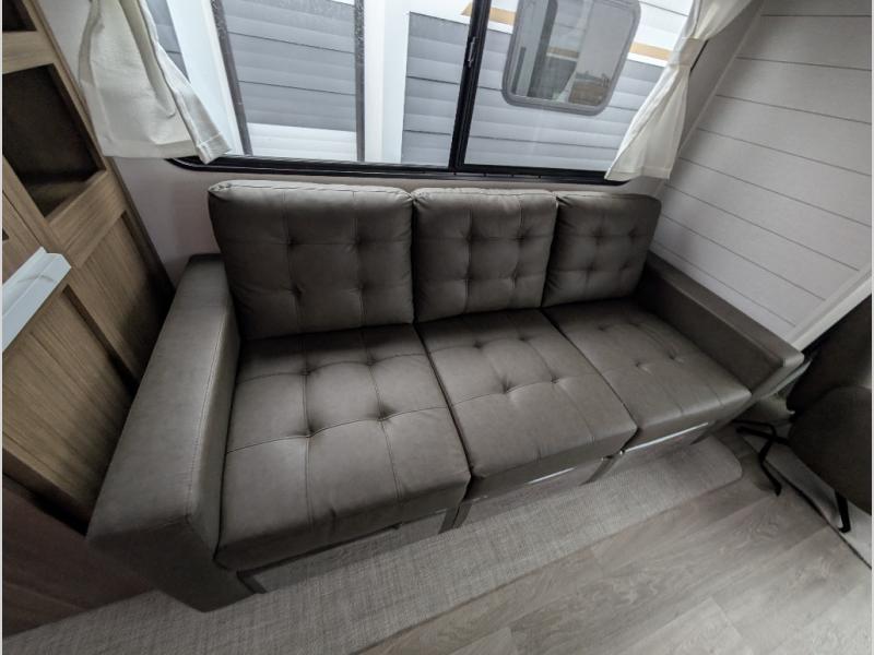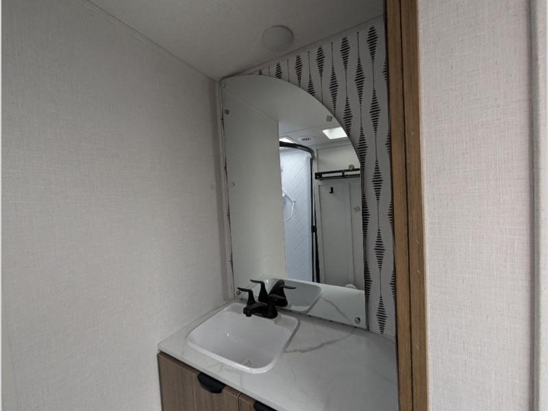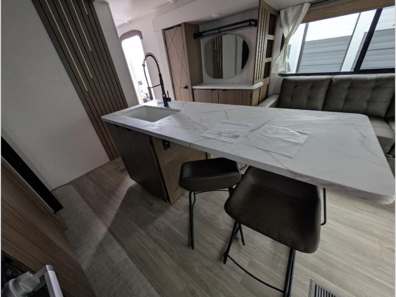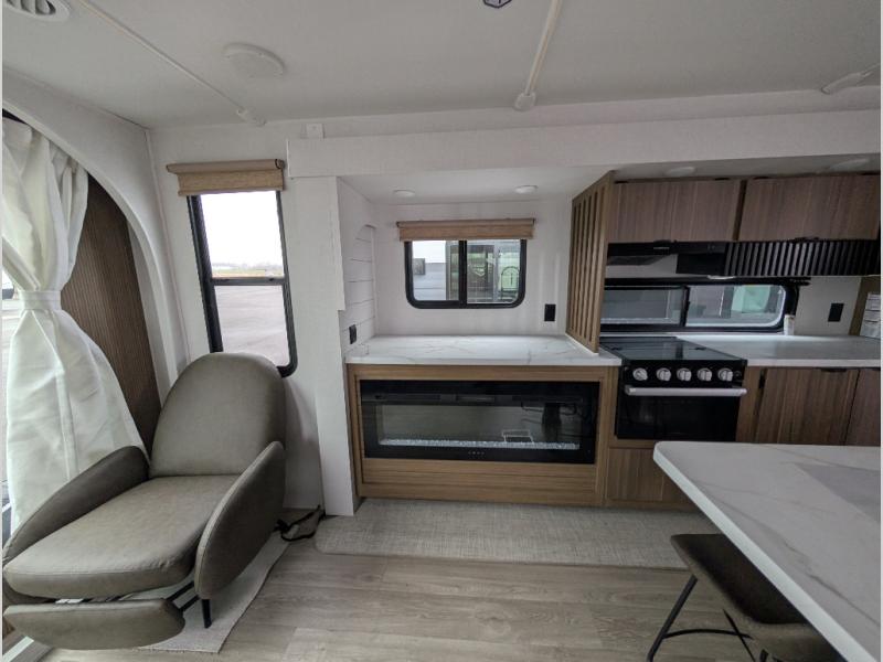 Find your zen int this spacious travel trailer for four! Once you've unloaded your gear, you can head inside to make lunch at the kitchen island with four chairs. An 80" trundle sofa provides additional seating space plus sleeping space for guests. You will love the rear custom recliners that are conveniently located next to the fireplace. The full bath is located towards the front next to the private bedroom so you can easily use the restroom at night, and you're sure to get a great night's rest on the custom king bed with Versa Tilt. This unit also includes washer and dryer prep, giving you the option to add these appliances.
