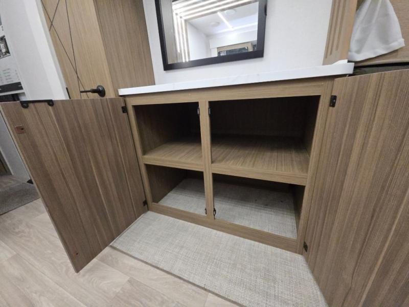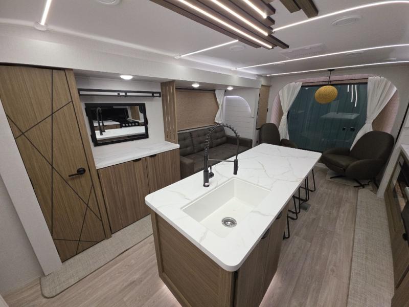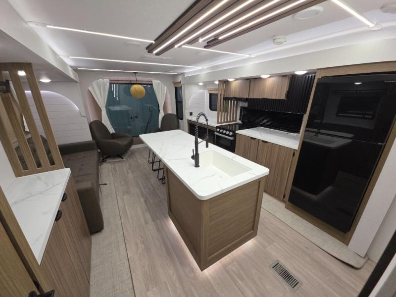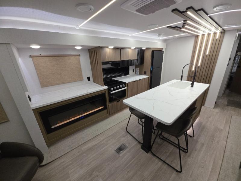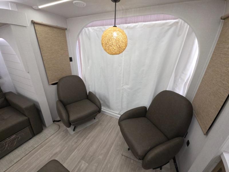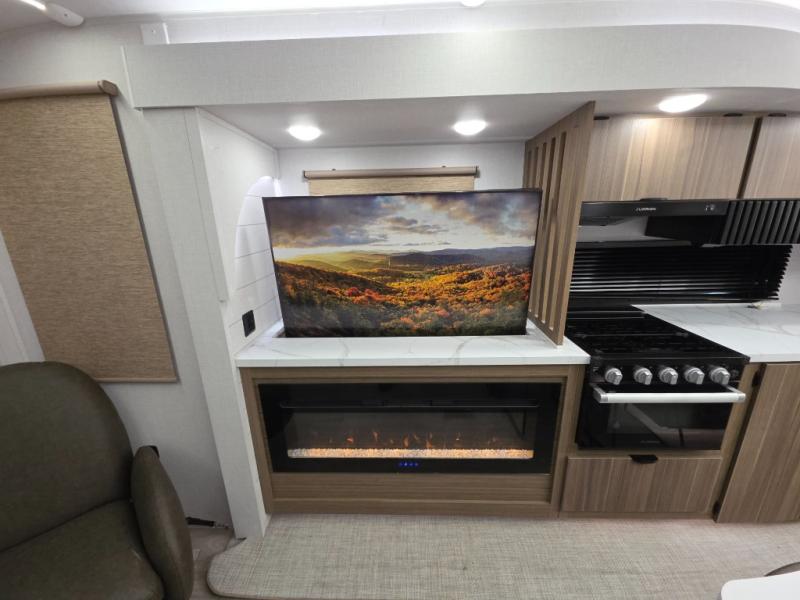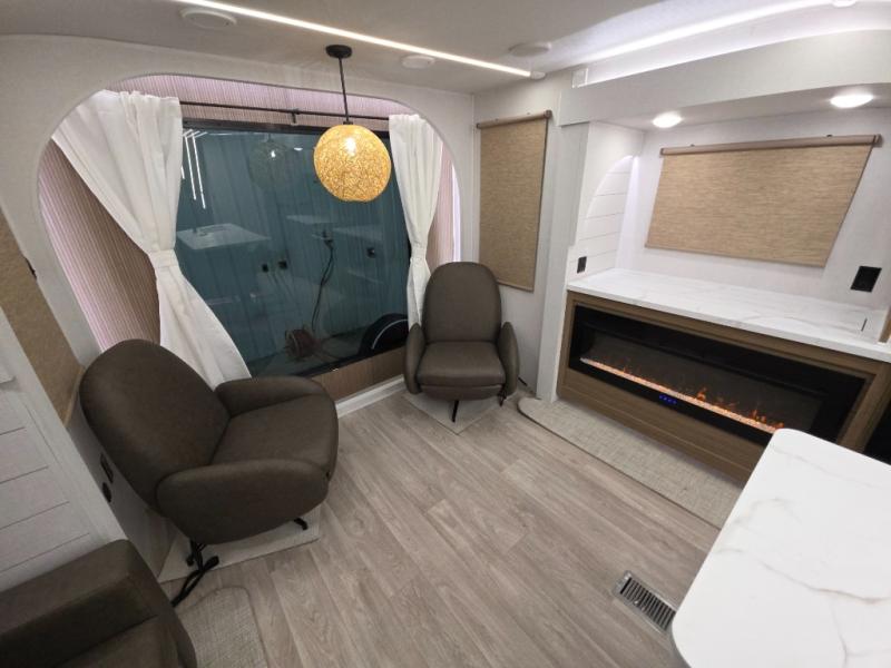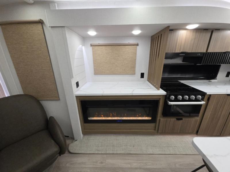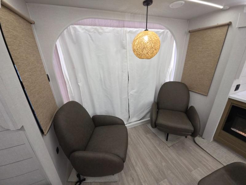 Find your zen int this spacious travel trailer for four! Once you've unloaded your gear, you can head inside to make lunch at the kitchen island with four chairs. An 80" trundle sofa provides additional seating space plus sleeping space for guests. You will love the rear custom recliners that are conveniently located next to the fireplace. The full bath is located towards the front next to the private bedroom so you can easily use the restroom at night, and you're sure to get a great night's rest on the custom king bed with Versa Tilt. This unit also includes washer and dryer prep, giving you the option to add these appliances.