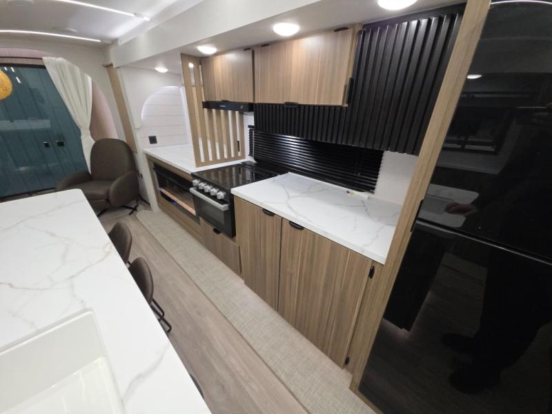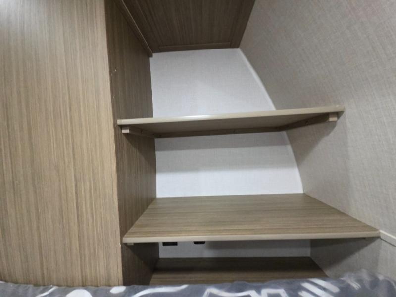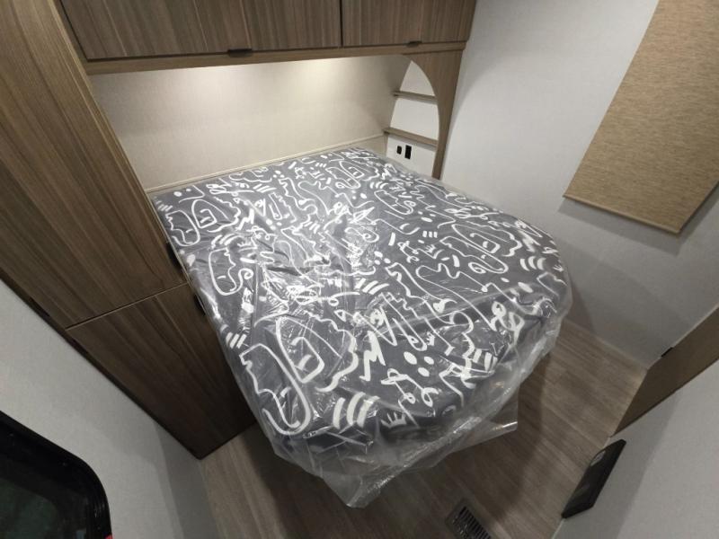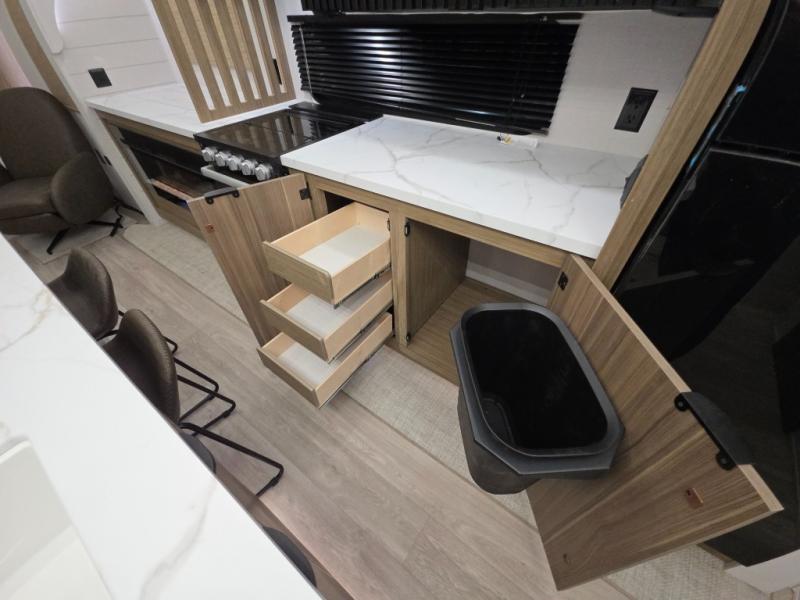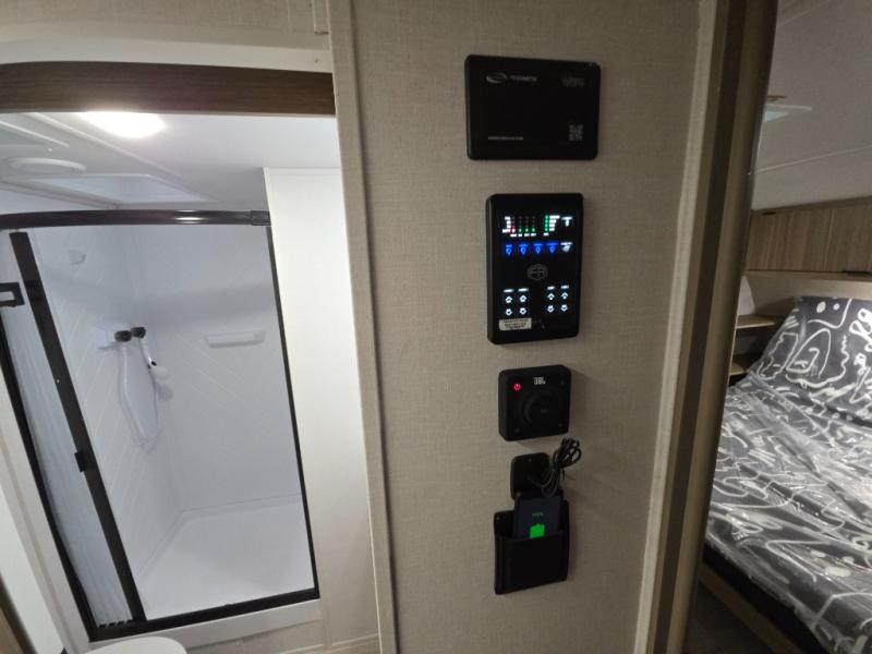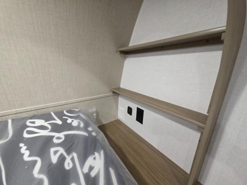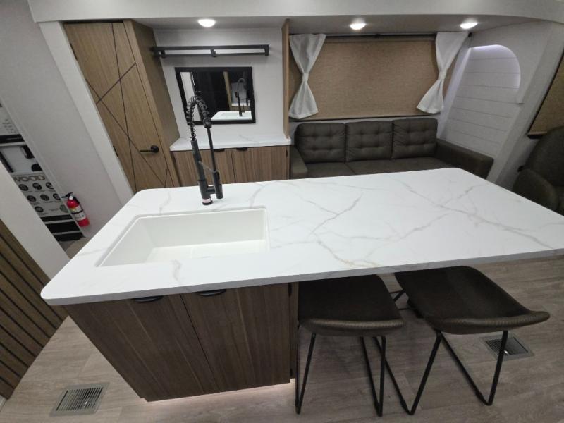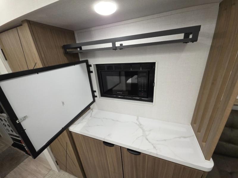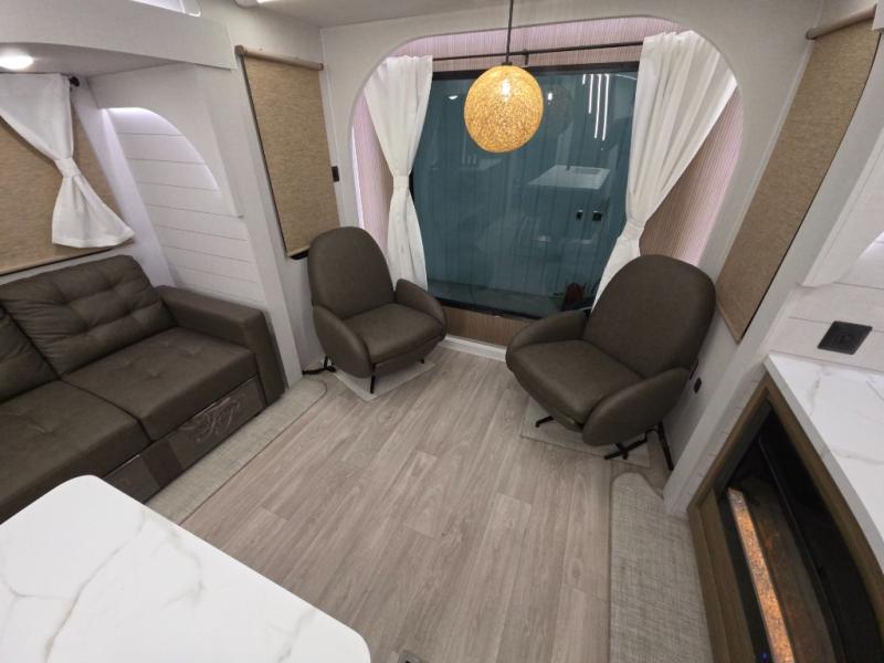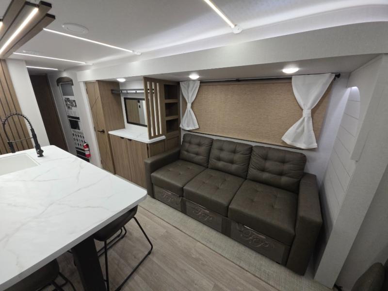 Find your zen int this spacious travel trailer for four! Once you've unloaded your gear, you can head inside to make lunch at the kitchen island with four chairs. An 80" trundle sofa provides additional seating space plus sleeping space for guests. You will love the rear custom recliners that are conveniently located next to the fireplace. The full bath is located towards the front next to the private bedroom so you can easily use the restroom at night, and you're sure to get a great night's rest on the custom king bed with Versa Tilt. This unit also includes washer and dryer prep, giving you the option to add these appliances.