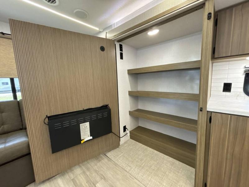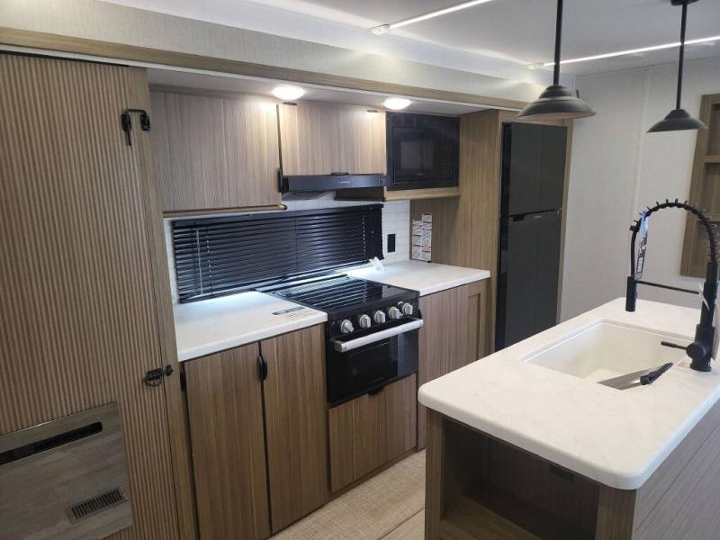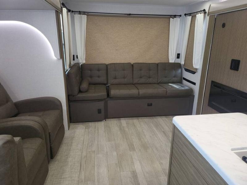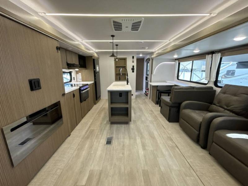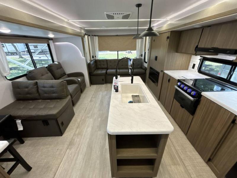 Pack up the kids and bring the dog along for a fun family vacation in this double-slide Wildwood travel trailer. This unit features a rear living area with a sofa and an entertainment center with a fireplace for a cozy evening. There is also a Versa Flex table and dual lounge chairs for more seating and work space. The kitchen island provides more counter space, and you will love having a pantry for canned goods or snacks. Up front, you'll find a Versa-Tilt custom king bed for a great night's rest, along with dual closets and a wardrobe with a washer/dryer prep option!