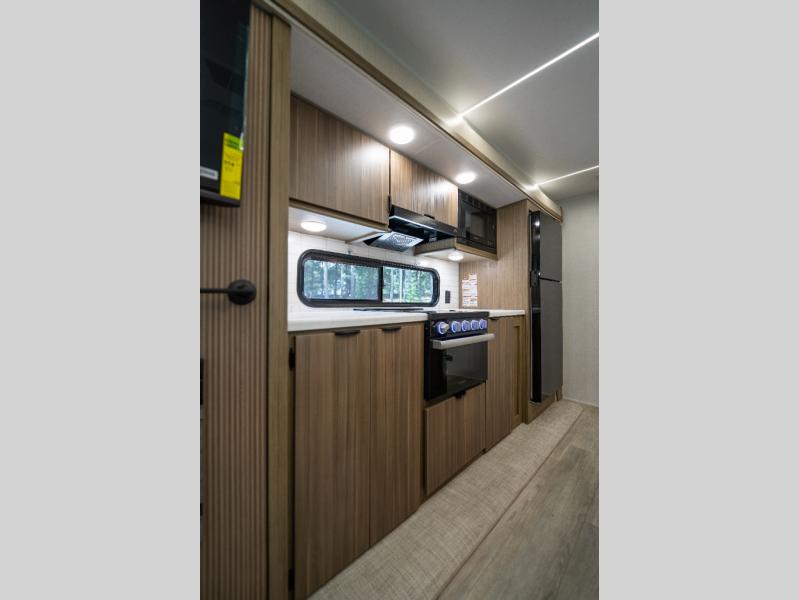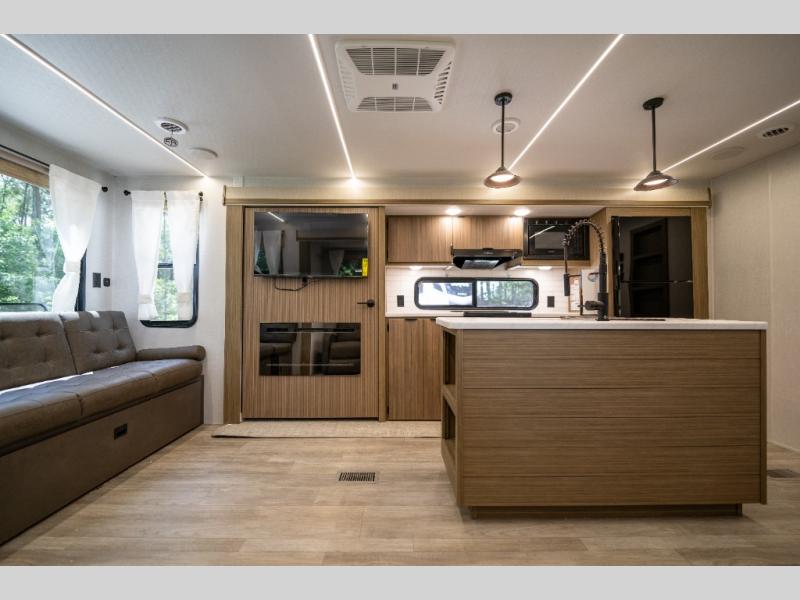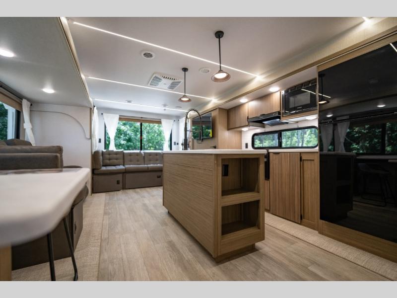 The central kitchen includes a residential refrigerator, three-burner cooktop, microwave, and a freestanding dinette or booth option, ideal for meal prep and dining. A walk-through bathroom with a radius shower connects to the front private bedroom, which includes a queen bed, wardrobe storage, and optional washer/dryer prep for longer stays.