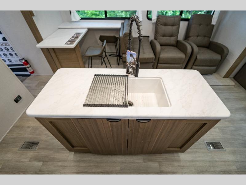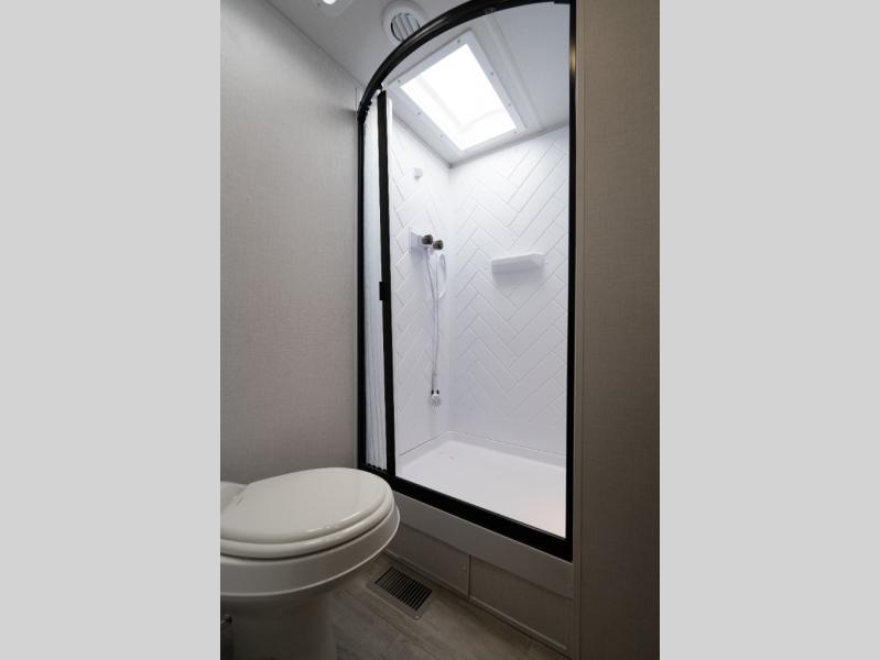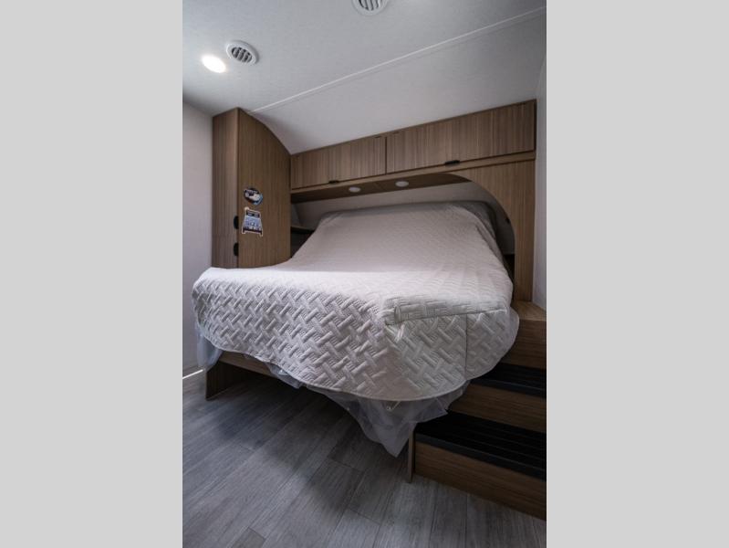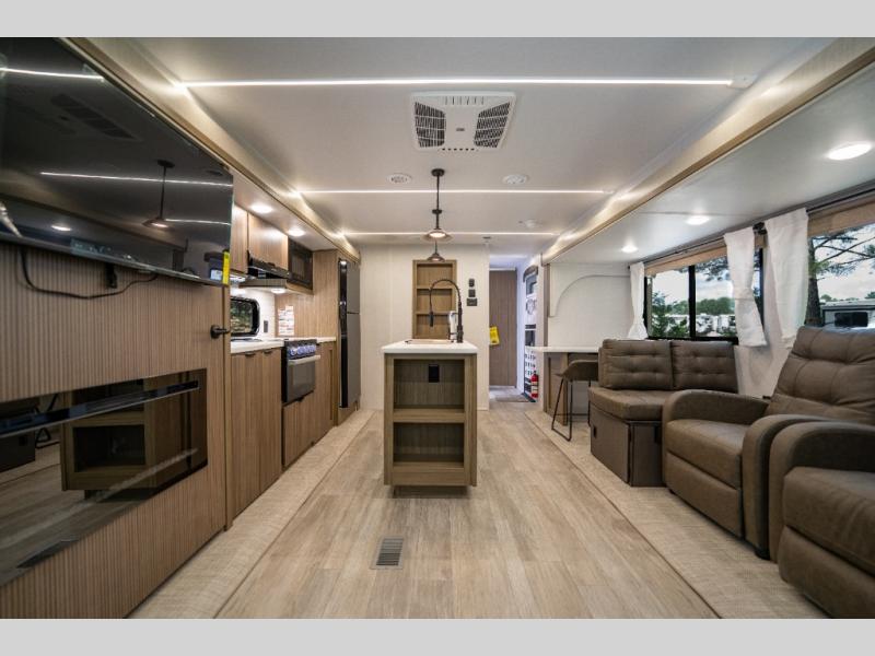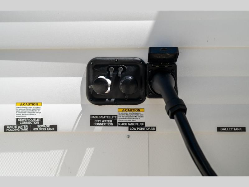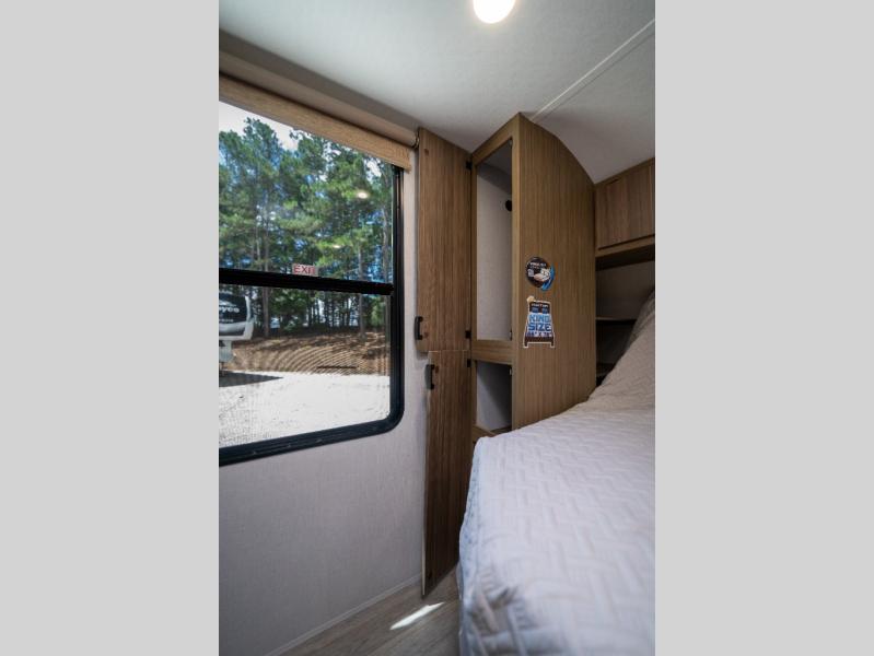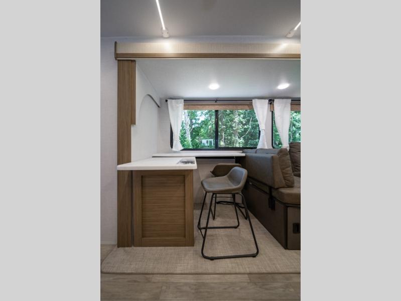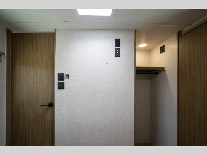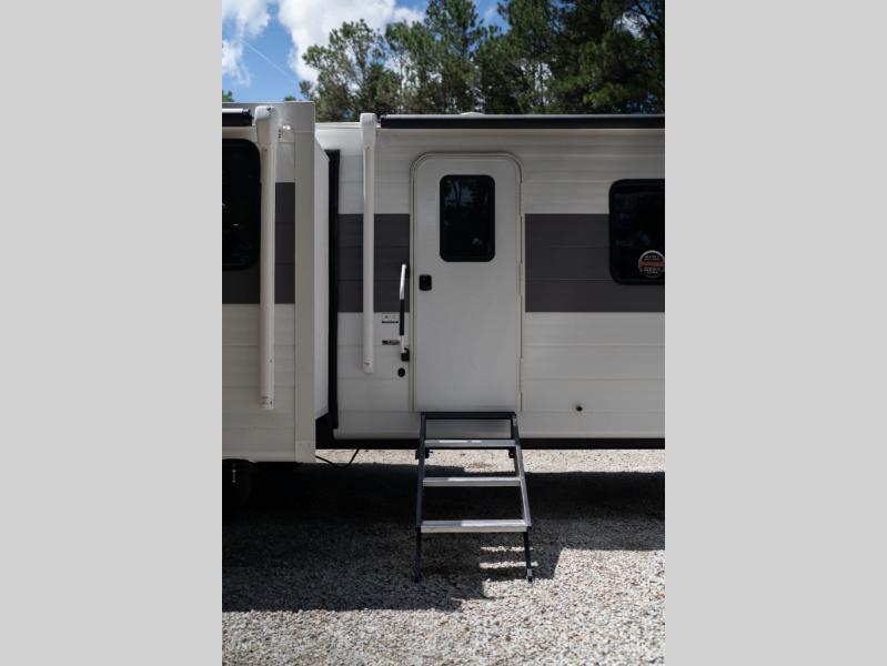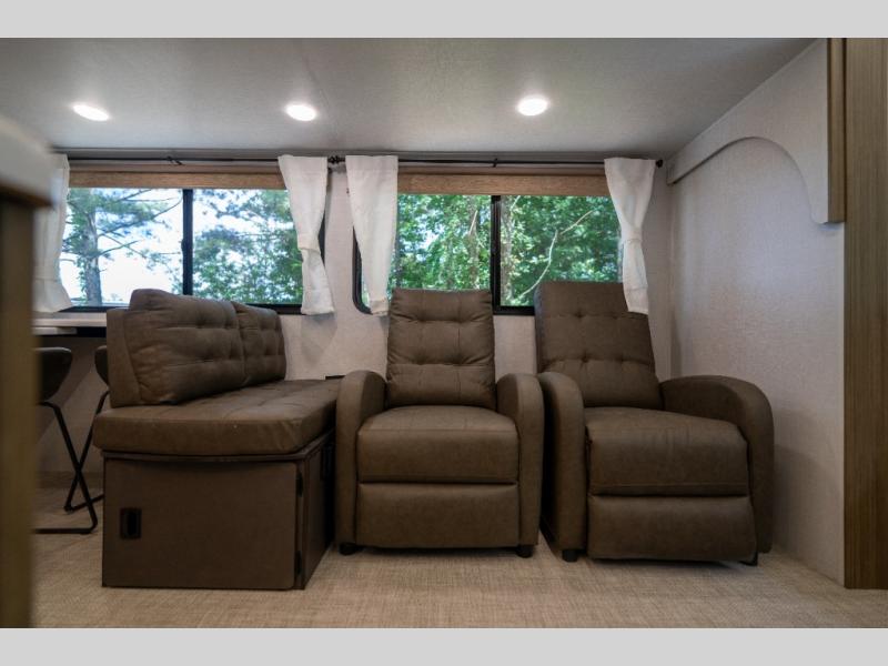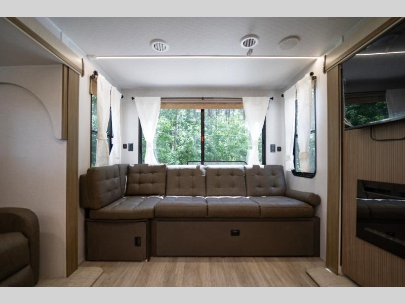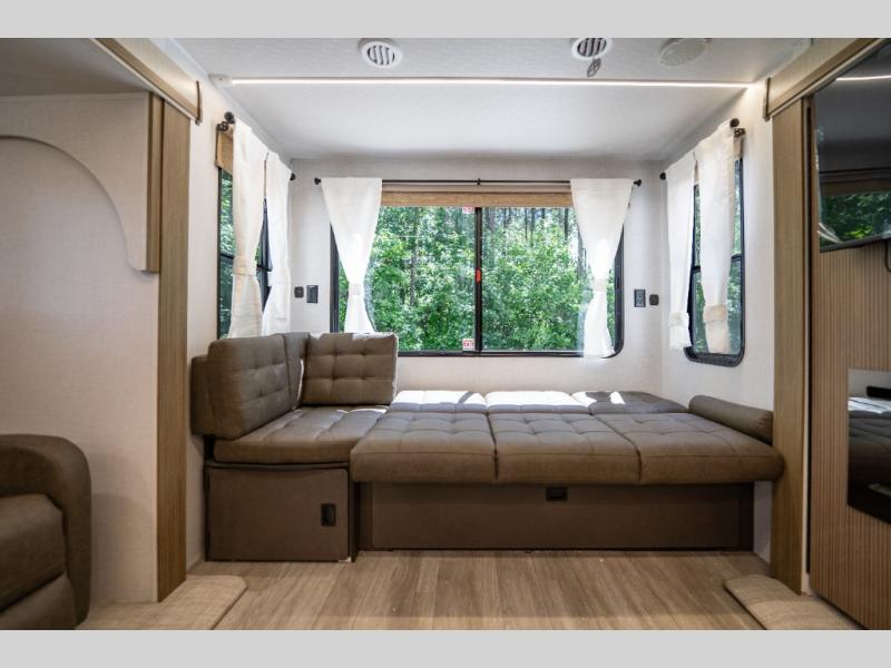 Exterior features include solid step entry, power awning, outdoor speakers, and pass-through storage, all built on Forest River’s dependable construction platform with upgraded insulation and modern aesthetics