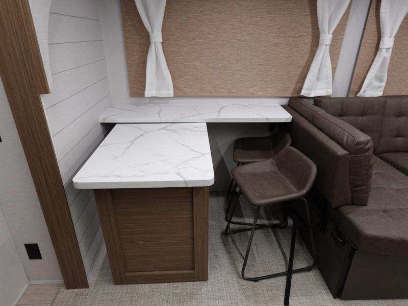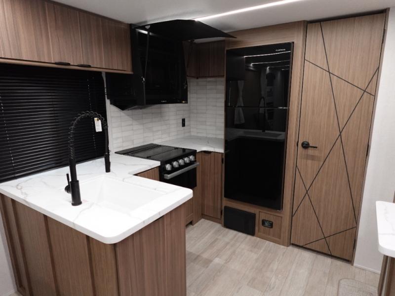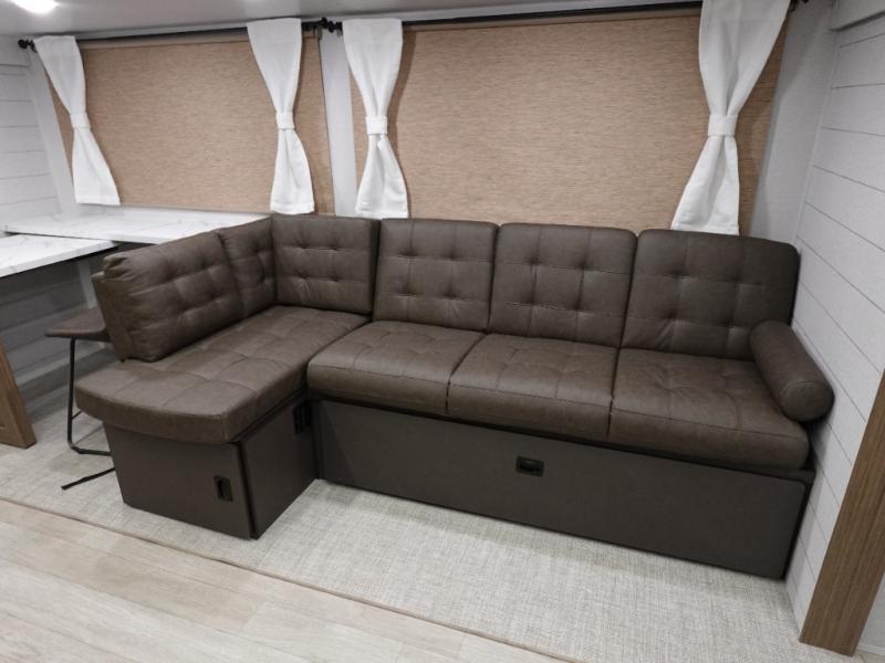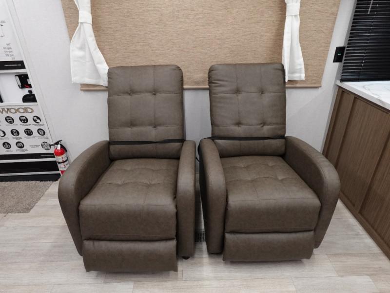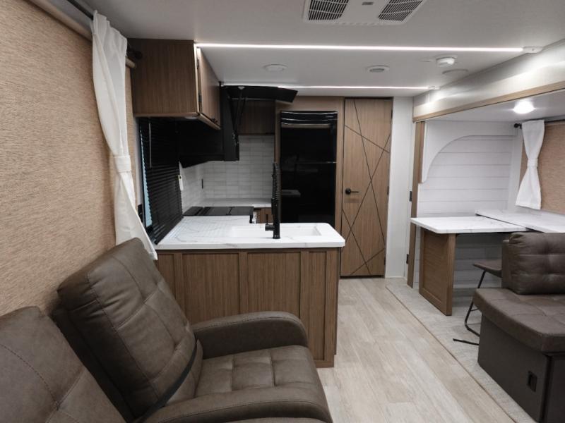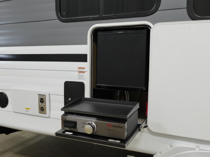 This Wildwood travel trailer is perfect for your family looking for a new adventure. You will enjoy the rear kitchen that includes an oversized refrigerator and cooktop. The Versa-Lounge will provide comfortable seating and sleeping space, and the Versa Flex table gives you a space to dine and work if needed. This unit also includes two lounge chairs so you'll feel right at home! You'll love the full bath in this unit, and the custom king bed with Versa-Tilt in the private bedroom is perfect for a good night's rest.