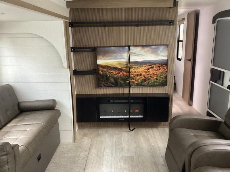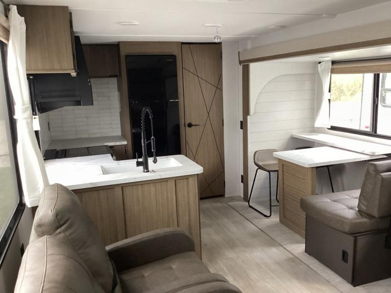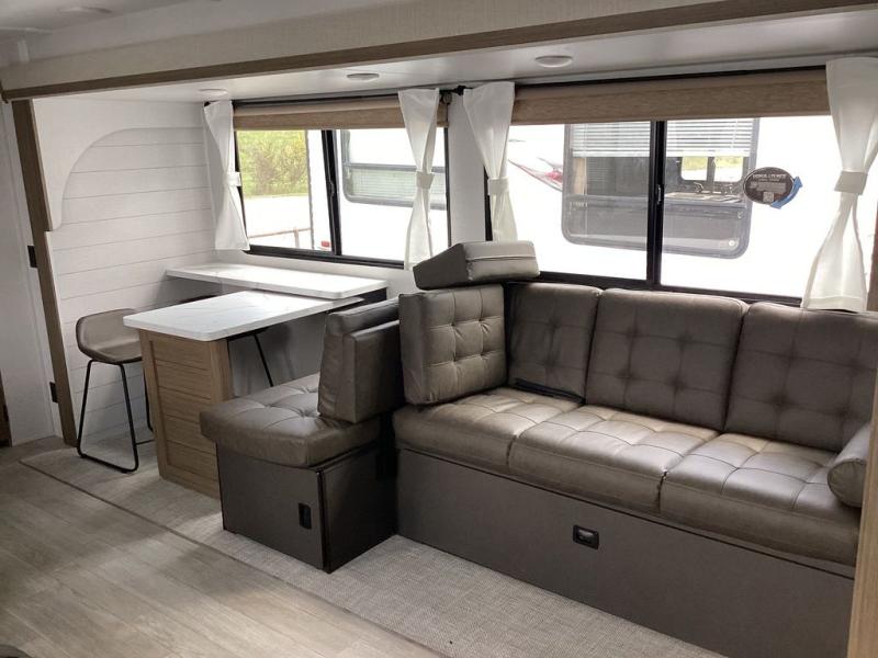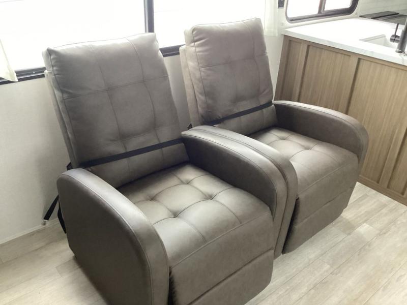 This Wildwood travel trailer is perfect for your family looking for a new adventure. You will enjoy the rear kitchen that includes an oversized refrigerator and cooktop. The Versa-Lounge will provide comfortable seating and sleeping space, and the Versa Flex table gives you a space to dine and work if needed. This unit also includes two lounge chairs so you'll feel right at home! You'll love the full bath in this unit, and the custom king bed with Versa-Tilt in the private bedroom is perfect for a good night's rest.