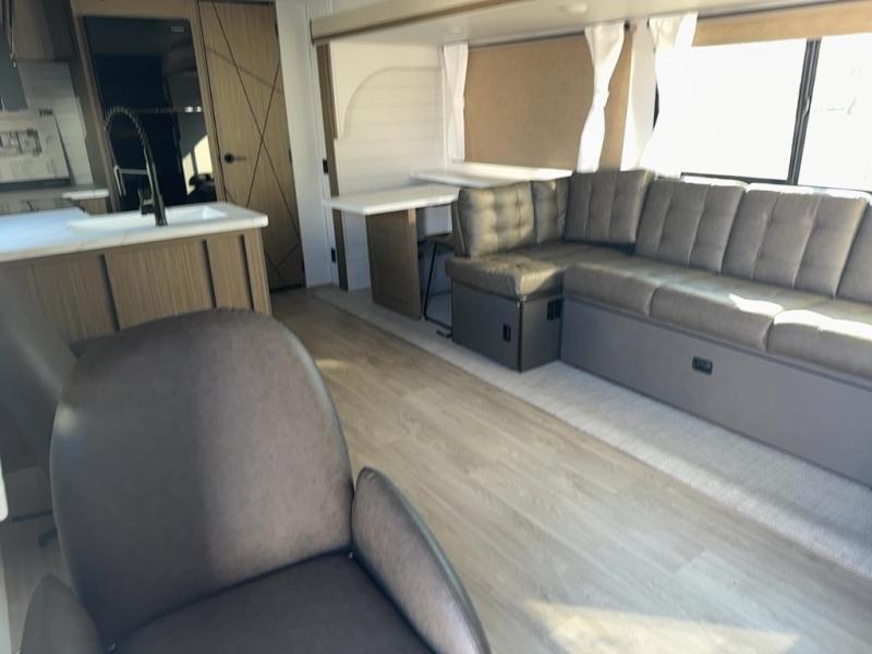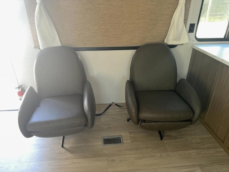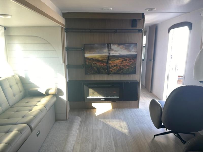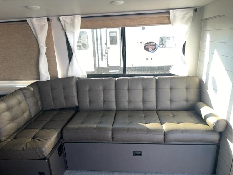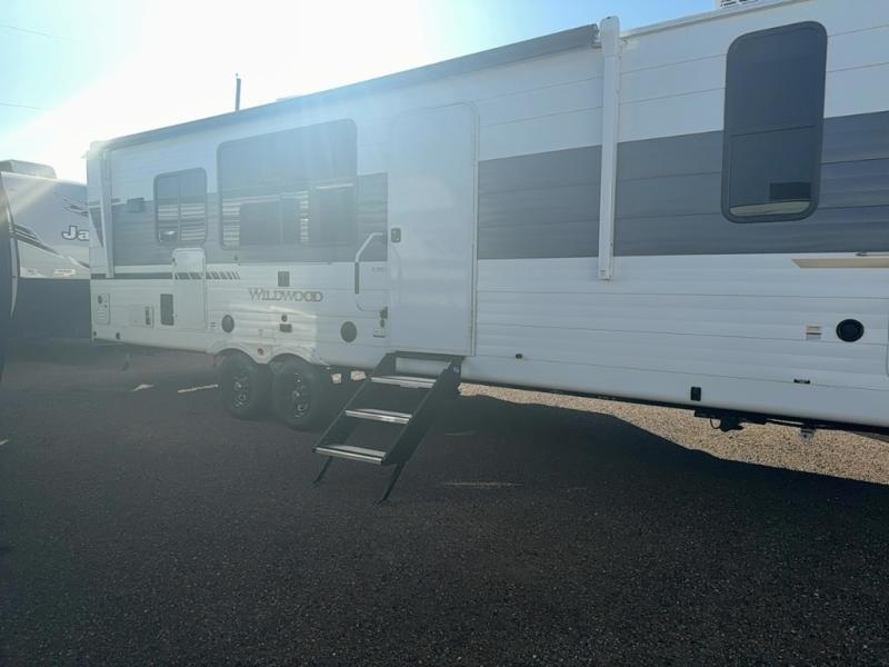 This Wildwood travel trailer is perfect for your family looking for a new adventure. You will enjoy the rear kitchen that includes an oversized refrigerator and cooktop. The Versa-Lounge will provide comfortable seating and sleeping space, and the Versa Flex table gives you a space to dine and work if needed. This unit also includes two lounge chairs so you'll feel right at home! You'll love the full bath in this unit, and the custom king bed with Versa-Tilt in the private bedroom is perfect for a good night's rest.