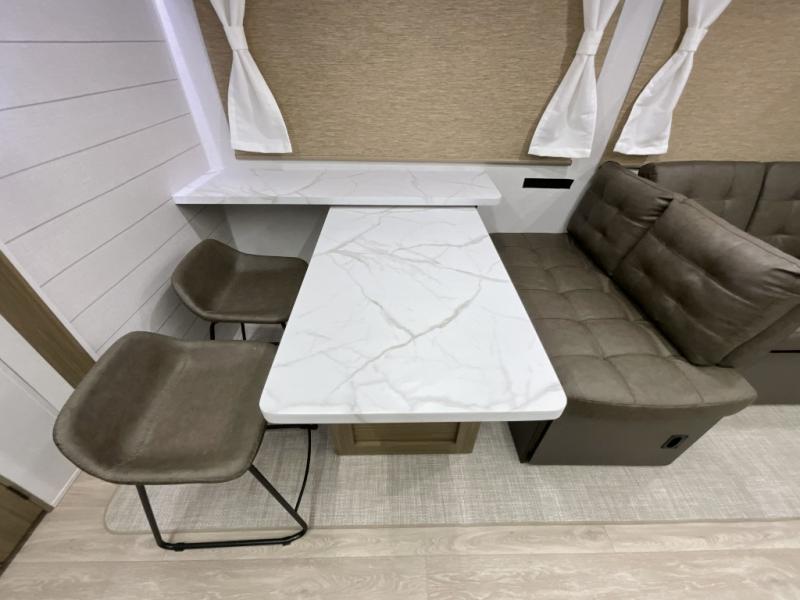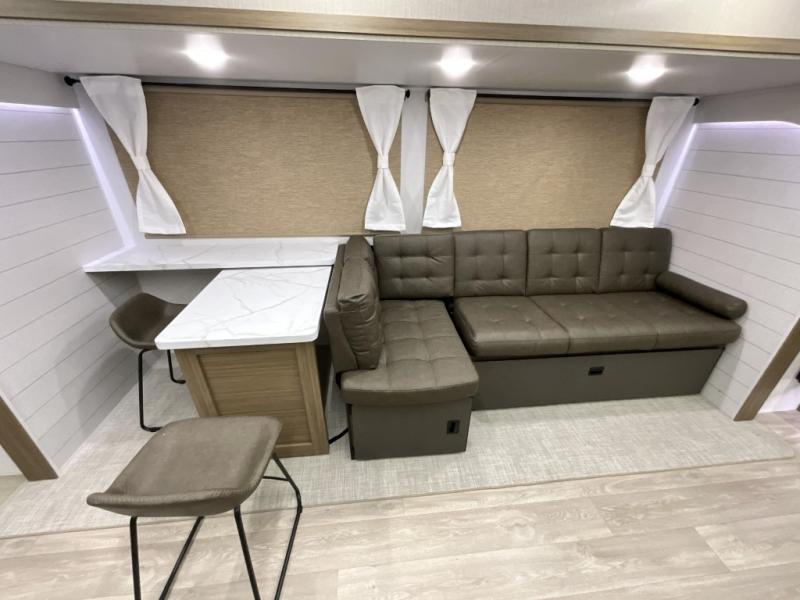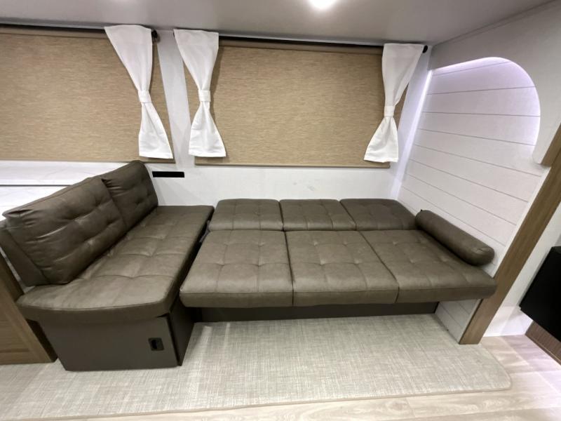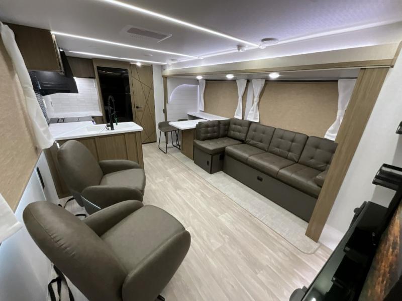 This Wildwood travel trailer is perfect for your family looking for a new adventure. You will enjoy the rear kitchen that includes an oversized refrigerator and cooktop. The Versa-Lounge will provide comfortable seating and sleeping space, and the Versa Flex table gives you a space to dine and work if needed. This unit also includes two lounge chairs so you'll feel right at home! You'll love the full bath in this unit, and the custom king bed with Versa-Tilt in the private bedroom is perfect for a good night's rest.