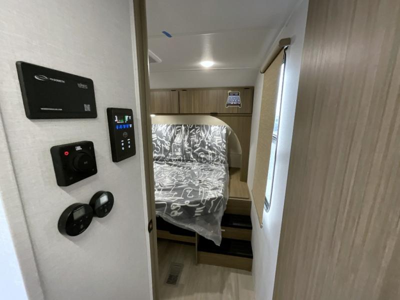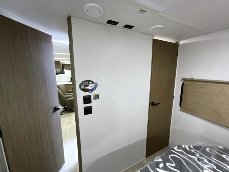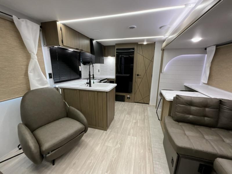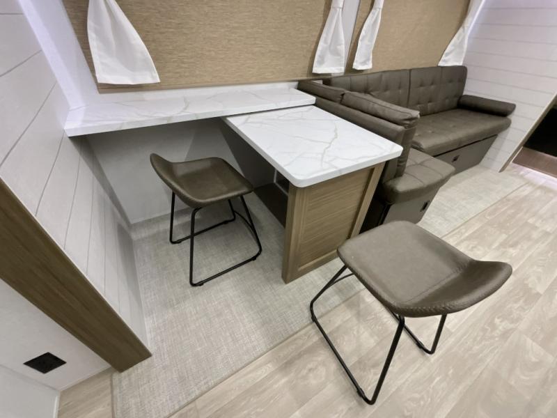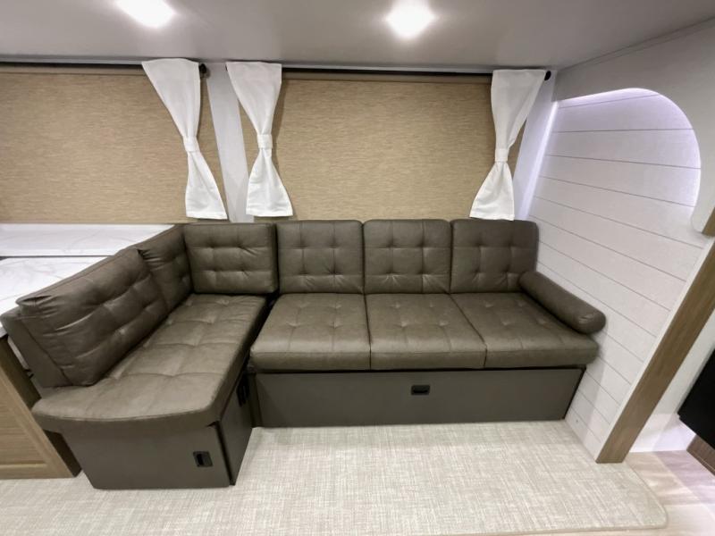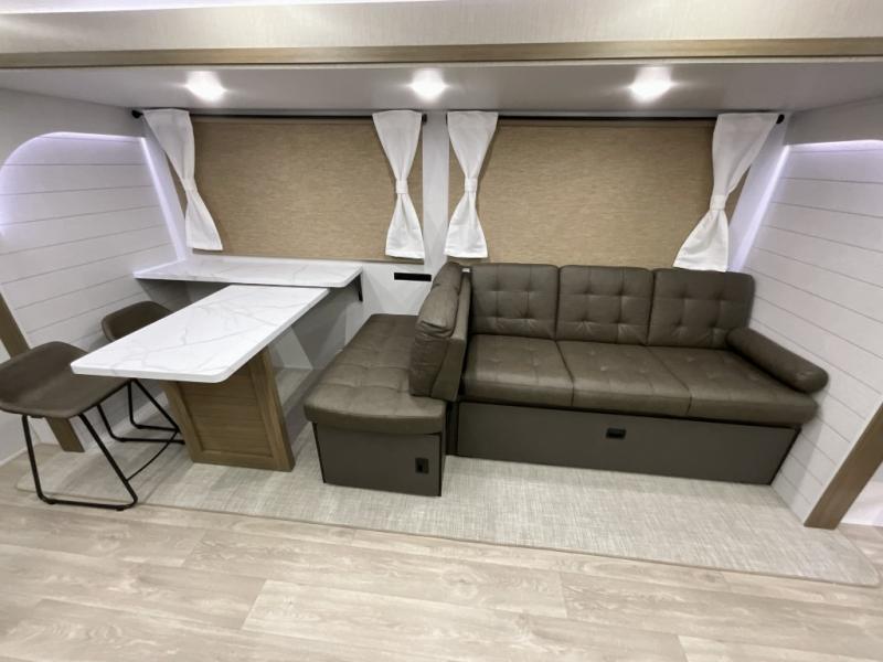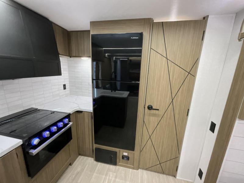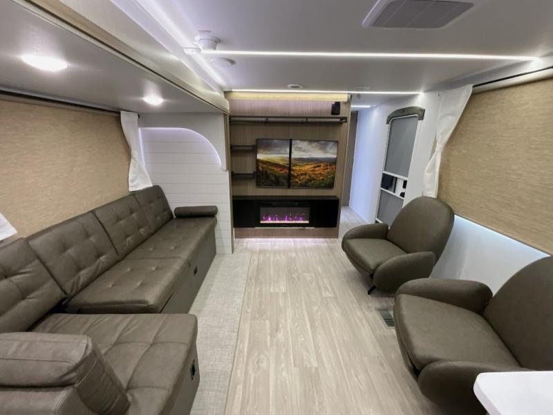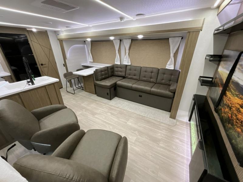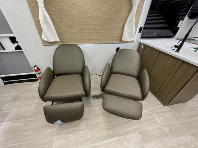 This Wildwood travel trailer is perfect for your family looking for a new adventure. You will enjoy the rear kitchen that includes an oversized refrigerator and cooktop. The Versa-Lounge will provide comfortable seating and sleeping space, and the Versa Flex table gives you a space to dine and work if needed. This unit also includes two lounge chairs so you'll feel right at home! You'll love the full bath in this unit, and the custom king bed with Versa-Tilt in the private bedroom is perfect for a good night's rest.