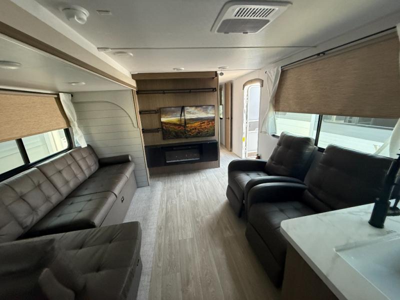 This Wildwood travel trailer is perfect for your family looking for a new adventure. You will enjoy the rear kitchen that includes an oversized refrigerator and cooktop. The Versa-Lounge will provide comfortable seating and sleeping space, and the Versa Flex table gives you a space to dine and work if needed. This unit also includes two lounge chairs so you'll feel right at home! You'll love the full bath in this unit, and the custom king bed with Versa-Tilt in the private bedroom is perfect for a good night's rest.