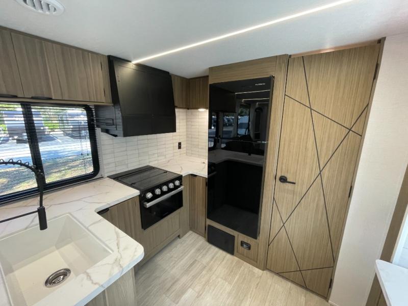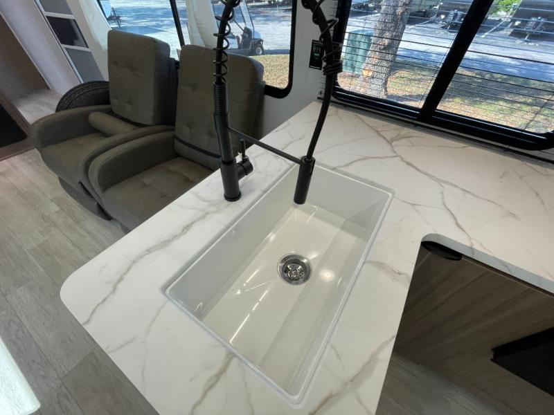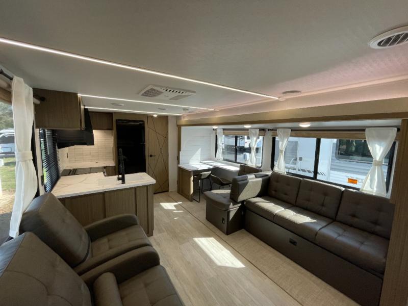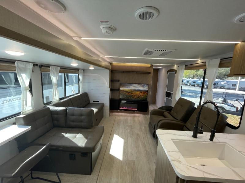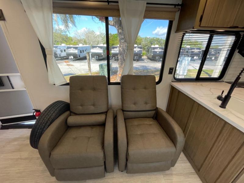 This Wildwood travel trailer is perfect for your family looking for a new adventure. You will enjoy the rear kitchen that includes an oversized refrigerator and cooktop. The Versa-Lounge will provide comfortable seating and sleeping space, and the Versa Flex table gives you a space to dine and work if needed. This unit also includes two lounge chairs so you'll feel right at home! You'll love the full bath in this unit, and the custom king bed with Versa-Tilt in the private bedroom is perfect for a good night's rest.