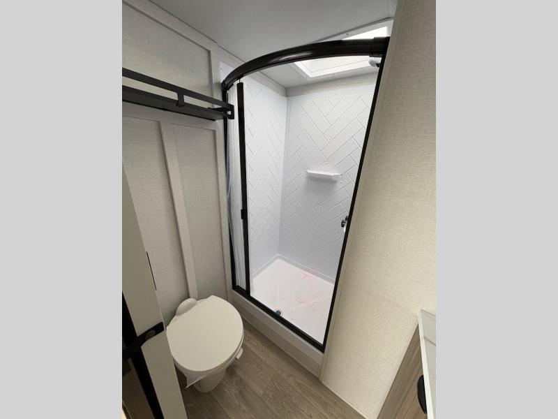 This Wildwood travel trailer is perfect for your family looking for a new adventure. You will enjoy the rear kitchen that includes a refrigerator and cooktop. The Versa-Lounge will provide comfortable seating and sleeping space, and the Versa Flex table gives you a space to dine and work if needed. This unit also includes two lounge chairs, so you'll feel right at home! You'll love the full bath in this unit, and the custom king bed with Versa-Tilt in the private bedroom is perfect for a good night's rest.