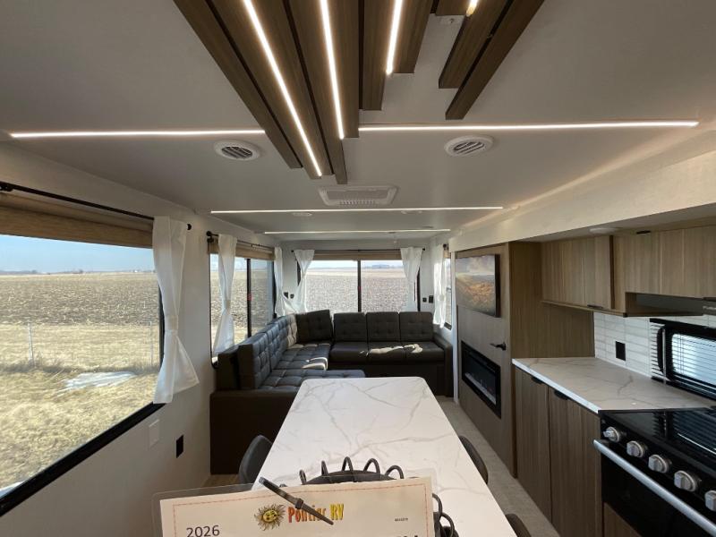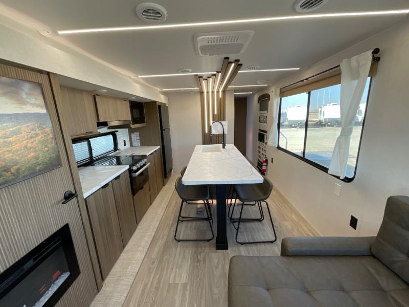 This Wildwood travel trailer is perfect for your family looking for a new adventure. You will enjoy the rear kitchen that includes a refrigerator and cooktop. The Versa-Lounge will provide comfortable seating and sleeping space, and the Versa Flex table gives you a space to dine and work if needed. This unit also includes two lounge chairs, so you'll feel right at home! You'll love the full bath in this unit, and the custom king bed with Versa-Tilt in the private bedroom is perfect for a good night's rest.