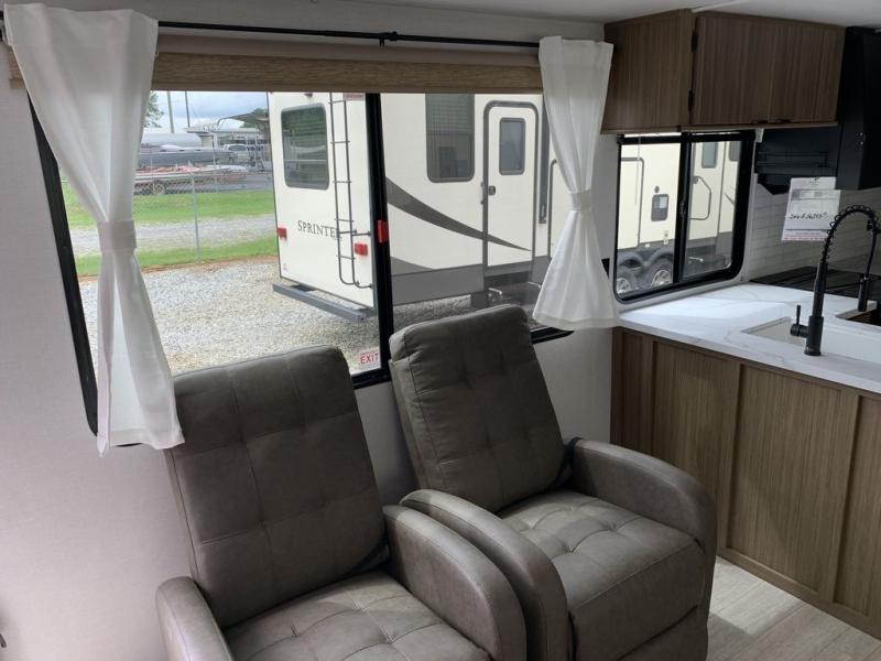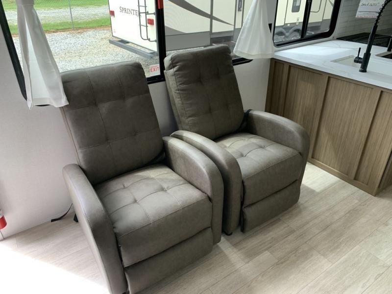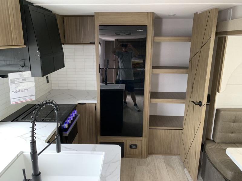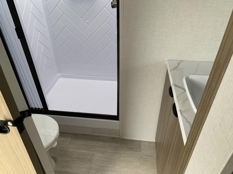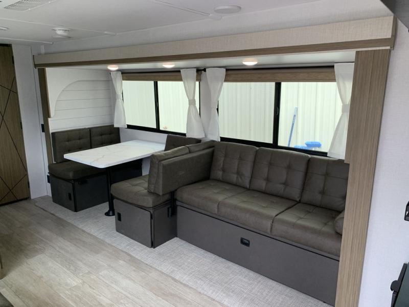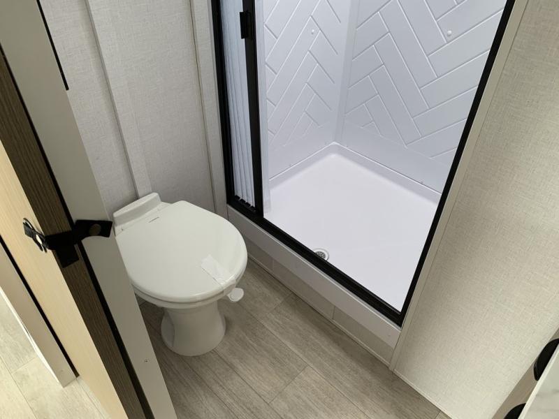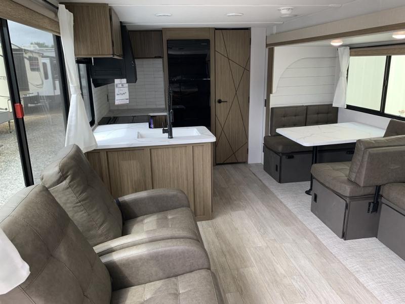 This Wildwood travel trailer is perfect for your family looking for a new adventure. You will enjoy the rear kitchen that includes a refrigerator and cooktop. The Versa-Lounge will provide comfortable seating and sleeping space, and the Versa Flex table gives you a space to dine and work if needed. This unit also includes two lounge chairs, so you'll feel right at home! You'll love the full bath in this unit, and the custom king bed with Versa-Tilt in the private bedroom is perfect for a good night's rest.