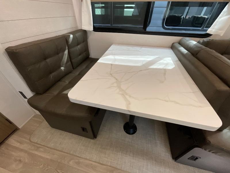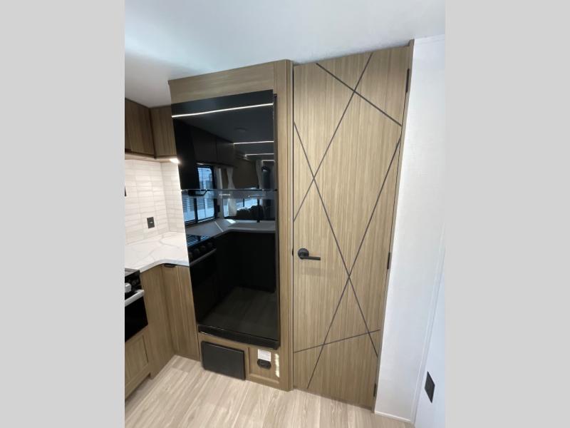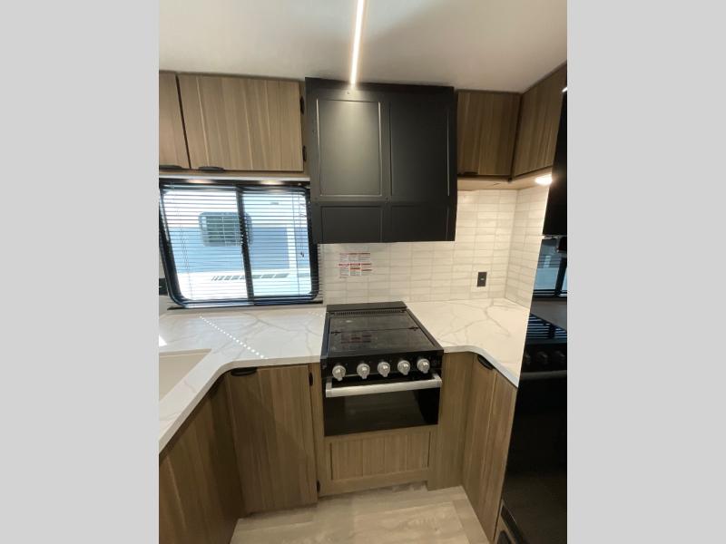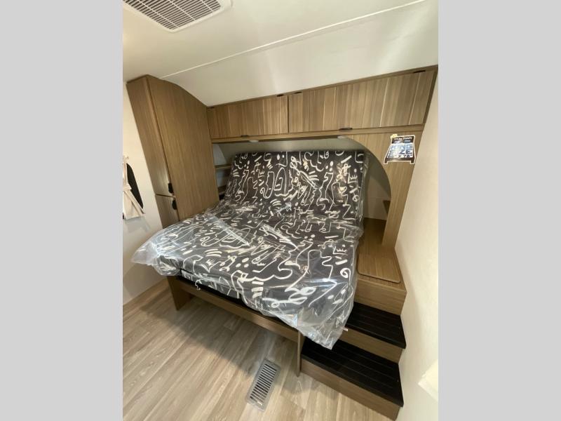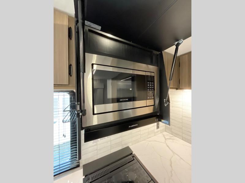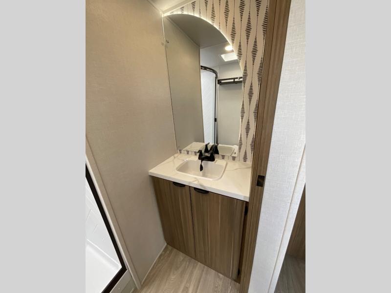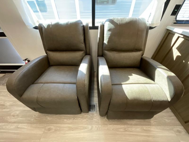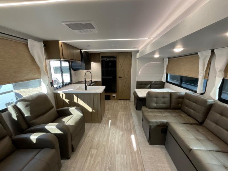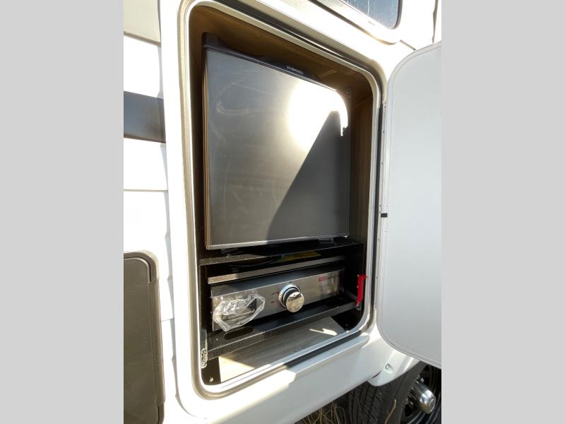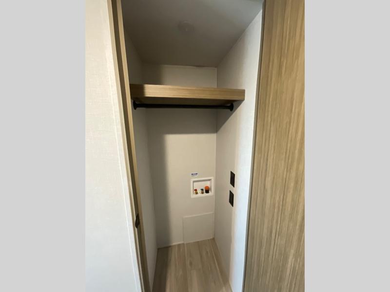 The large slide out in this travel trailer will give your crew more space to relax on the L-shaped sectional sofa, cook and dine at the kitchen island, and grab snacks from the hidden storage behind the hinged entertainment center! The full bath will let you clean up daily without having to use the camp's facilities, and the front private bedroom includes a custom king bed with Versa Tilt so you can read in bed at night. There is also a wardrobe and overhead cabinet plus a closet with washer and dryer prep if you choose to add these appliances.