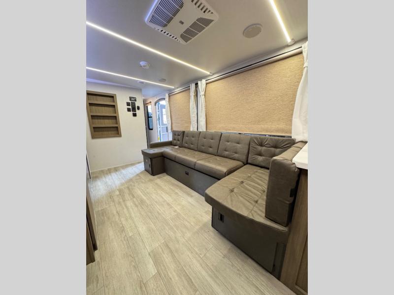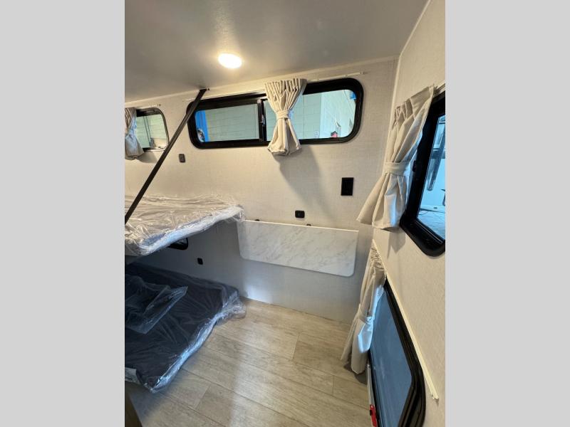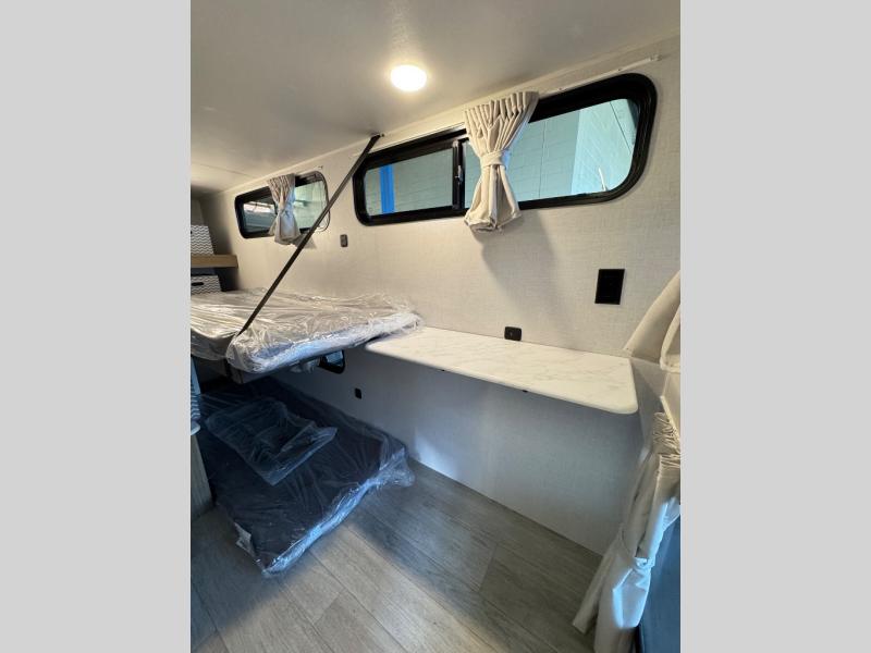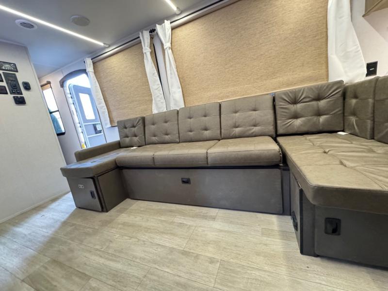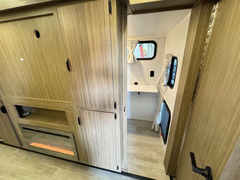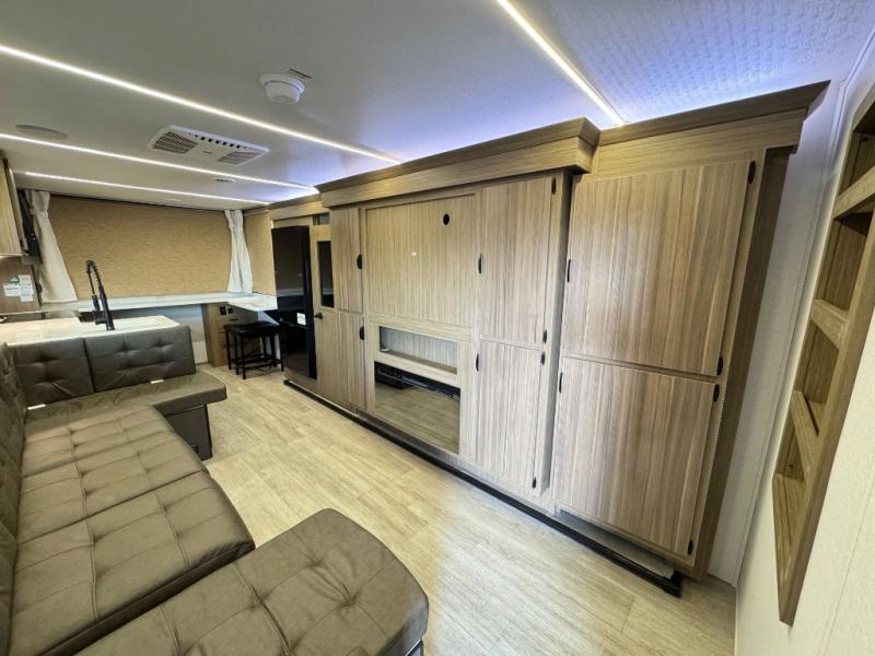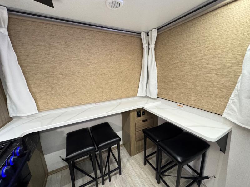 The large slide in this travel trailer is ultra versatile since it features a hidden bunkhouse within it, along with the refrigerator and pantry plus a desk. You are sure to appreciate the rear kitchen that includes wrap-around counter space and chairs, plus a flip-up desk if you need to get some work done. The full bath will let you clean up daily without having to use the camp's facilities, and the front private bedroom includes a custom king bed with Versa Tilt so you can read in bed at night. There is also a wardrobe and overhead cabinet plus a closet with washer and dryer prep if you choose to add these appliances.
