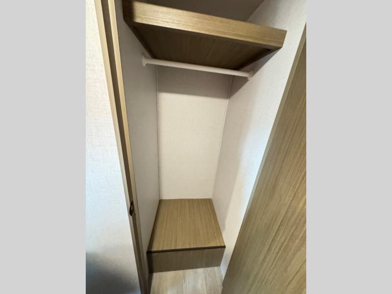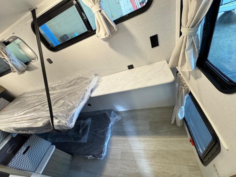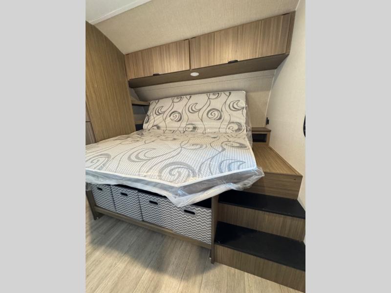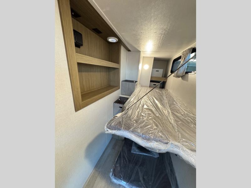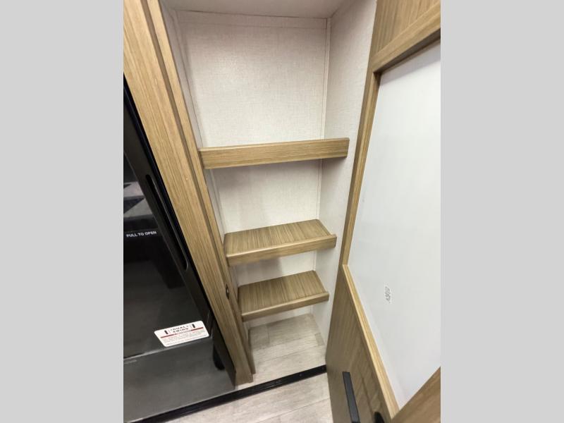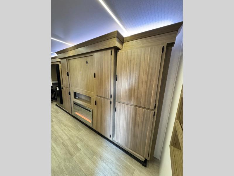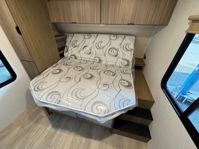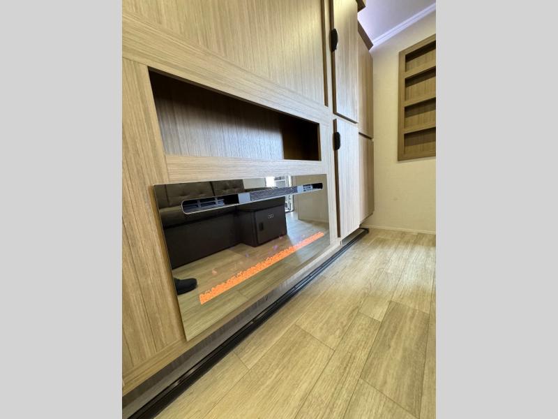 The large slide in this travel trailer is ultra versatile since it features a hidden bunkhouse within it, along with the refrigerator and pantry plus a desk. You are sure to appreciate the rear kitchen that includes wrap-around counter space and chairs, plus a flip-up desk if you need to get some work done. The full bath will let you clean up daily without having to use the camp's facilities, and the front private bedroom includes a custom king bed with Versa Tilt so you can read in bed at night. There is also a wardrobe and overhead cabinet plus a closet with washer and dryer prep if you choose to add these appliances.