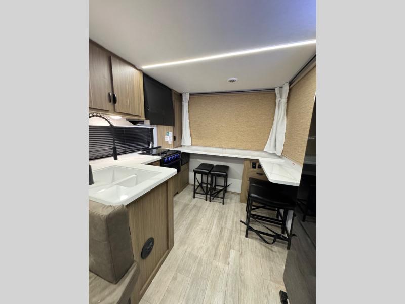 The Wildwood travel trailers are packed with hassle-free camping amenities! There are a variety of floorplans to choose from so you can find the layout that best fits your needs. The heated and enclosed Accessibelly will help protect against the elements and debris during transport, and the exterior retro/metal redesign is sure to be eye-catching! There are stylish roller shades inside, along with updated backsplash, elegant curtain rods and curtains, plus many more interior comforts! Choose a Wildwood travel trailer today for quality and value!