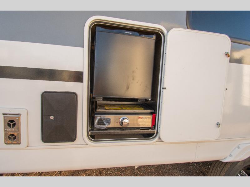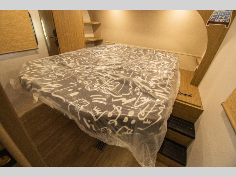 A spacious full bathroom allows you to clean up comfortably without relying on campground facilities. Up front, the private bedroom includes a custom king bed with Versa Tilt, making it easy to relax or read in bed. Storage is well thought out with a wardrobe, overhead cabinet, and a closet with washer and dryer prep for those planning extended trips.